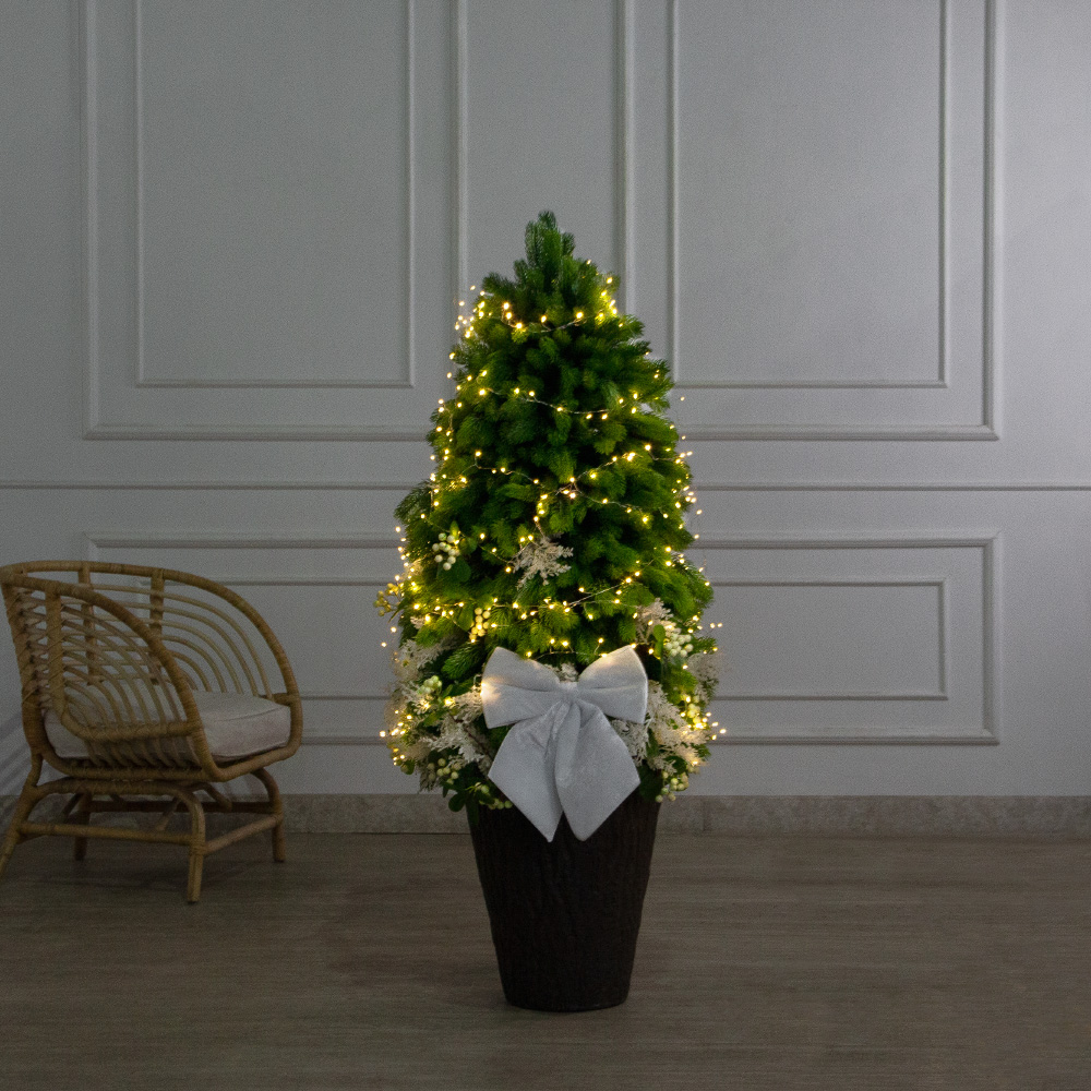 120/СВ03т/289-2(Пр)(Fix)(F) Ель искусственная h120см с белым декором и гирляндой Роса на основании