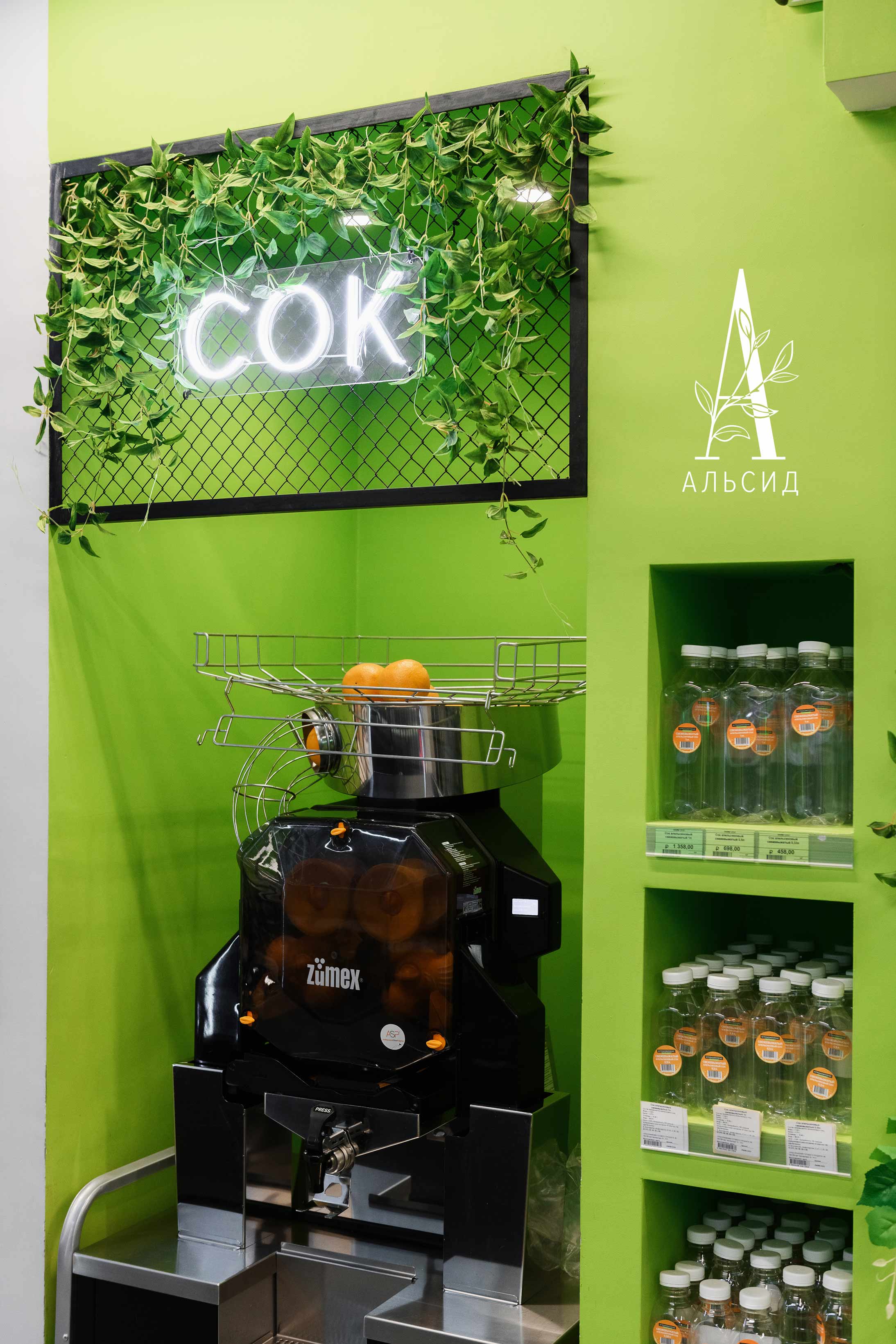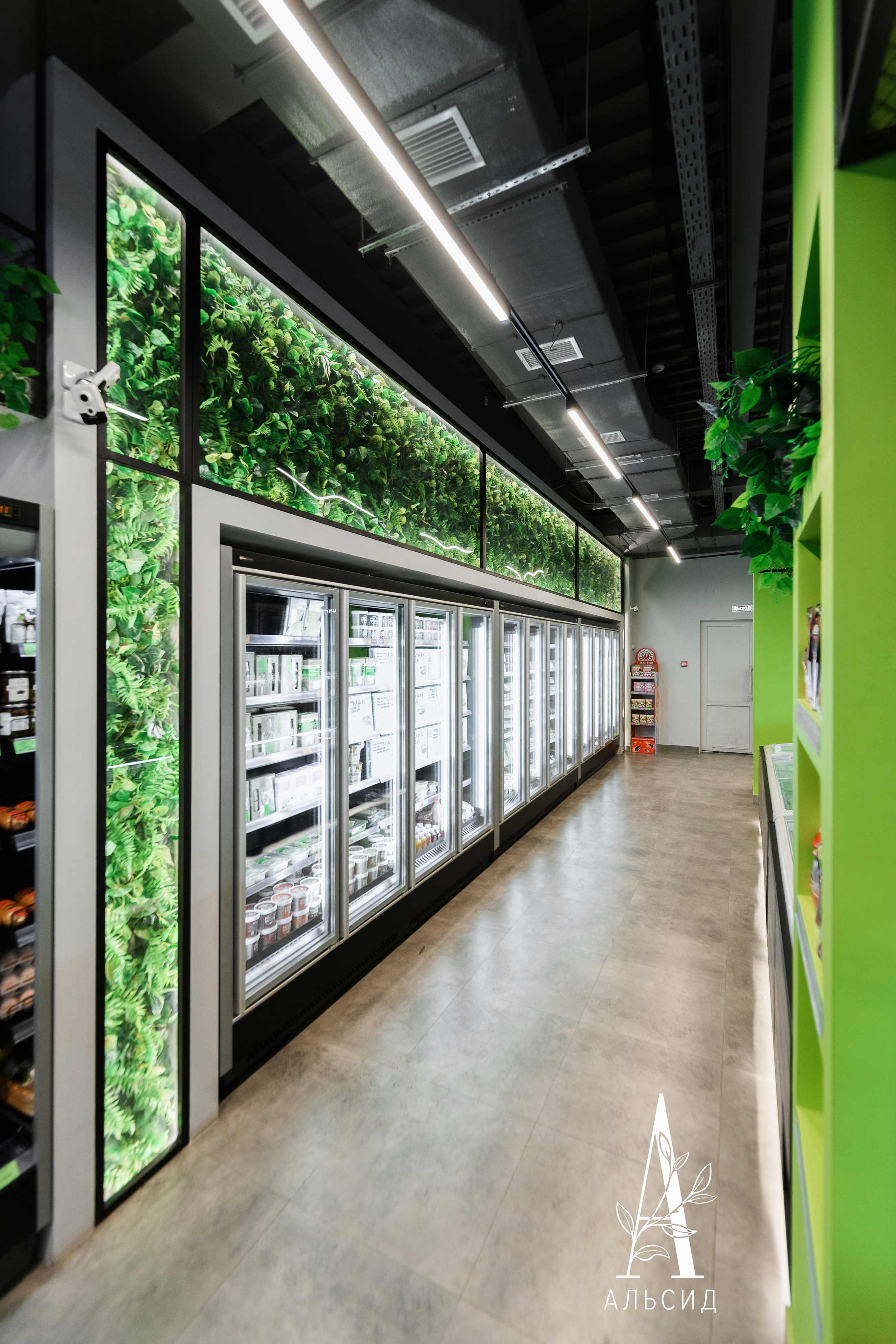 Зеленый декор как нельзя лучше подчеркивает натуральность и чистоту продуктов, поставляемых в продуктовые супермаркеты. Обширные фитомодули под стеклом, обрамленные подсветкой, создают ощущение глубины и естественности, а лиственные лианы с ампельными растениями поддерживают концепцию оформления магазина. Плющи (хедера, виноград и сциндапсус), обвиваясь вокруг продуктовых стендов и прилавков, также являются и элементом потолочного озеленения.