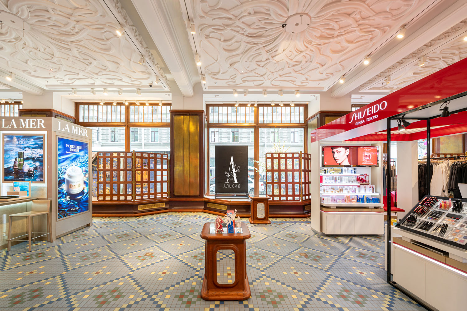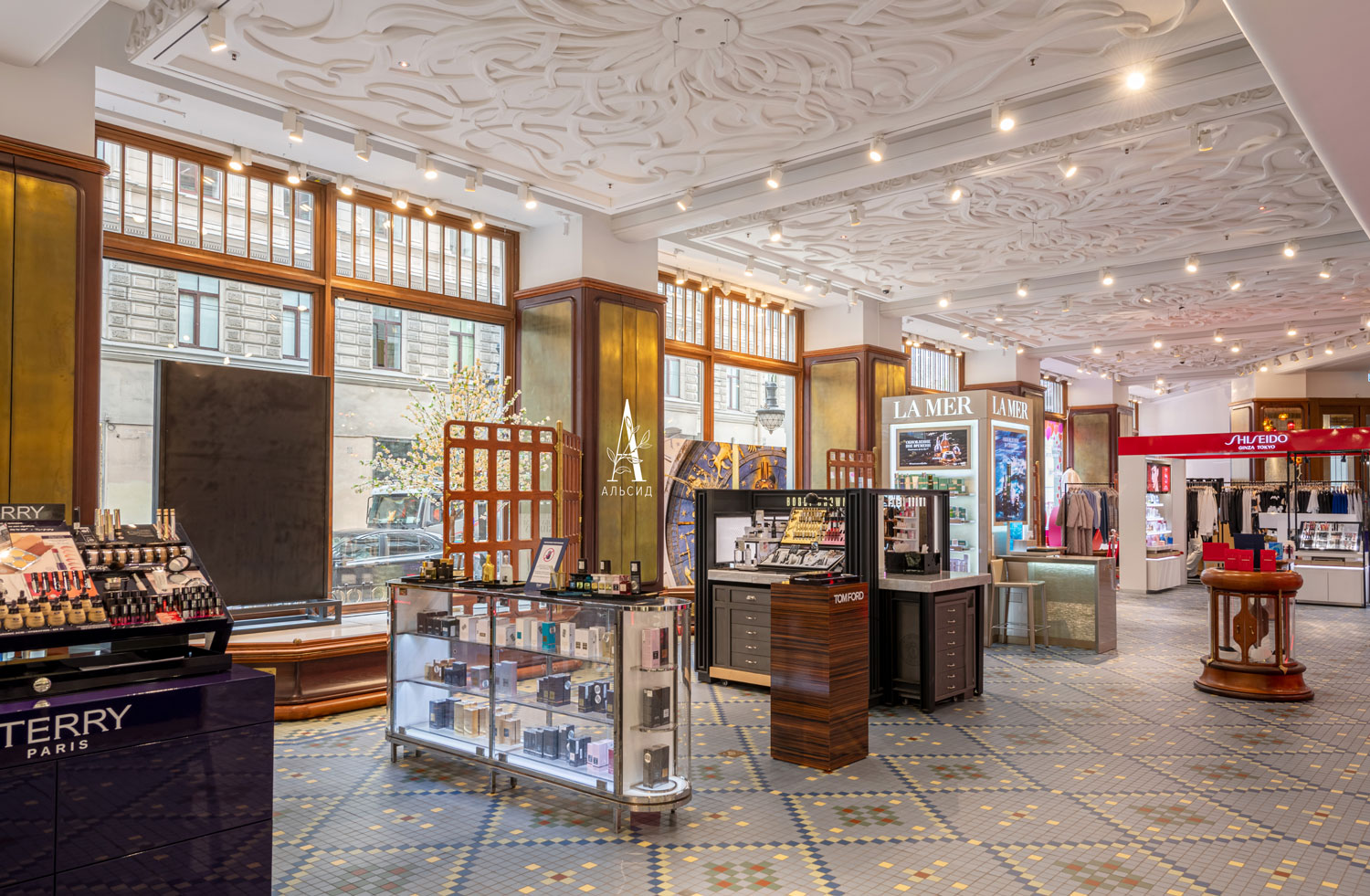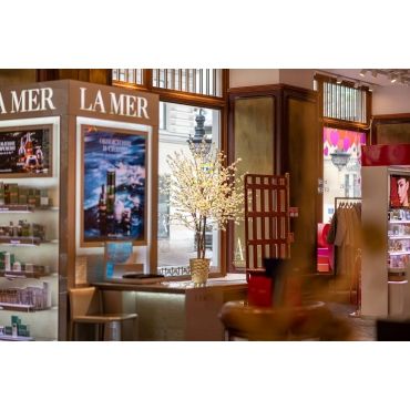 Витрины знаменитого универмага у Красного моста оформлены большими сакурами в дизайнерских кашпо, которые идеально сочетаются вместе с новой коллекцией парфюма Divina Terra, также представленной в витринах магазина.