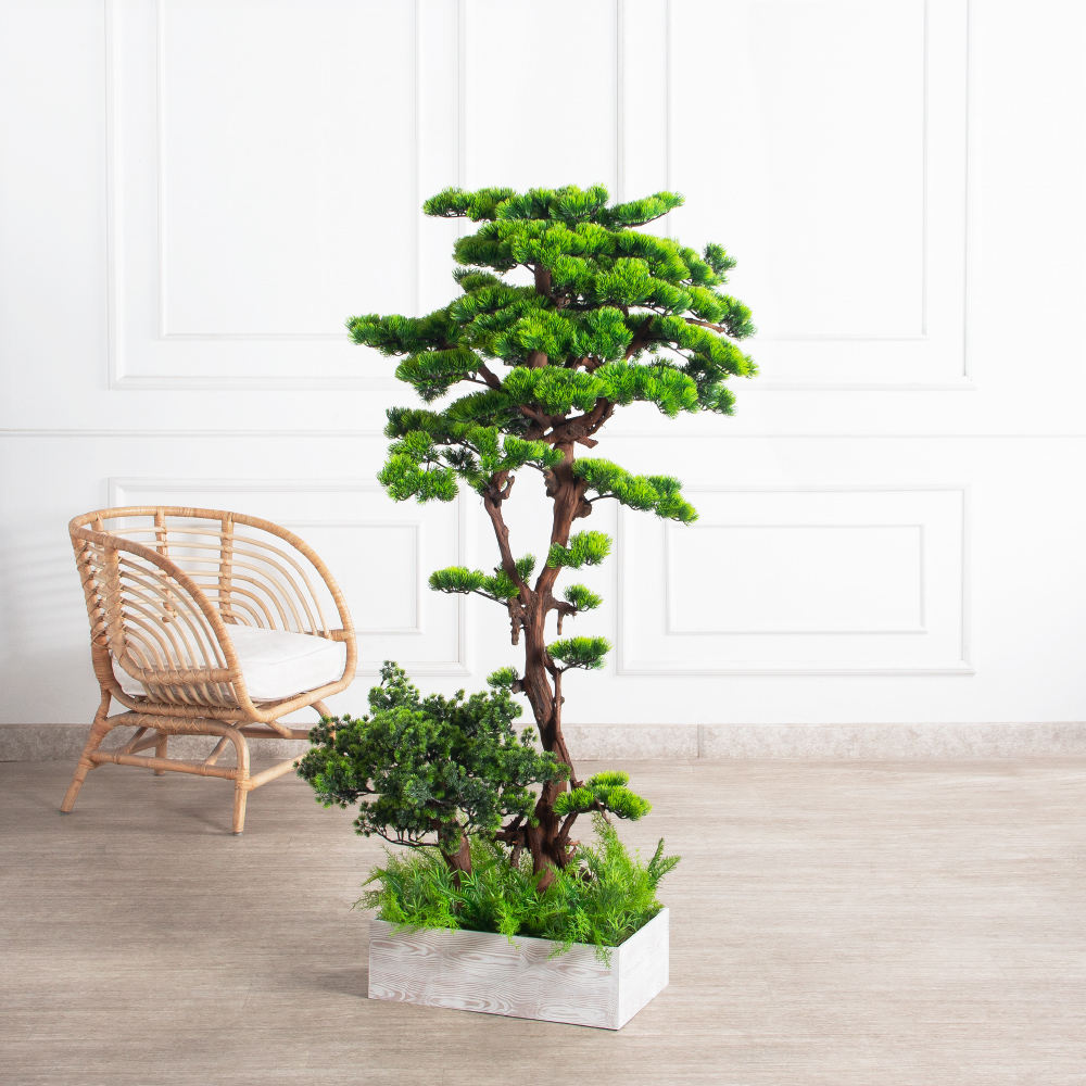 БС150/ОС/30-9(з)(Пр)(F) Бонсай искусственный Сосна h150 и 50см в деревянном ящике 50х30х15см