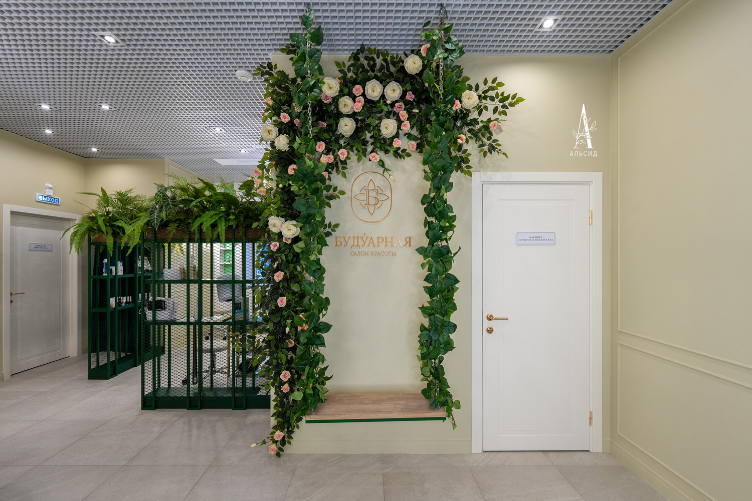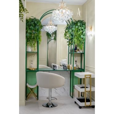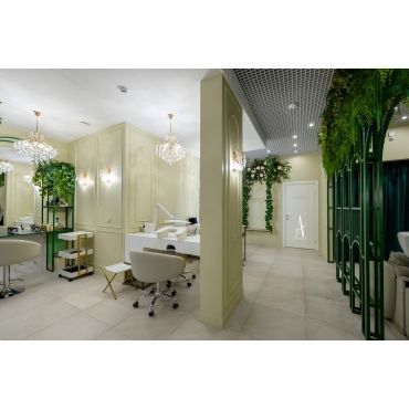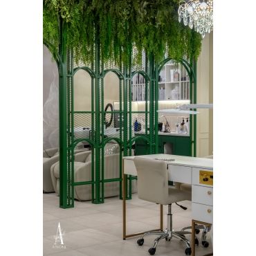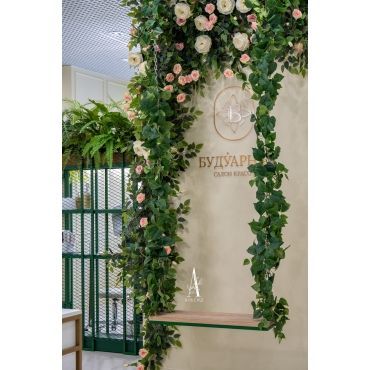 В роскошном салоне красоты со стильным и утончённым дизайном прекрасно вписались искусственные растения с апмельными свесами. Комплексное озеленение состояло из боксов, лиан, подвесного декора и штучных растений, украшающих фантазийные качели в фотоуголке. Кокосовые боксы с ампельными растениями, помещённые в ниши золотых стоек, дополняют парикмахерскую зону, а композиции с экзальтатой зонируют пространство зоны педикюра. Лиана со сциндапсусом обрамляет зеркало в кабинете эстетики лица и тела, дополняя изумрудный цвет стен. Композиция с папоротниками в подвесной коковите отлично обыграла пустой уголок в уборной комнате. Видоизменённая лиана с ампельными растениями обвивает с двух сторон декоративную арку в парикмахерской зоне, добавляя шарму всему пространству. Фотозона для гостей студии красоты украшена полуаркой, разработанной на основе цветочных лиан, а по цепям качелей спускается сциндапсус.