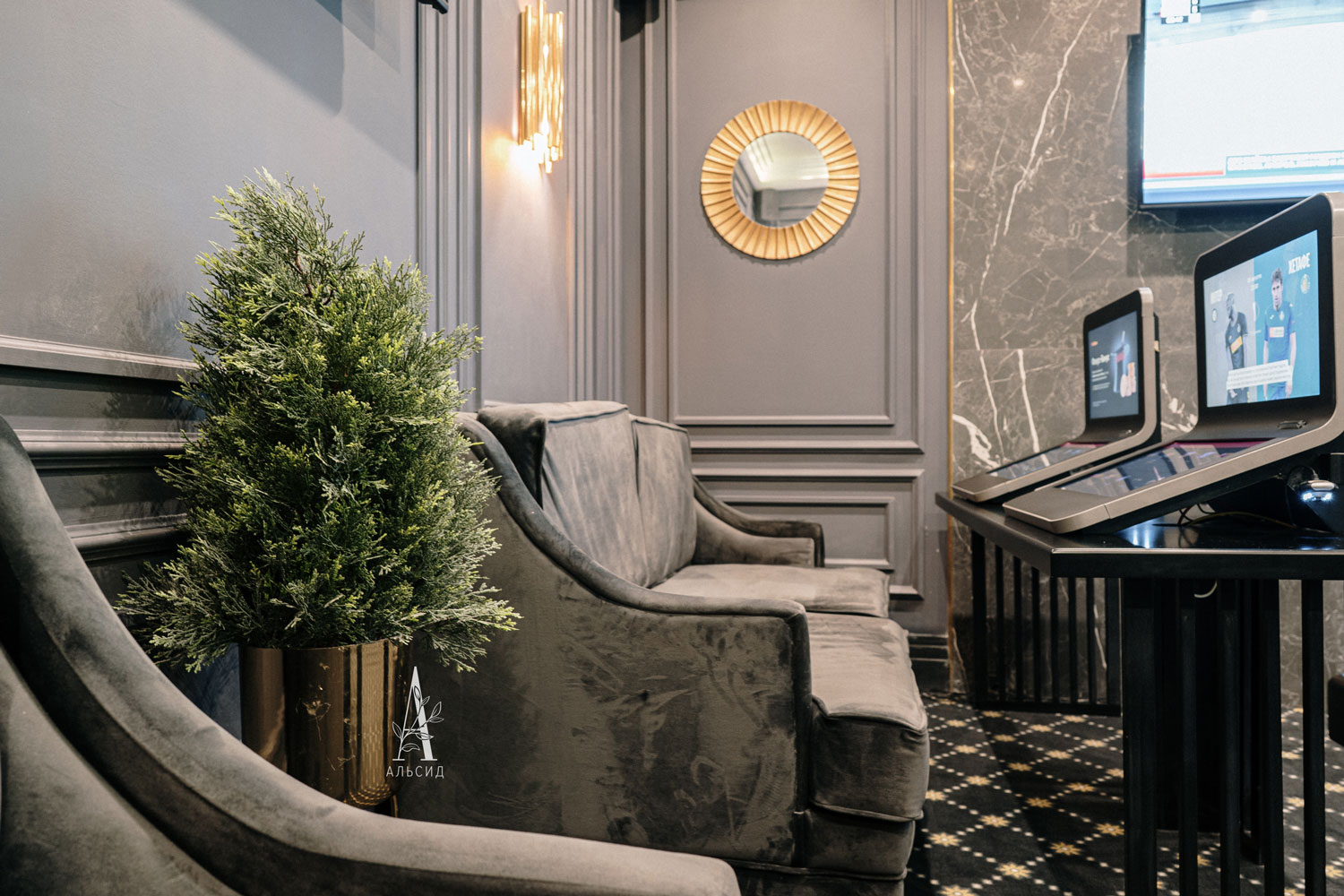 Любой интерьер, даже с полным искусственным освещением, можно озеленить. Ведь современные технологии позволяют создавать листья растений максимально приближенные к настоящим, при этом такие растения не требут особого ухода, что очень важно в современном ритме жизни. Лавр и туя изготовлены и сенсорного латекса премиального качества, что позволяет им вписаться в солидную обстановку.