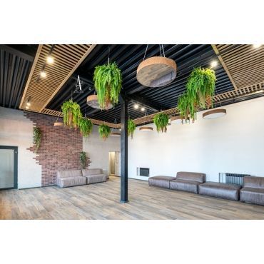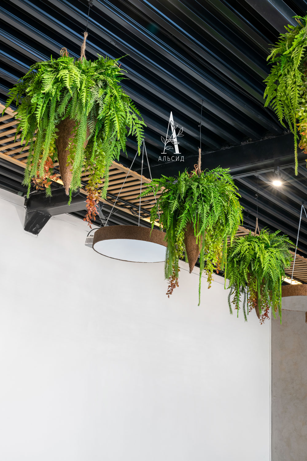 Частная школа "Путь к успеху" основывается на инновационном подходе к обучению с использованием авторских программ, где ученики развивают необходимые навыки, востребованные в современном бизнесе. Немаловажную роль в поддержании концепции играет среда, в которой находятся учащиеся. Поэтому в нестандартном для школы интерьере использованы композиции из искусственных растений на круглых и конусных подвесах, которые заполняют потолочное пространство в холле и на лестничной площадке. В коридоре и классах растения (папоротник, нефролепсис, сциндапсус, даксин, тилландсия, плющ, рускус) украшают стены и пегородку. Таким образом необычный интерьер помогает создать особенную вдохновляющую атмосферу.