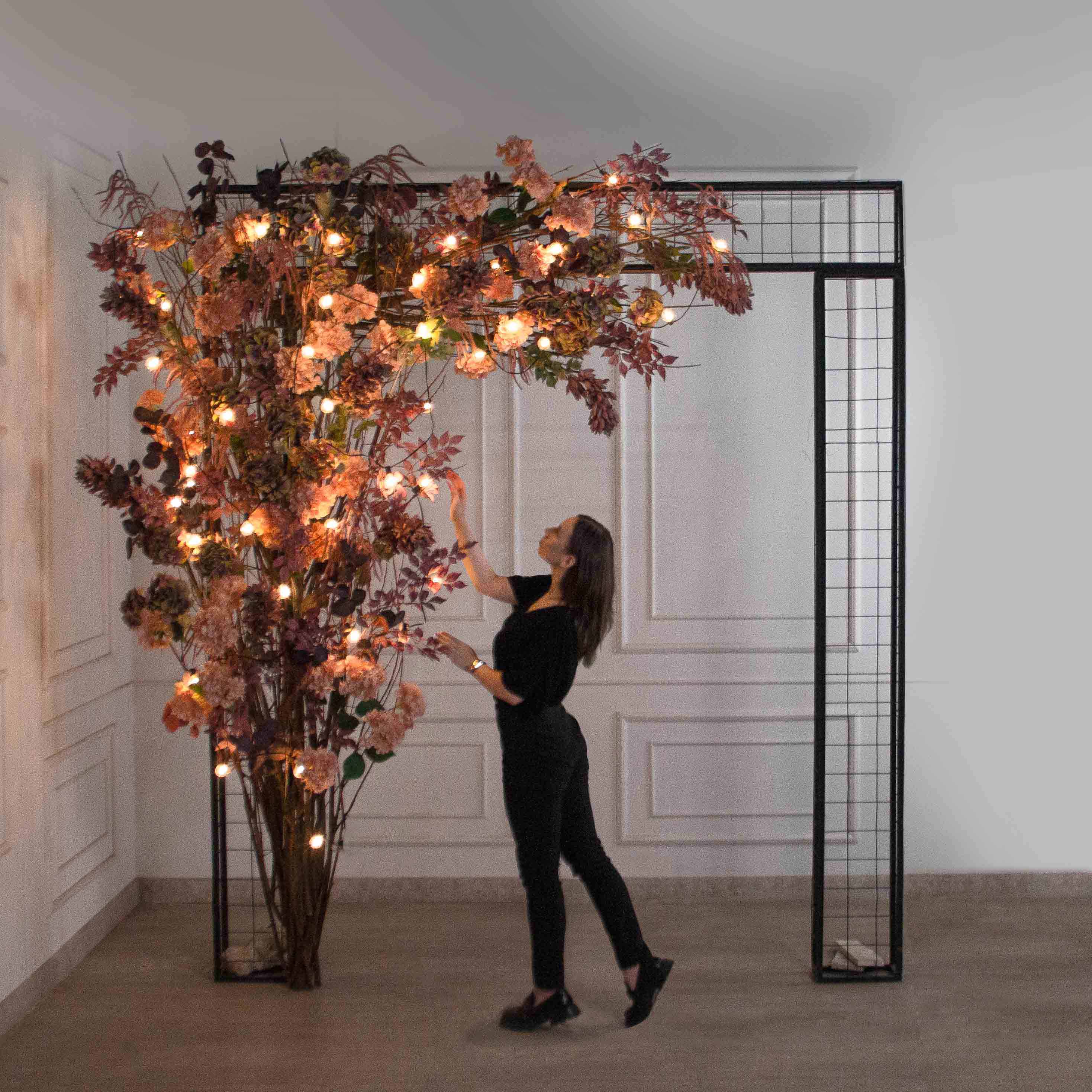 ДЛ177/СВ04(Пр)(Fix)(F) Декор вход,группы h300см на прутьях,пристен. с ретро- гирлян,пепельно-пурпур