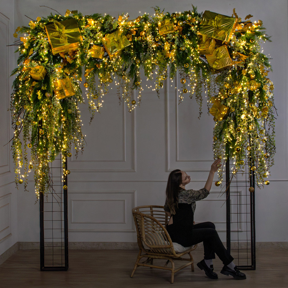 Внимание!Светодиодная гирлянда входит в стоимость изделия, но поставляется отдельно от композиции, в отдельной упаковке. В композиции использованы 2шт гирлянды по 20м. При самостоятельном монтаже Вам необходимо равномерно распределить гирлянду по композиции, ориентируясь на фото изделия на сайте. Также Вы всегда можете заказать у нас дополнительную услугу по монтажу изделия. При помощи наших мастеров Ваша входная зона мгновенно преобразится и засияет!
