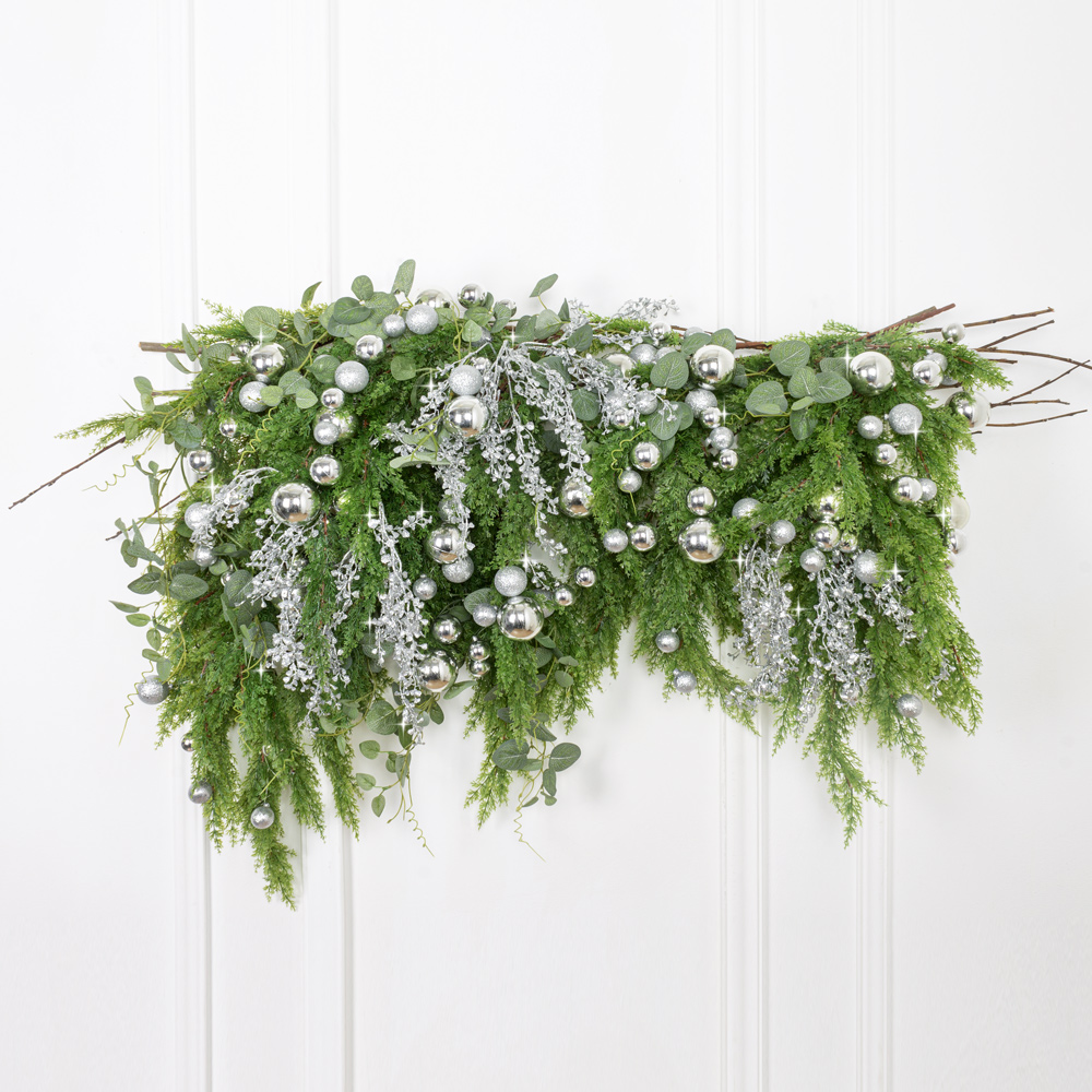 ДЛ96-2(Пр) Декор входной группы из туи с серебр. ветками и шарами L100см на прутьях, пристенный