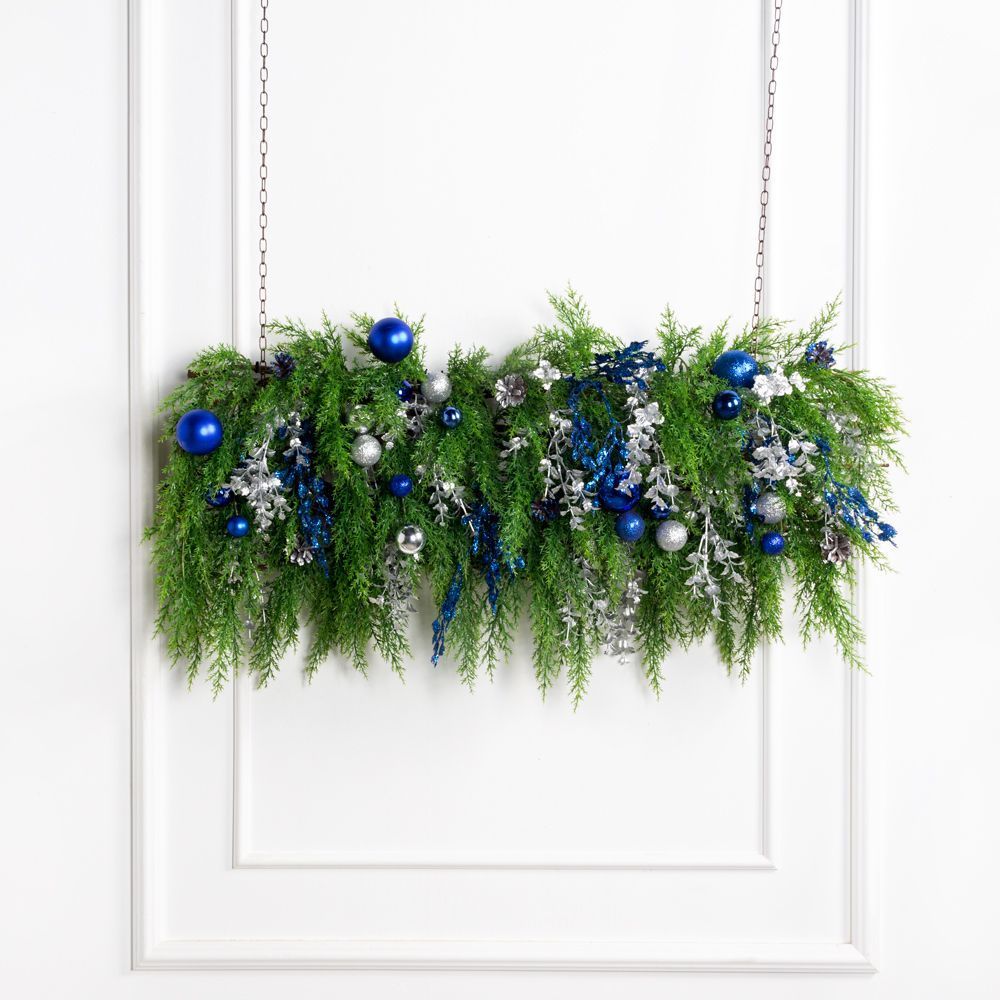 ДЛ96-4(Пр)(F) Декор входной группы из туи с декор. ветками и шарами L100см, пристенный, серебристо-синий