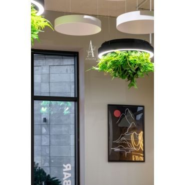 Для высоких потолков идеально подходят светильники с искусственными растениями. Можно использовать как ампельные, чтобы заполнить пространство в длину, так и обычные виды растений, чтобы сделать более широкие композиции для вставки.