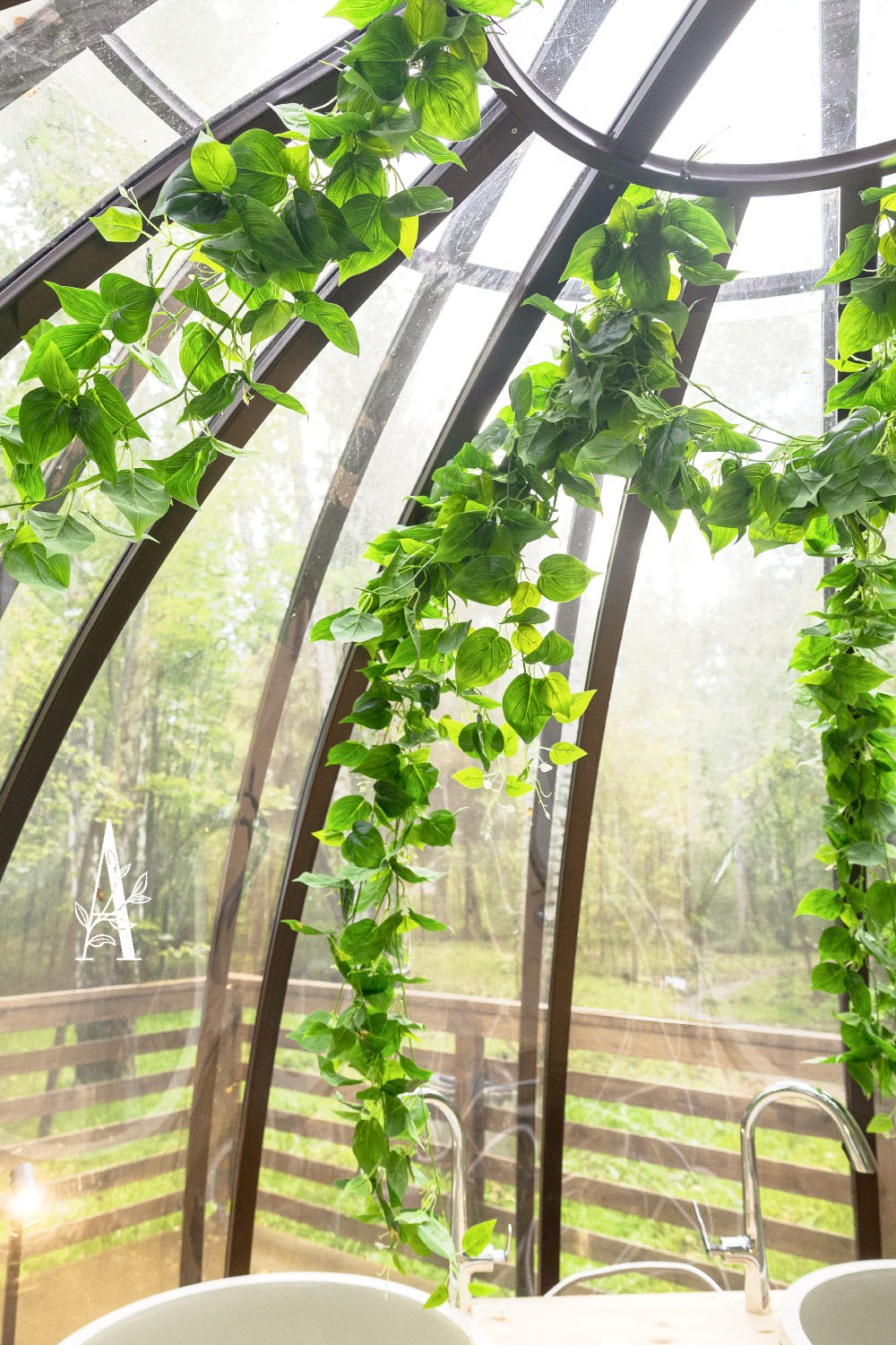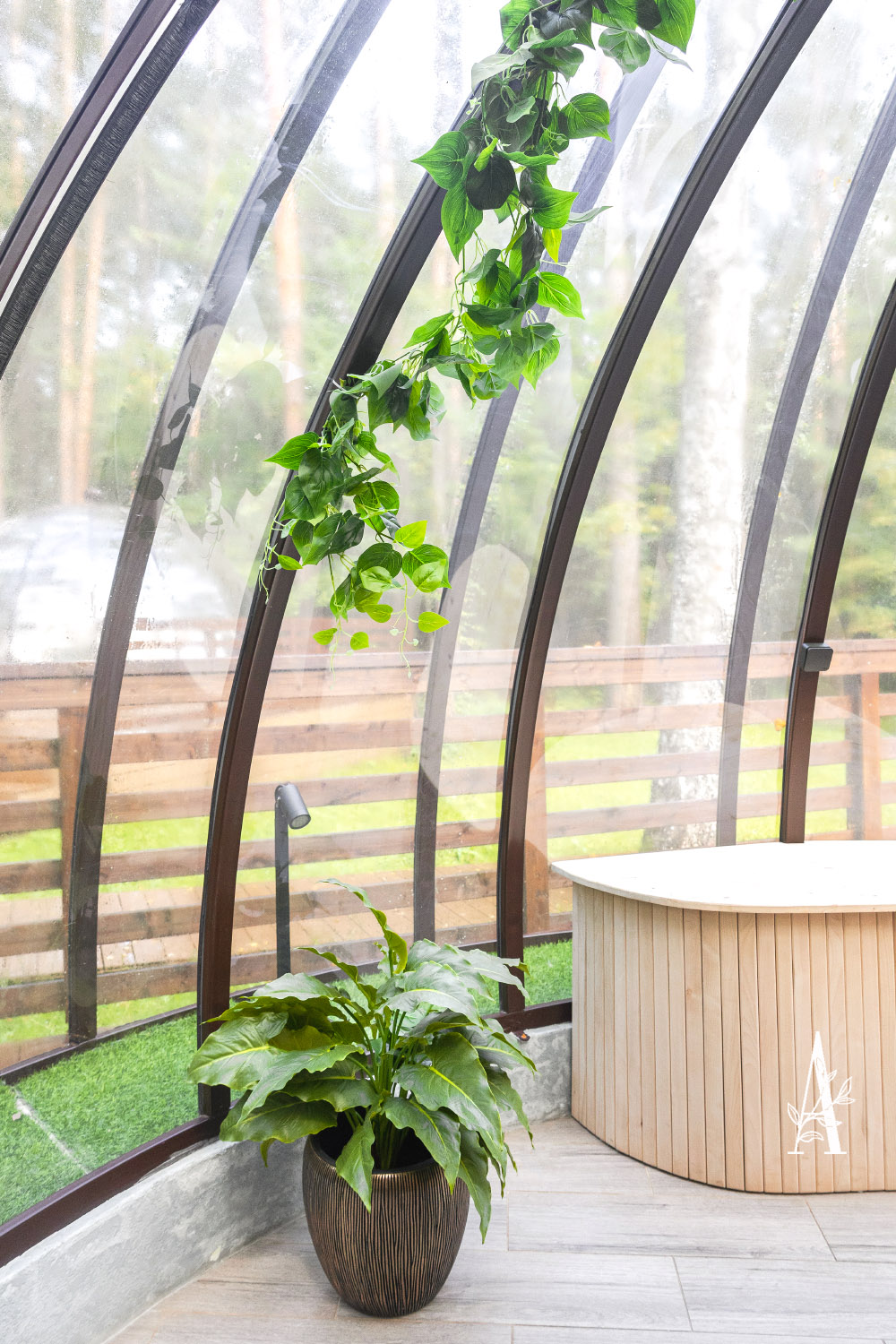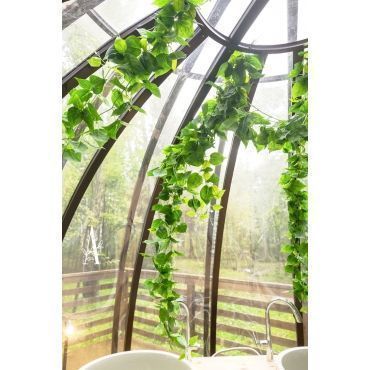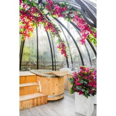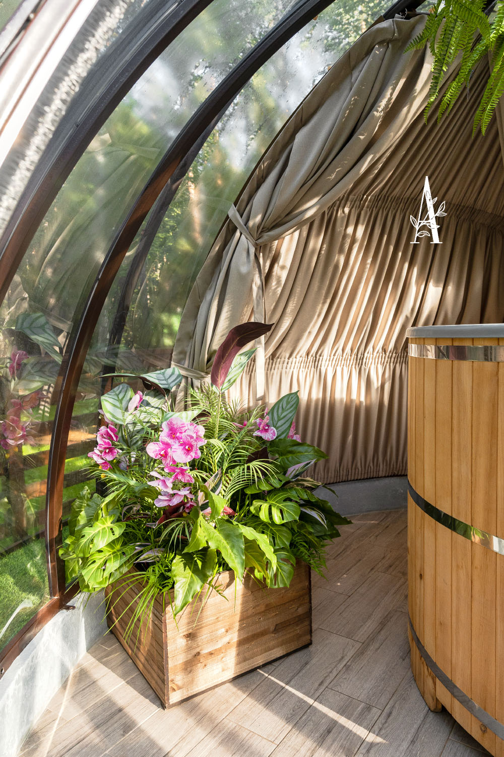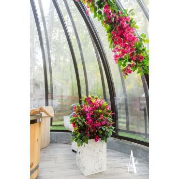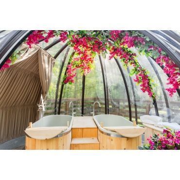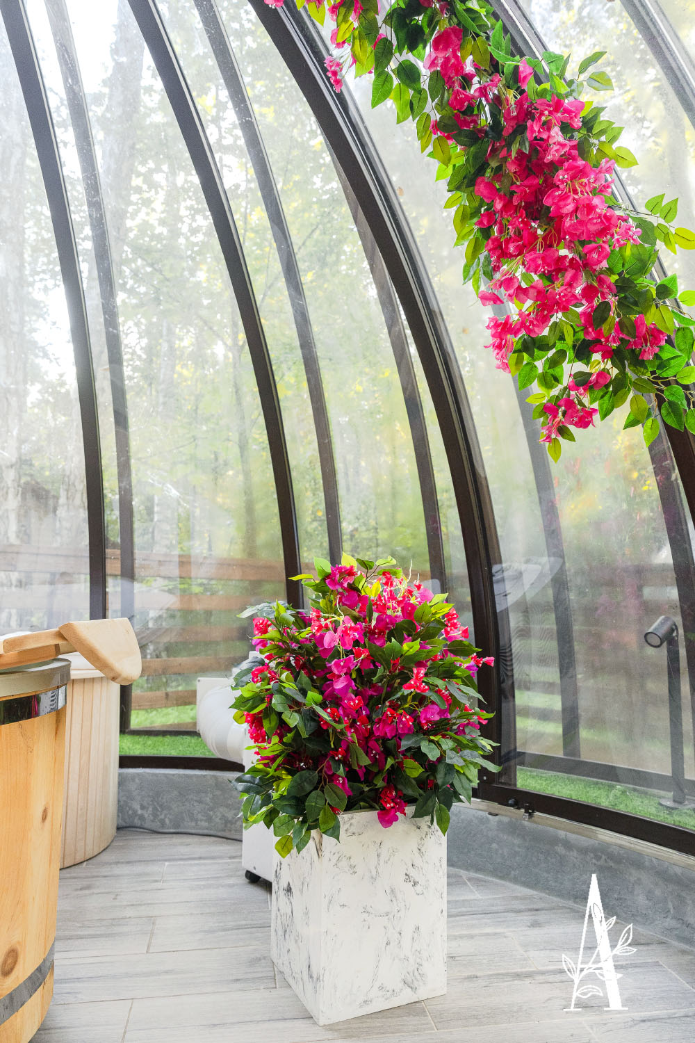 Гармоничное и спокойное пространство под прозрачными куполами в лесных массивах - отличное место для релаксации и восстановления сил.Чтобы добавить ему больше антуража и уюта были изготовлены и развешены на купольном каркасе зеленые лианы,которые придают больше природных отголосков простравнству. Цветочные лианы из бугенвиллии добавляют месту больше красок и создают романтичное настроение.Чтобы разнообразить зону отдыха вокруг ванн были выбраны:нежная лесная композиция из кампанулы в одном куполе и куст сирени в другом. Для оформления в одном из мест отдыха также была задействована кустовая пальма, придающая тепла и ассоциаций с жаркими странами. В довершении к декорированию глемпинга в стиле теплых стран были подобраны тропическая лиана и яркая композиция с орхидеей и листьями пальм.