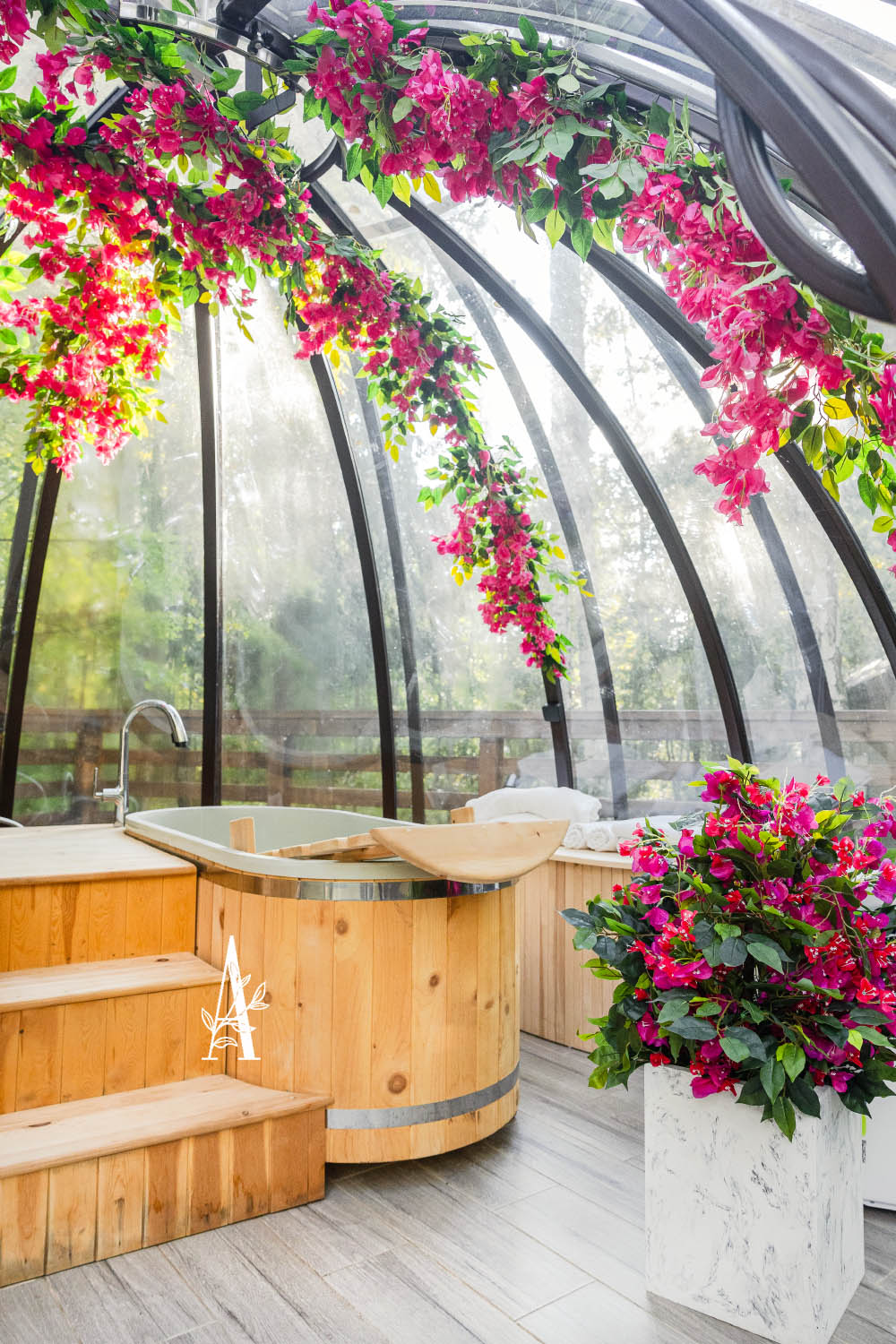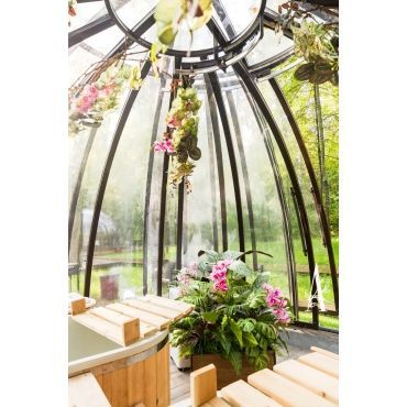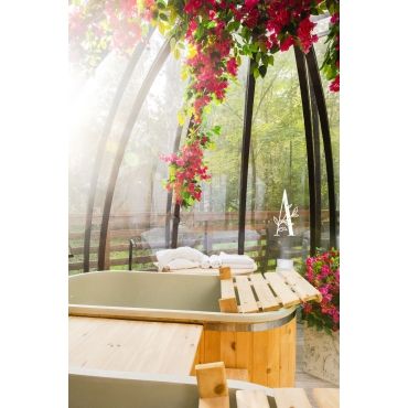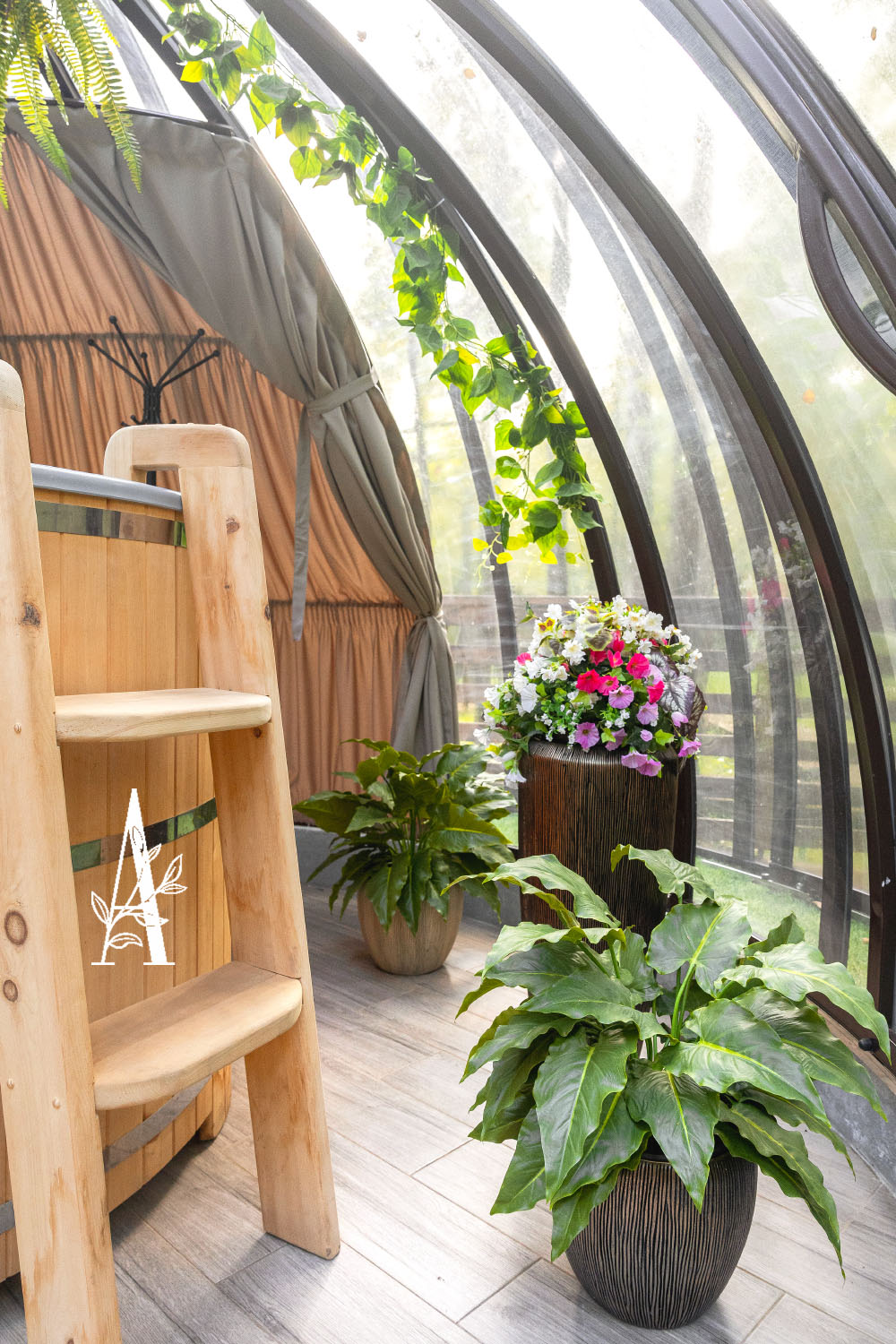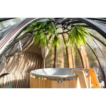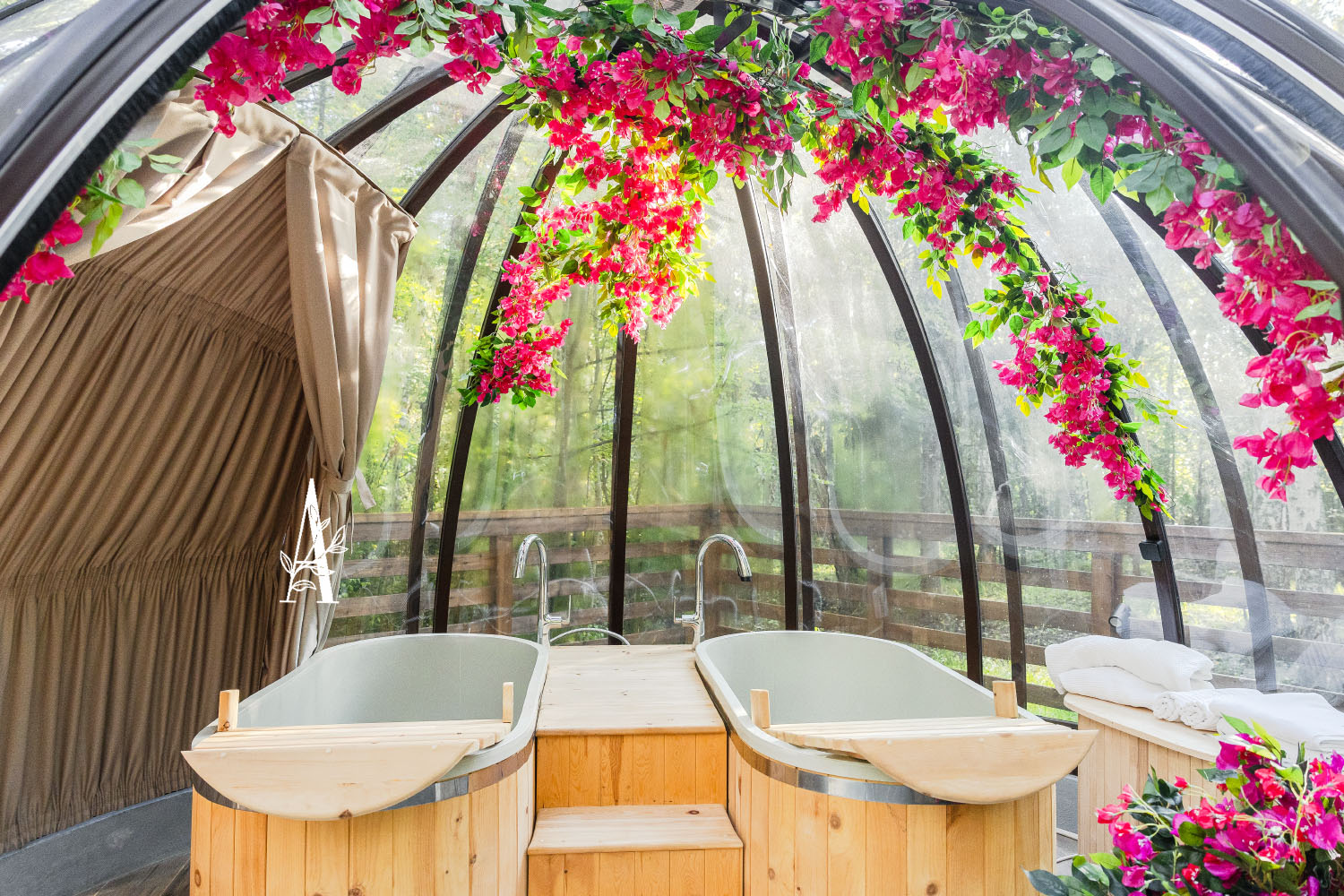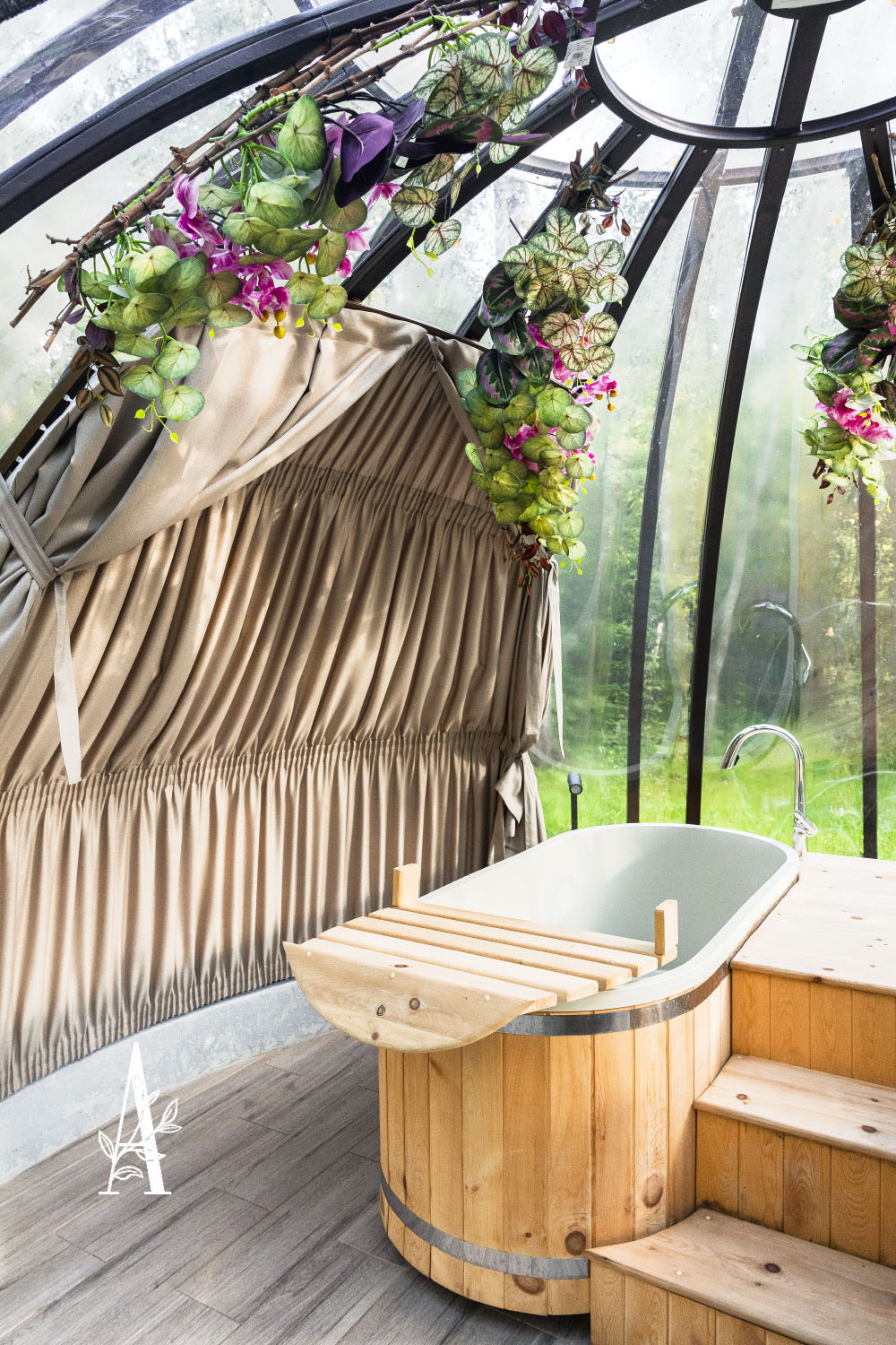 Гармоничное и спокойное пространство под прозрачными куполами в лесных массивах - отличное место для релаксации и восстановления сил.Чтобы добавить ему больше антуража и уюта были изготовлены и развешены на купольном каркасе зеленые лианы,которые придают больше природных отголосков простравнству. Цветочные лианы из бугенвиллии добавляют месту больше красок и создают романтичное настроение.Чтобы разнообразить зону отдыха вокруг ванн были выбраны:нежная лесная композиция из кампанулы в одном куполе и куст сирени в другом. Для оформления в одном из мест отдыха также была задействована кустовая пальма, придающая тепла и ассоциаций с жаркими странами. В довершении к декорированию глемпинга в стиле теплых стран были подобраны тропическая лиана и яркая композиция с орхидеей и листьями пальм.