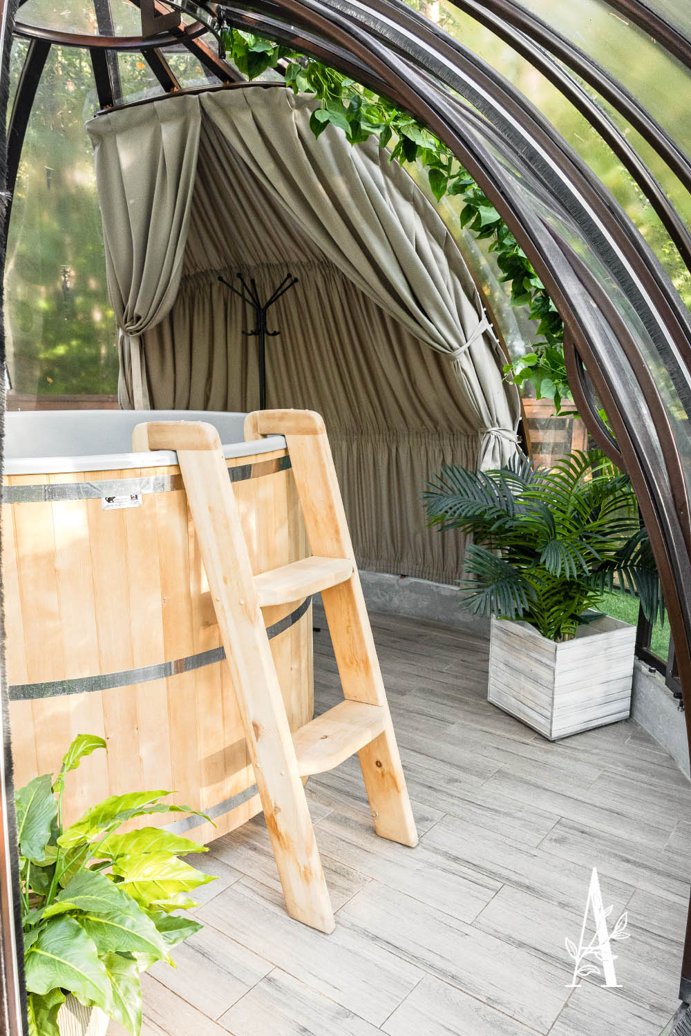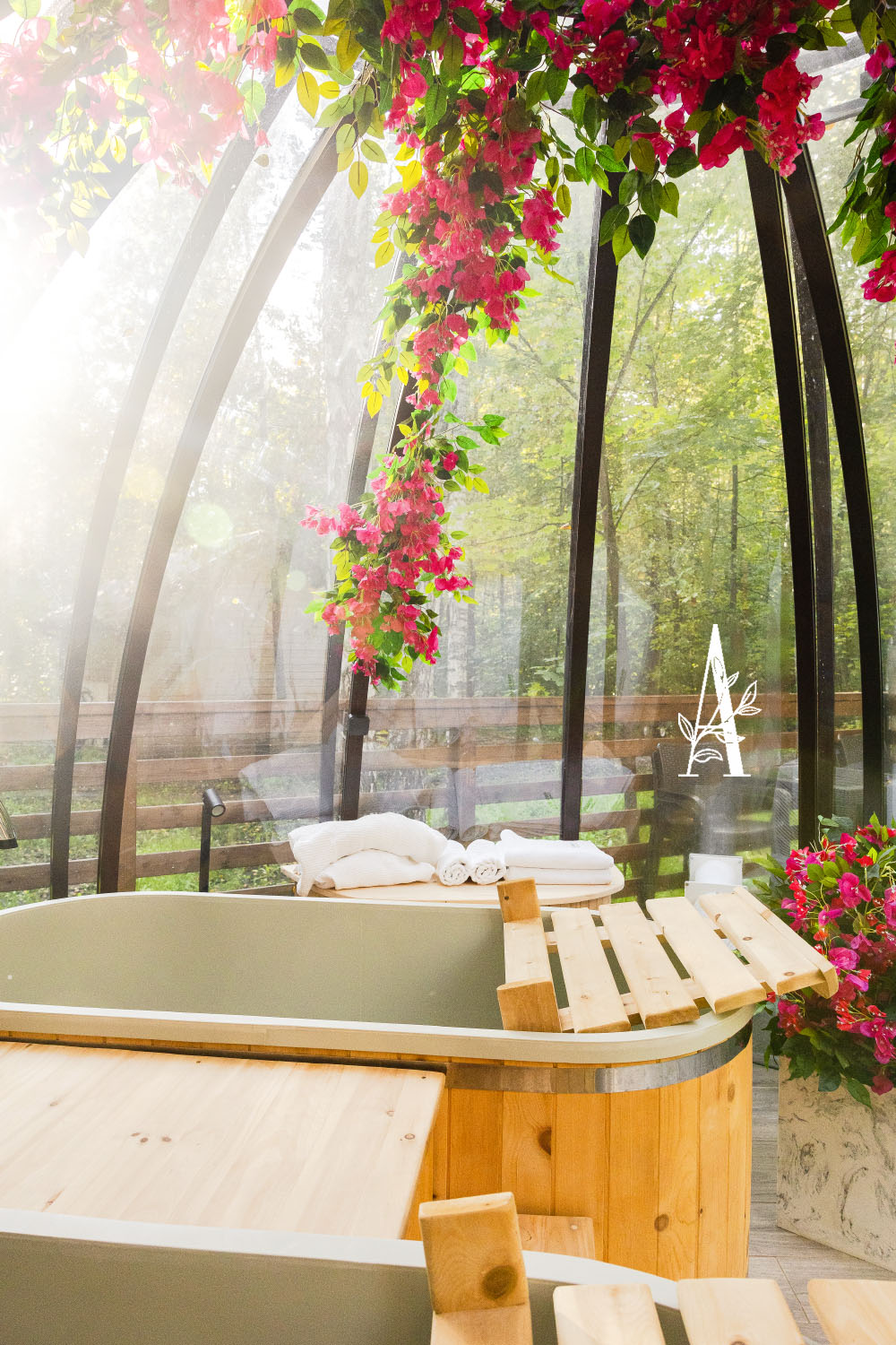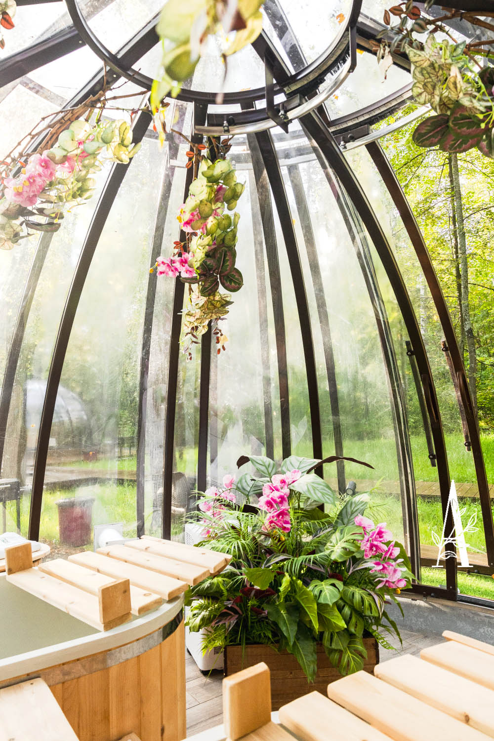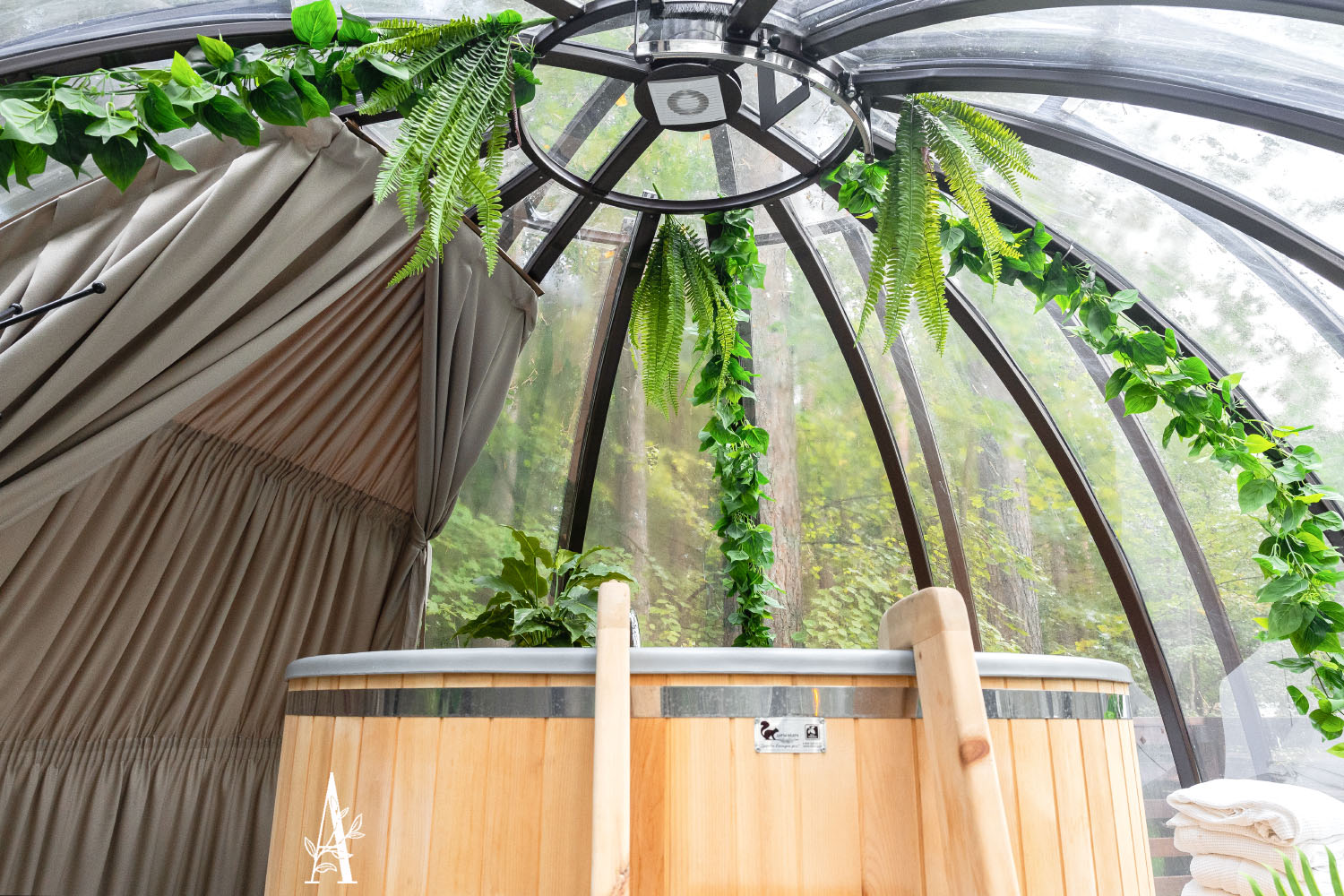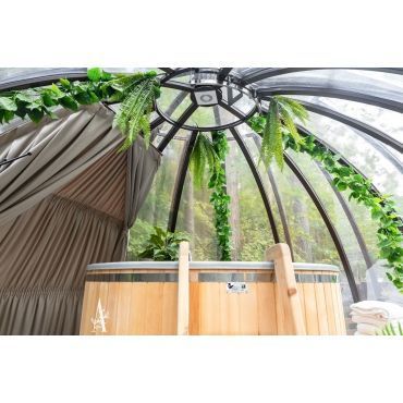 Гармоничное и спокойное пространство под прозрачными куполами в лесных массивах - отличное место для релаксации и восстановления сил.Чтобы добавить ему больше антуража и уюта были изготовлены и развешены на купольном каркасе зеленые лианы,которые придают больше природных отголосков простравнству. Цветочные лианы из бугенвиллии добавляют месту больше красок и создают романтичное настроение.Чтобы разнообразить зону отдыха вокруг ванн были выбраны:нежная лесная композиция из кампанулы в одном куполе и куст сирени в другом. Для оформления в одном из мест отдыха также была задействована кустовая пальма, придающая тепла и ассоциаций с жаркими странами. В довершении к декорированию глемпинга в стиле теплых стран были подобраны тропическая лиана и яркая композиция с орхидеей и листьями пальм.