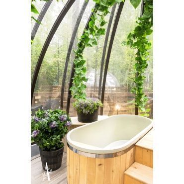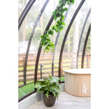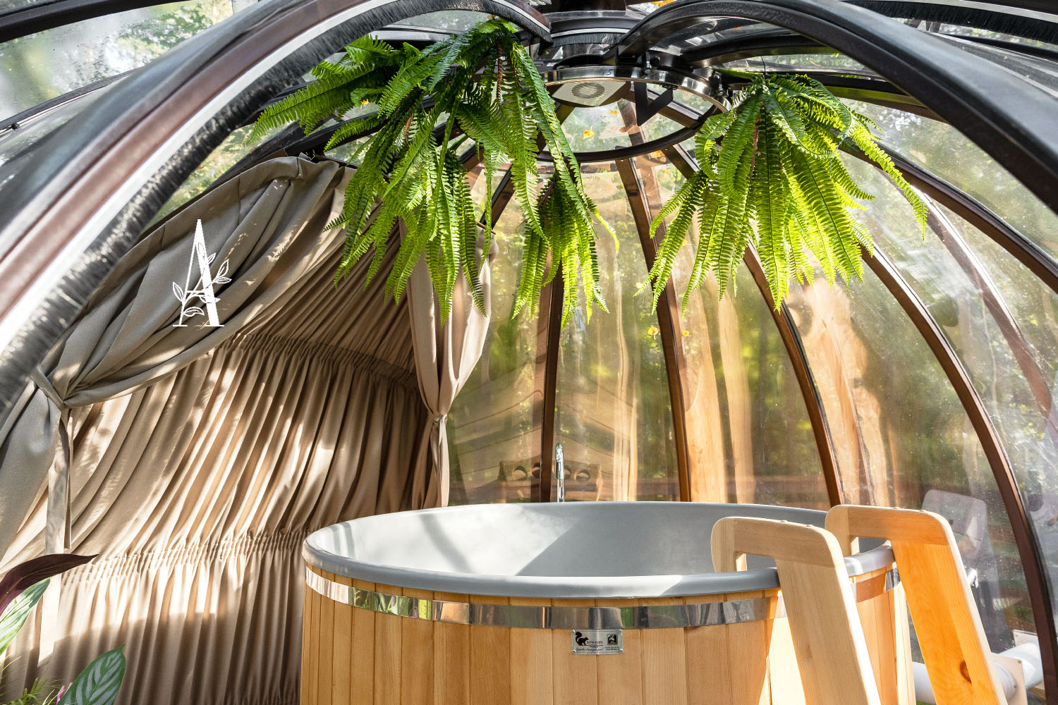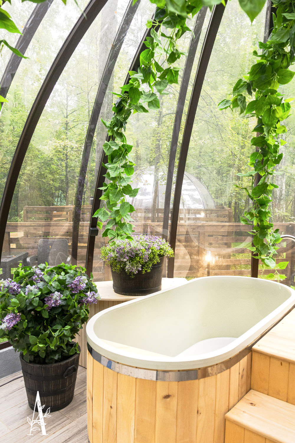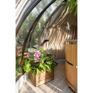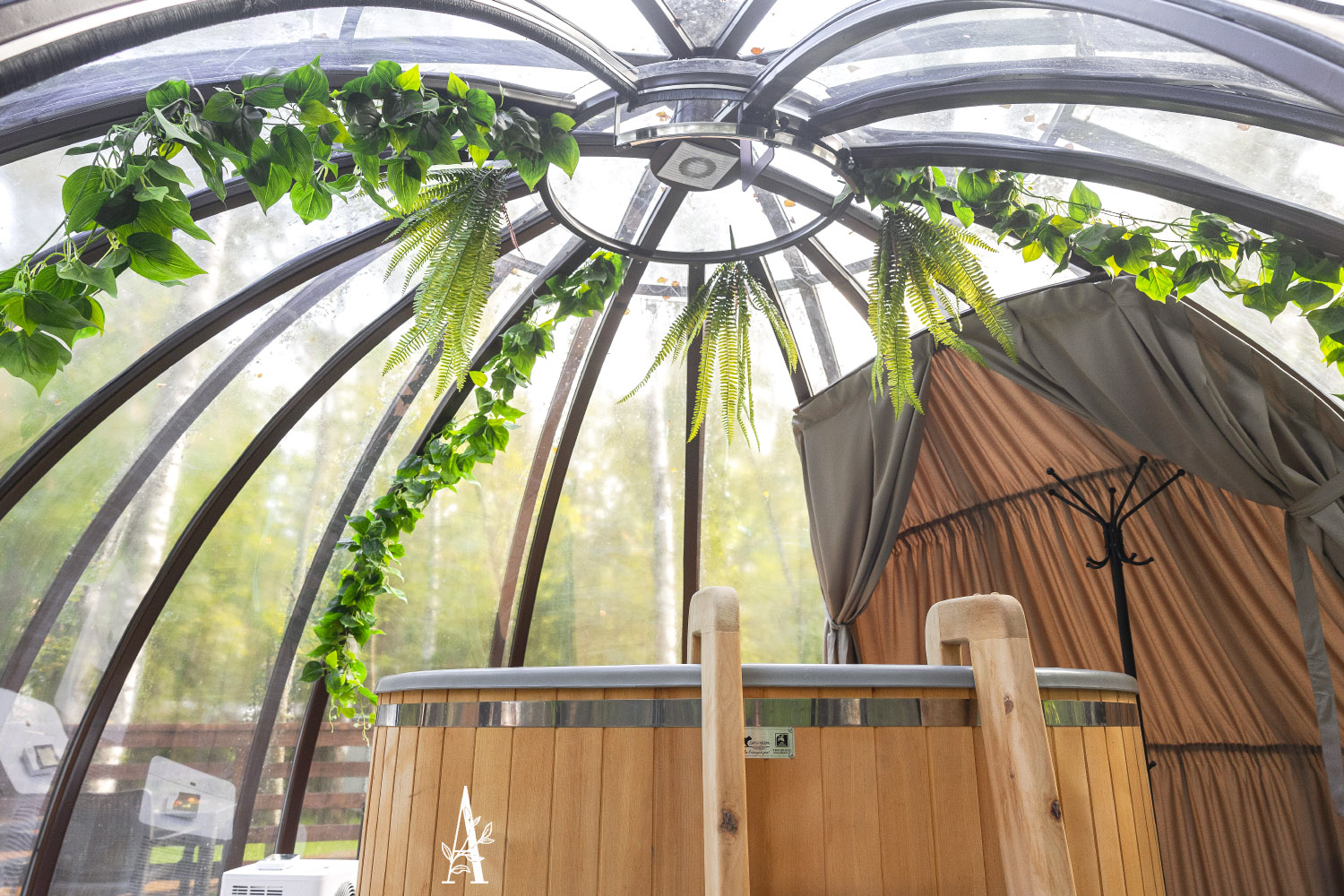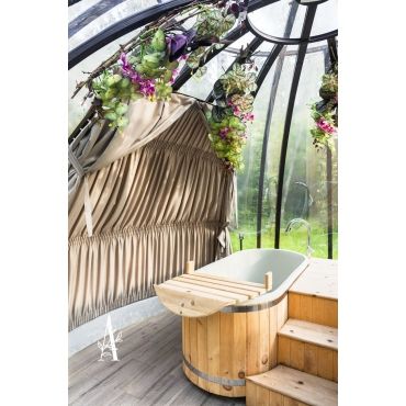 Гармоничное и спокойное пространство под прозрачными куполами в лесных массивах - отличное место для релаксации и восстановления сил.Чтобы добавить ему больше антуража и уюта были изготовлены и развешены на купольном каркасе зеленые лианы,которые придают больше природных отголосков простравнству. Цветочные лианы из бугенвиллии добавляют месту больше красок и создают романтичное настроение.Чтобы разнообразить зону отдыха вокруг ванн были выбраны:нежная лесная композиция из кампанулы в одном куполе и куст сирени в другом. Для оформления в одном из мест отдыха также была задействована кустовая пальма, придающая тепла и ассоциаций с жаркими странами. В довершении к декорированию глемпинга в стиле теплых стран были подобраны тропическая лиана и яркая композиция с орхидеей и листьями пальм.
