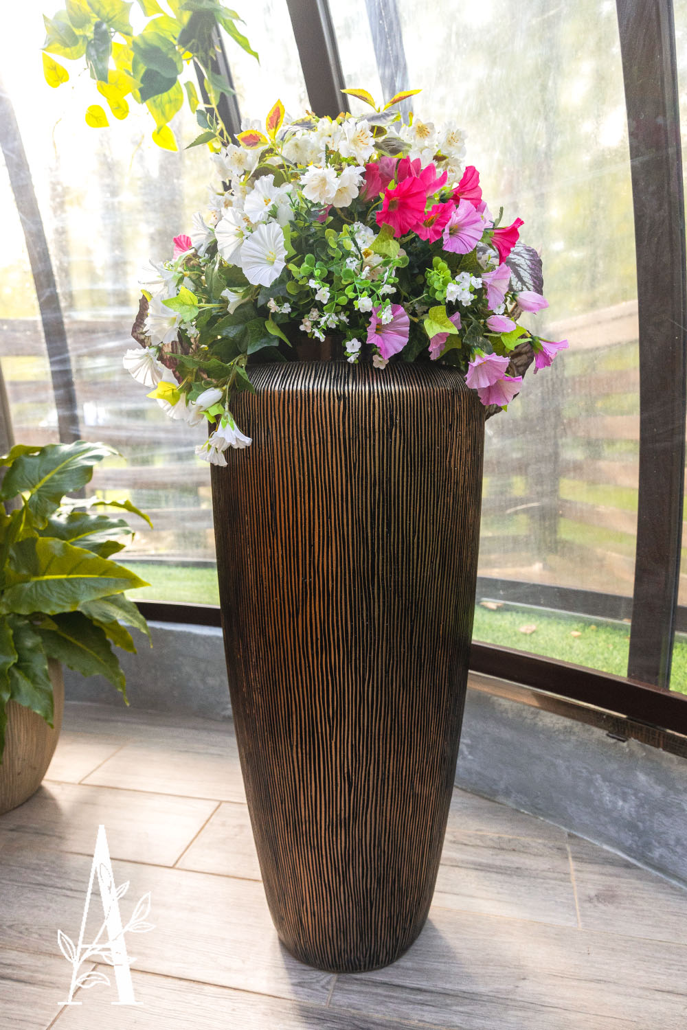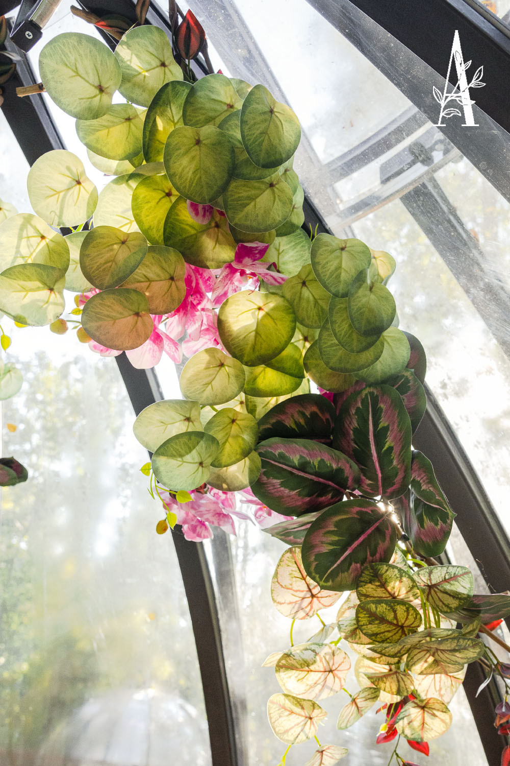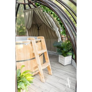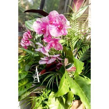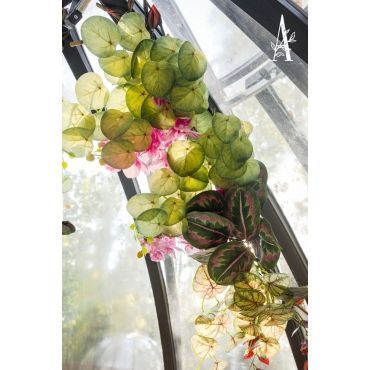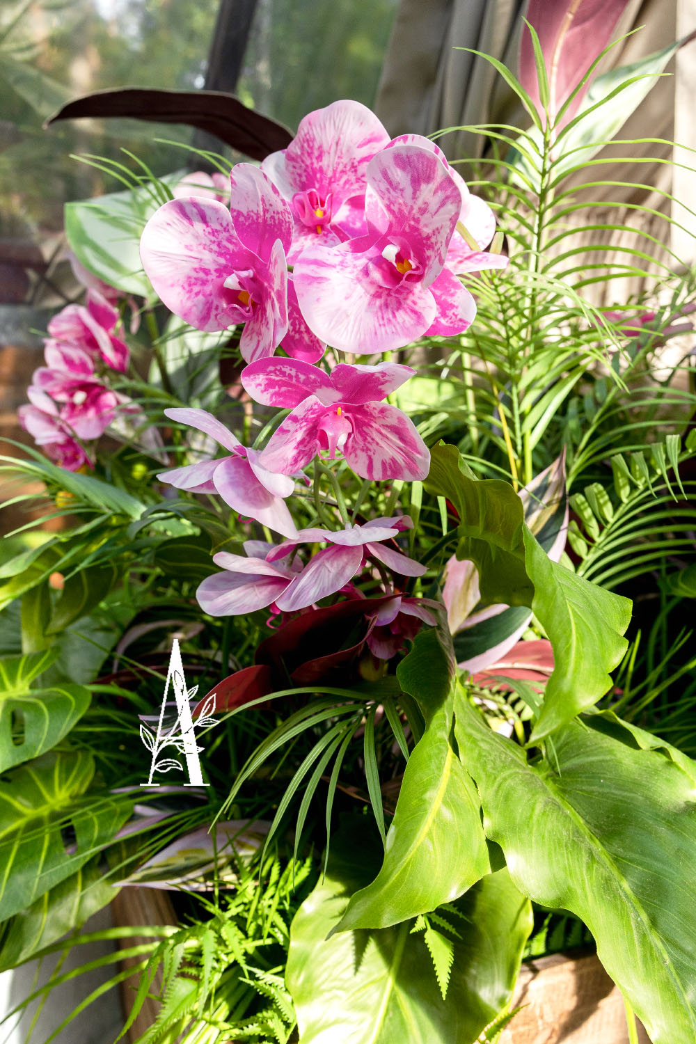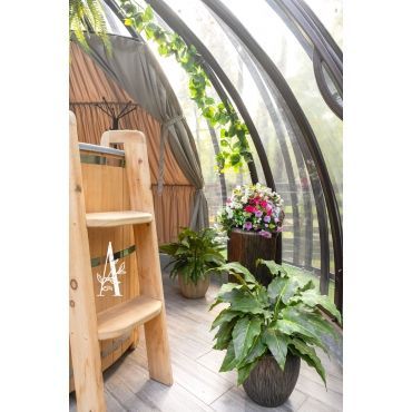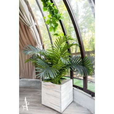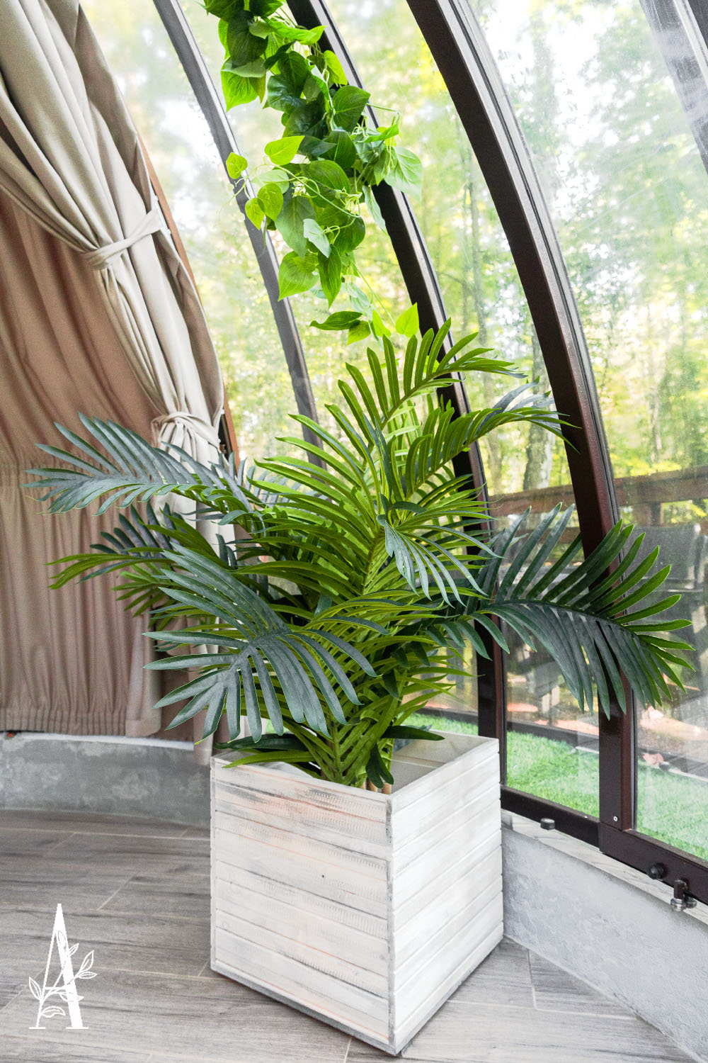 Гармоничное и спокойное пространство под прозрачными куполами в лесных массивах - отличное место для релаксации и восстановления сил.Чтобы добавить ему больше антуража и уюта были изготовлены и развешены на купольном каркасе зеленые лианы,которые придают больше природных отголосков простравнству. Цветочные лианы из бугенвиллии добавляют месту больше красок и создают романтичное настроение.Чтобы разнообразить зону отдыха вокруг ванн были выбраны:нежная лесная композиция из кампанулы в одном куполе и куст сирени в другом. Для оформления в одном из мест отдыха также была задействована кустовая пальма, придающая тепла и ассоциаций с жаркими странами. В довершении к декорированию глемпинга в стиле теплых стран были подобраны тропическая лиана и яркая композиция с орхидеей и листьями пальм.
