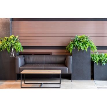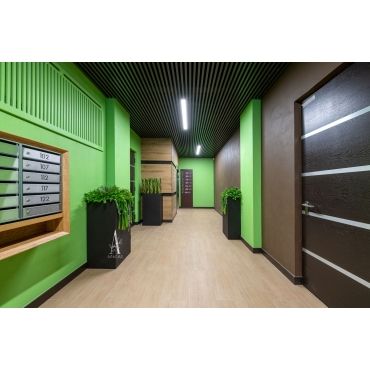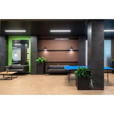 Петровский квартал - отличный пример озеленения жилых комплексов. Согласно высоким стандартам и статусу дома оформление искусственными растениями представлено не только в зоне ресепшн, но и в каждой входной группе: папоротники (с травой, с зеленью, патина), тропический микс с сарраценией, сансевиерия, микс с калатеей, сциндапсус, спатифиллум и монстера. В основе концепции лежит строгий стиль с выверенными линиями и лаконичными цветами, поэтому для растений выбрали черные боксы разной высоты. Сами растения выполнены из высококачественных материалов, что придает композициям натуральность и благородность.