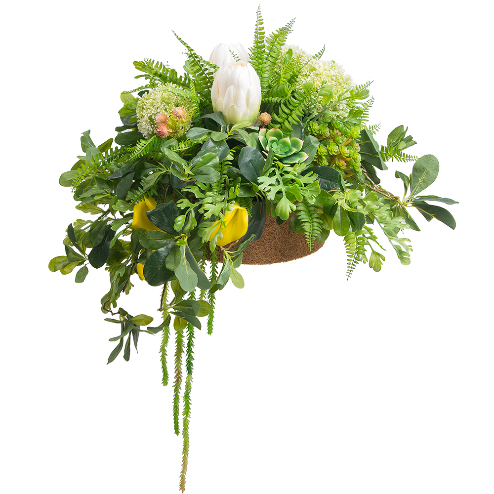 К08/2-1(з) Композиция искусственная цветочная h30см в круглом кокосовом боксе d29хh10см