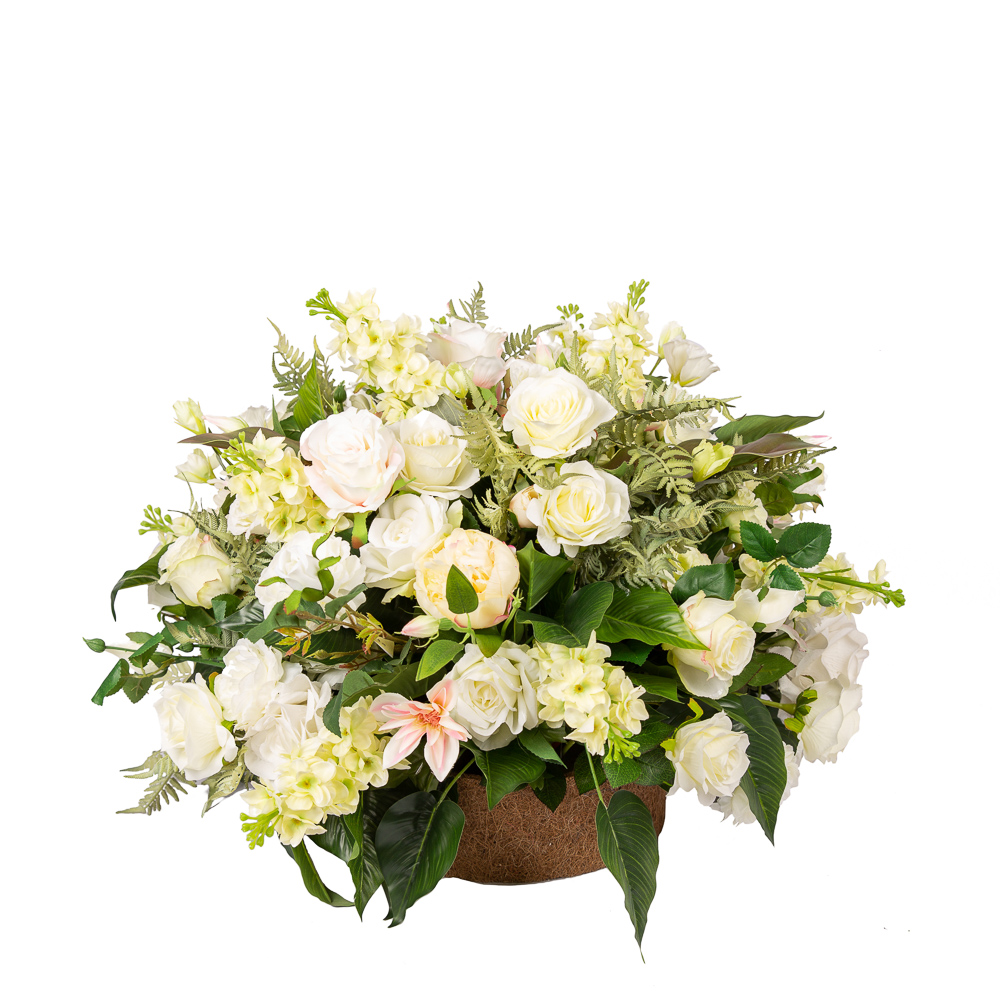 К343(з) Композиция искусственная Цветочный микс в круглом кокосовом боксе d65;h60см