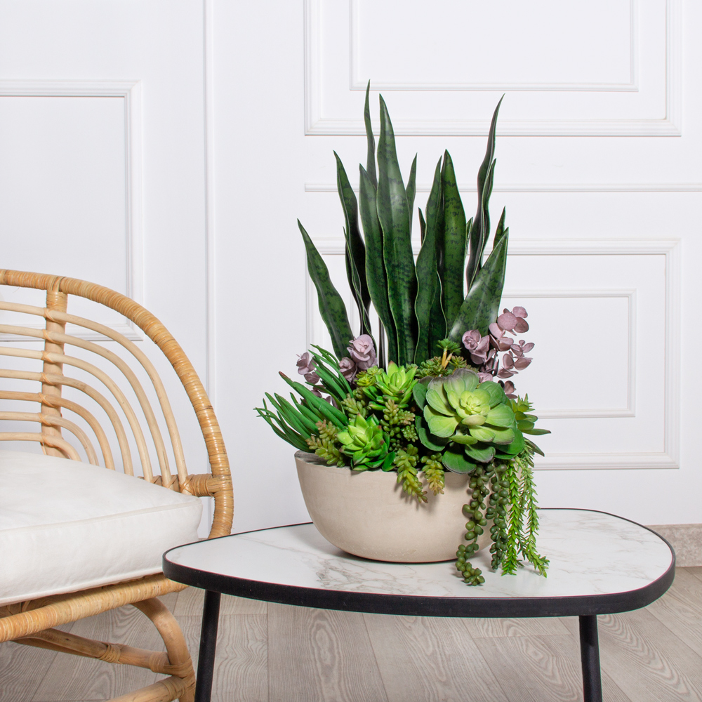 К498(з)(Пр)(F) Композиция искусств. с сансивиерией и суккулентами h52см в интерьерном кашпо"арт-бет"