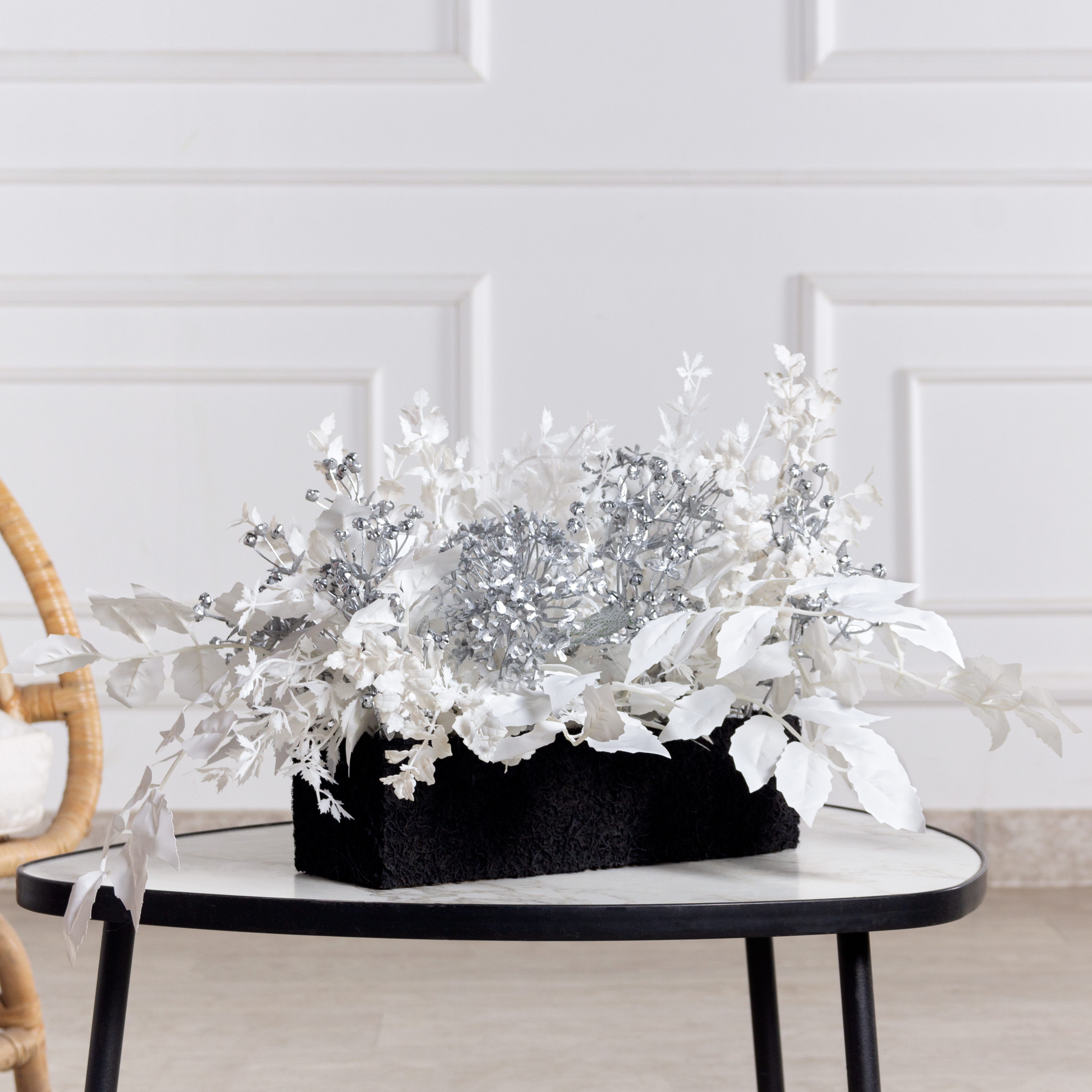 К514(з)(Пр)(F) Композиция искусственная с белым фикусом в черном кокосовом боксе 30х10х8см