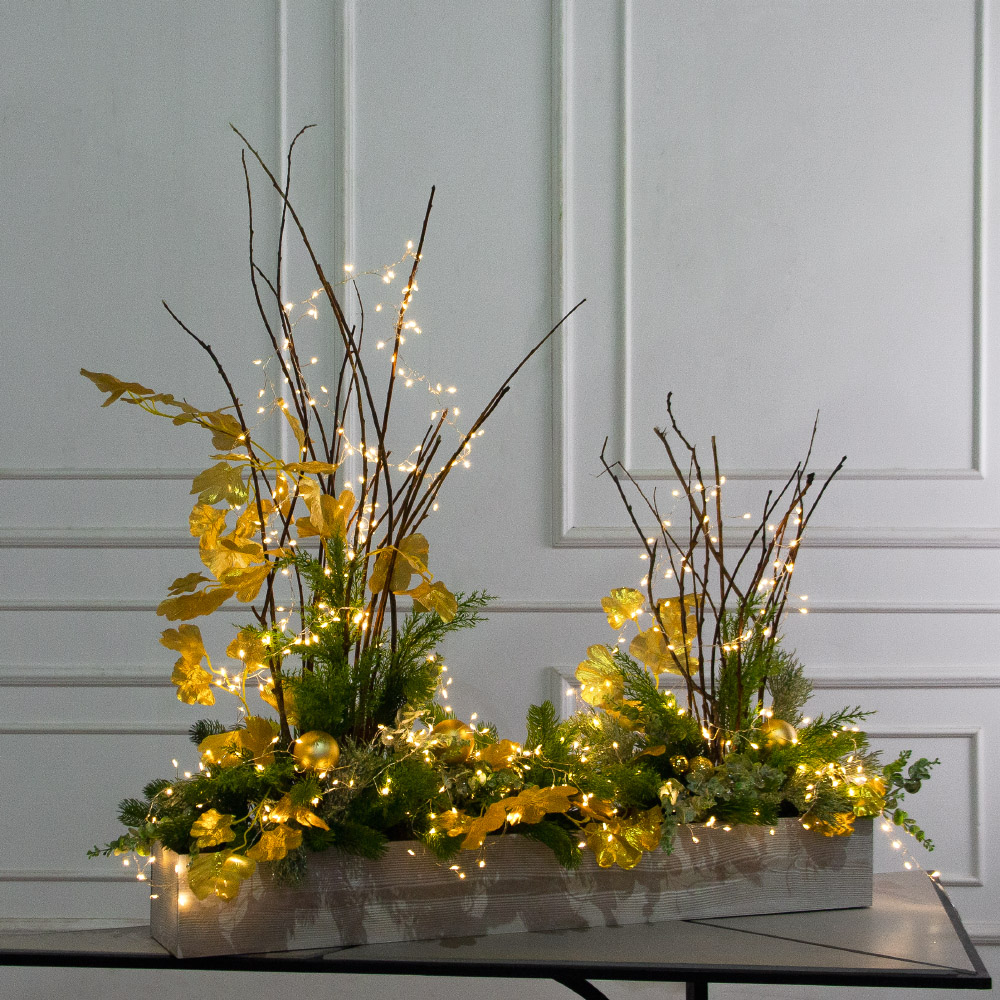 К556/СВ03т(Пр)(F) Композиция искусственная НГ с гирляндой Роса на основании, золото