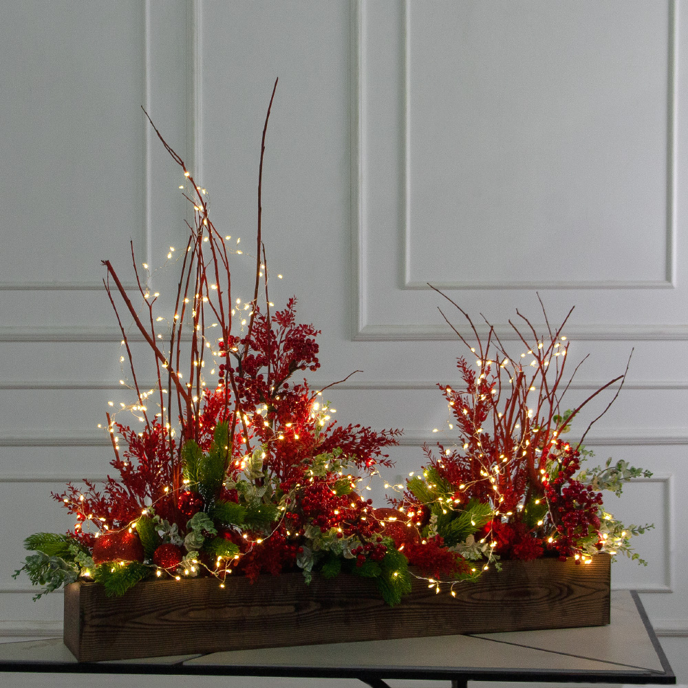 К557/СВ03т(Пр)(F) Композиция искусственная НГ с гирляндой Роса на основании,бордово-красная