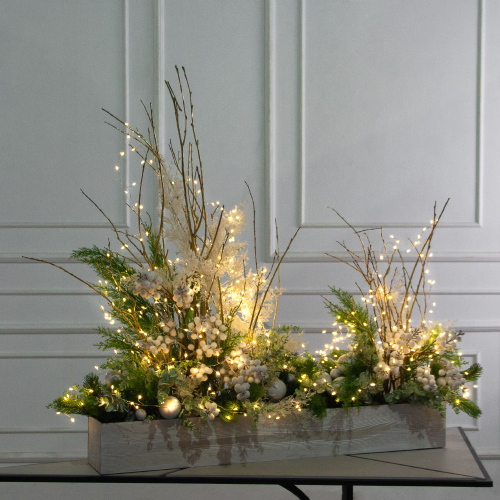 К558/СВ03т(Пр)(F) Композиция искусственная НГ с белыми ягодами и гирляндой Роса на основании