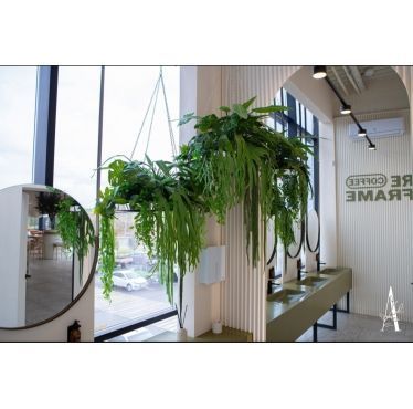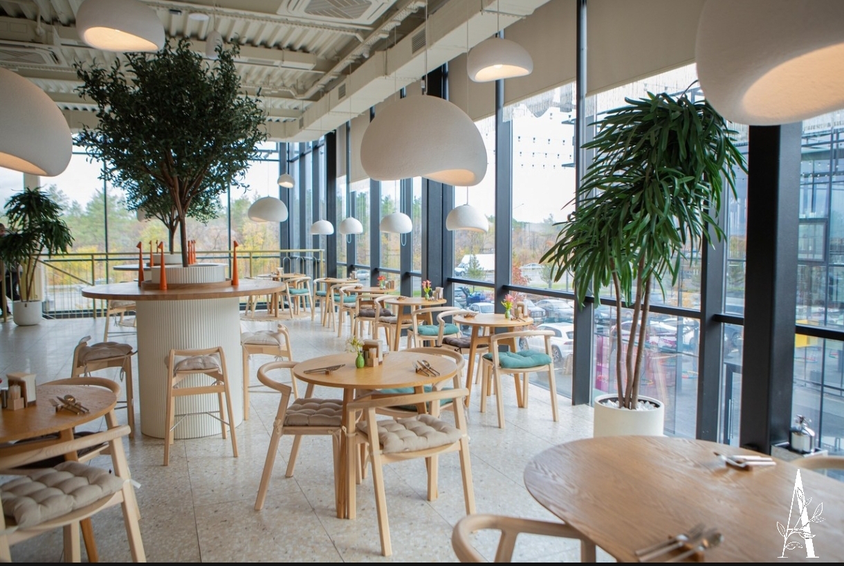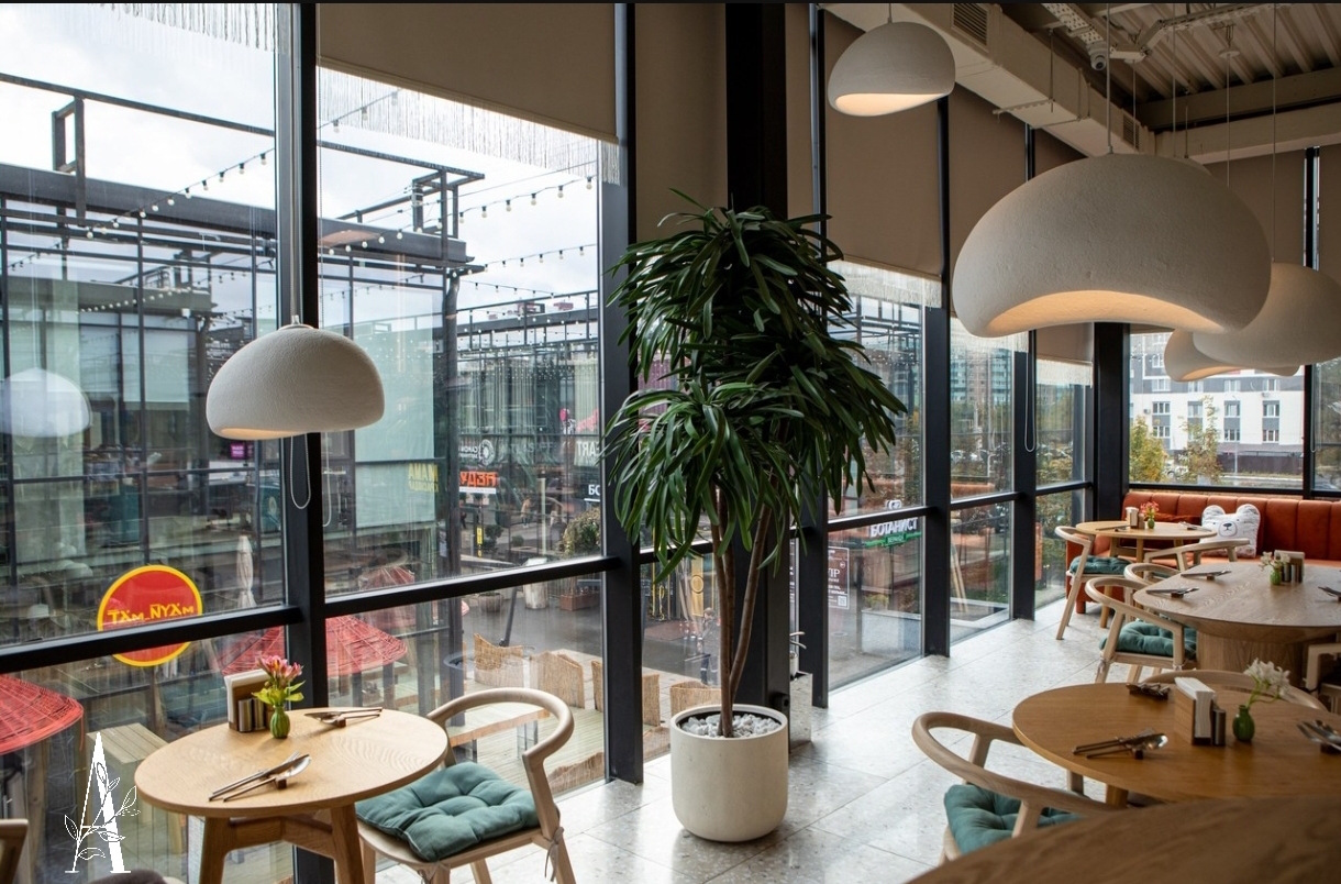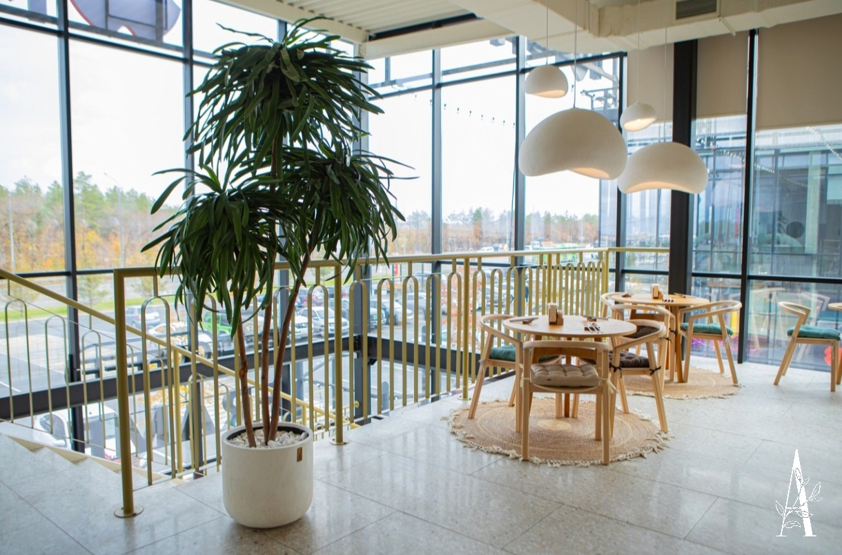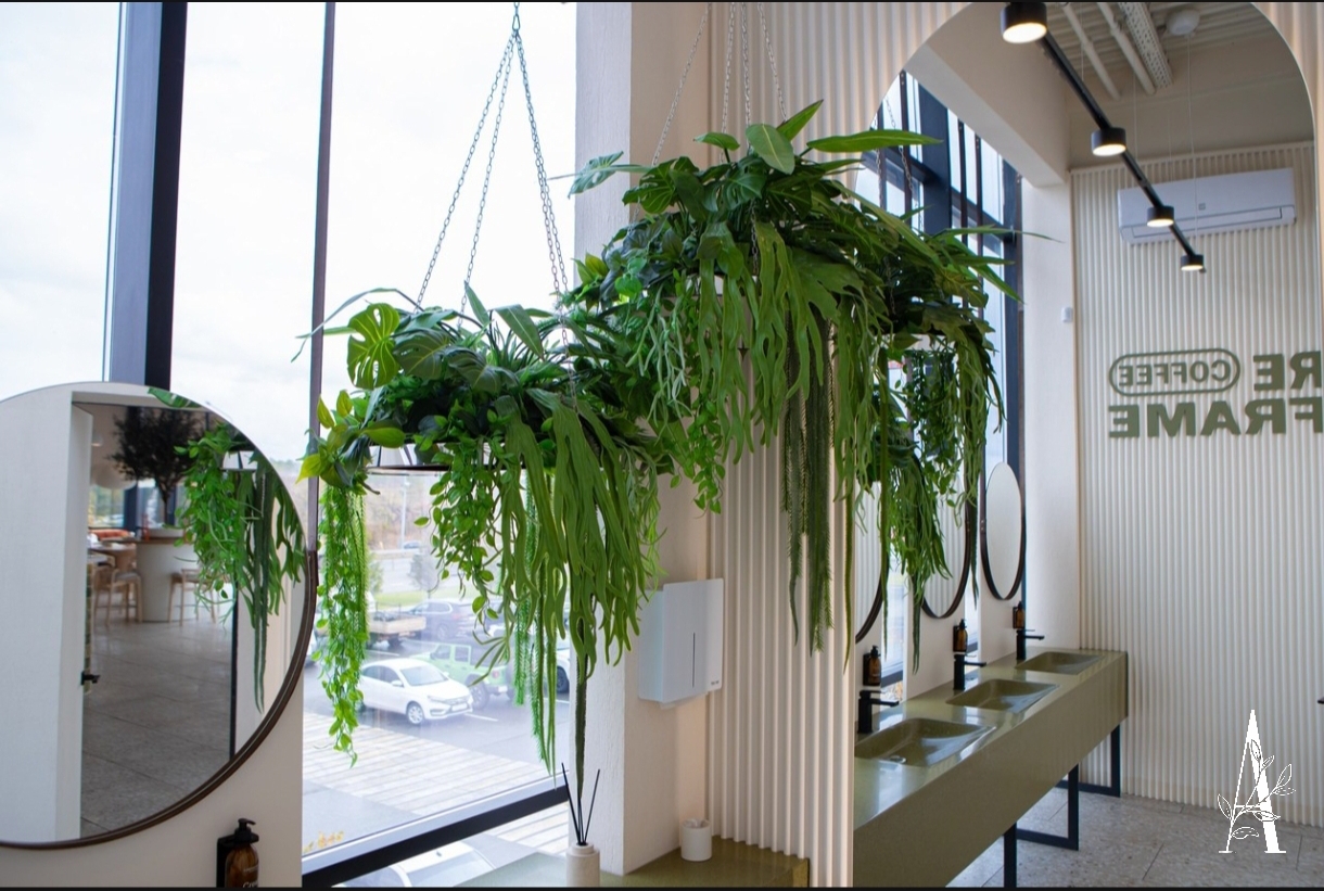 Прекрасные ветвящиеся растения, украшающие пространство нашего кафе, создают атмосферу спокойствия и гармонии, наполняя интерьер живым дыханием природы. Эти элегантные зелёные композиции придают помещению уют и свежесть, дарят ощущение близости к природе даже среди городской суеты.
