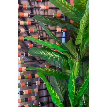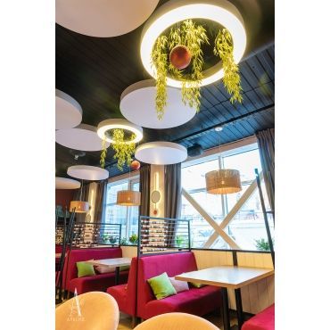 Футуристичный стиль кафе "Сушилка" прекрасно дополнили наши растения. Космические лампы украшены лианами шеффлеры с пеперомией, а банановые пальмы и диффенбрахии облагородили углы помещения.