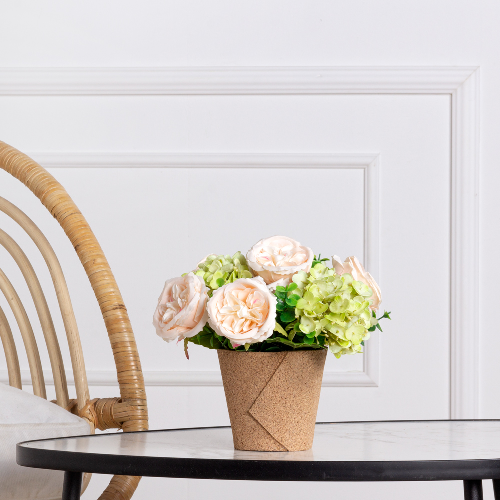 Композиция Розы с гортензией искусственные в декоративном кашпо, зеленые