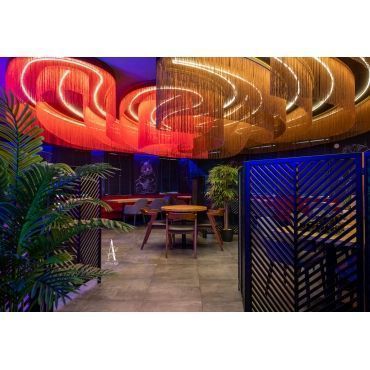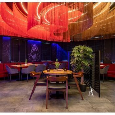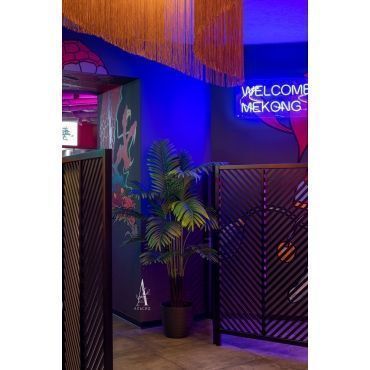 Ресторан Mekong разработал интересную концепцию с атмосферой азиатских улиц, где искуссвенные растения в неоновом свете смотрятся потрясающе. Одним из символов Азии является бамбук, поэтому разные композиции (160см и 200см, ширма) украшают пространство. Также банан и пальма поддерживают тропическую тематику.