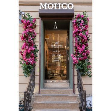 В цветочном бутике искусственные растения гармонично сочетаются с живыми, так как выполнены из премиального материала и практически не отличаются от настоящих. Композиция из нежных бутонов на фоне цветочной фрески подобраны под общую цветовую гамму интерьера и обрамляют дверь и арочку. Банан и тропический микс создают дополнительный объем настенным рисункам. Вход в бутик украшают яркие лианы, которые видны с любой стороны улицы.