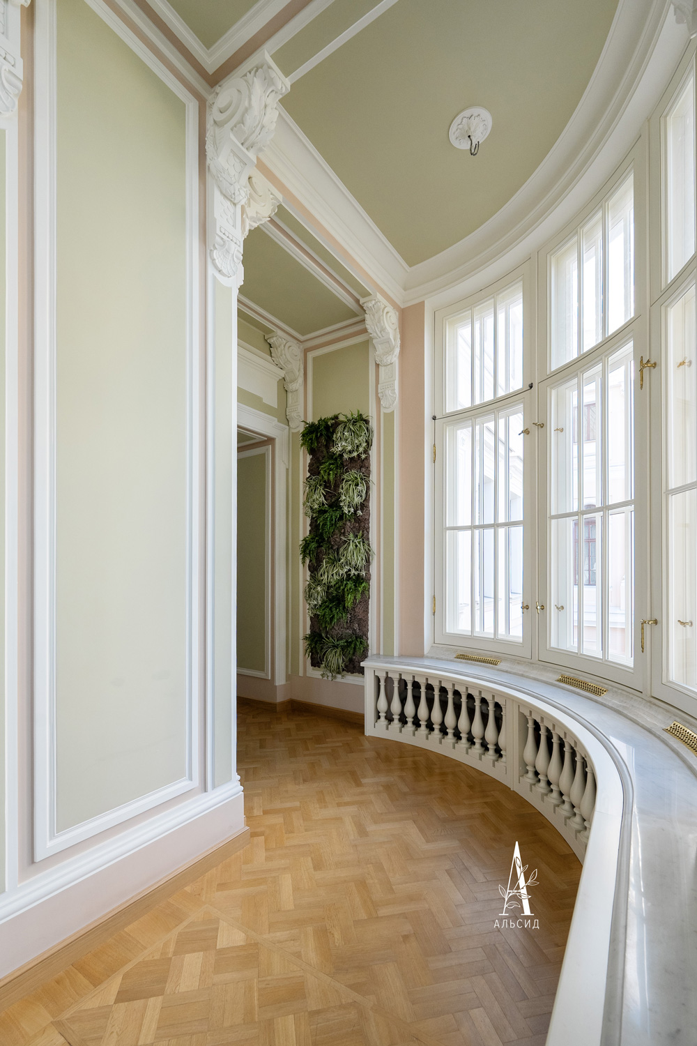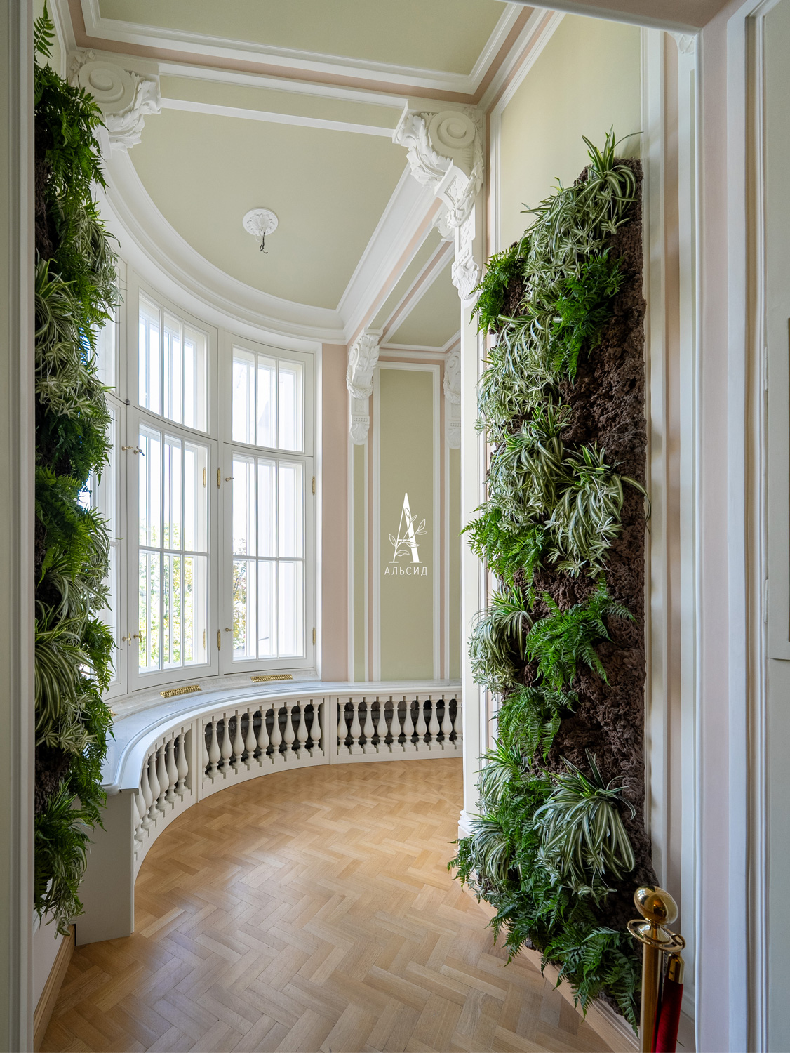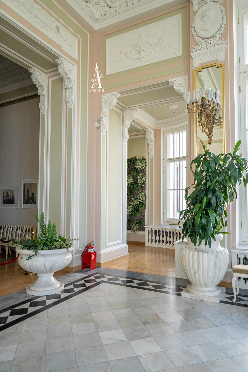 В музейной части Аничкова Дворца среди величественных арок и колонн фитостены с тропическими растениями (папоротник, драцена, хлорофитум) украшают порталы, соединяющие залы и большой эркер. Для оформления таких высоких и узких стен искусственные растения подходят идеально!;
