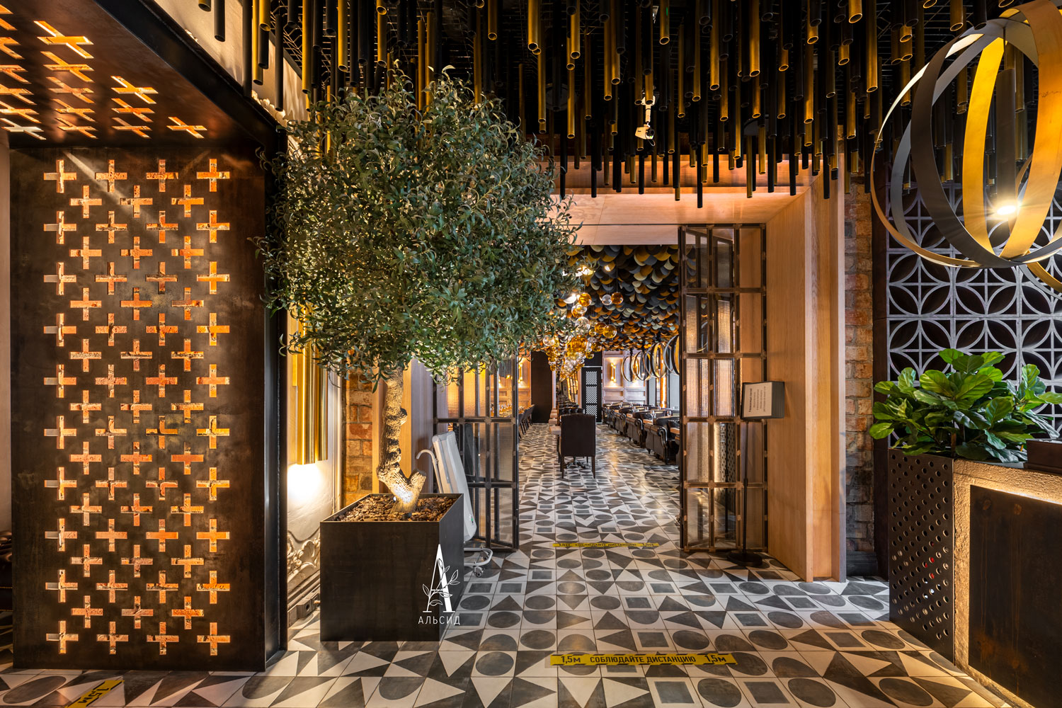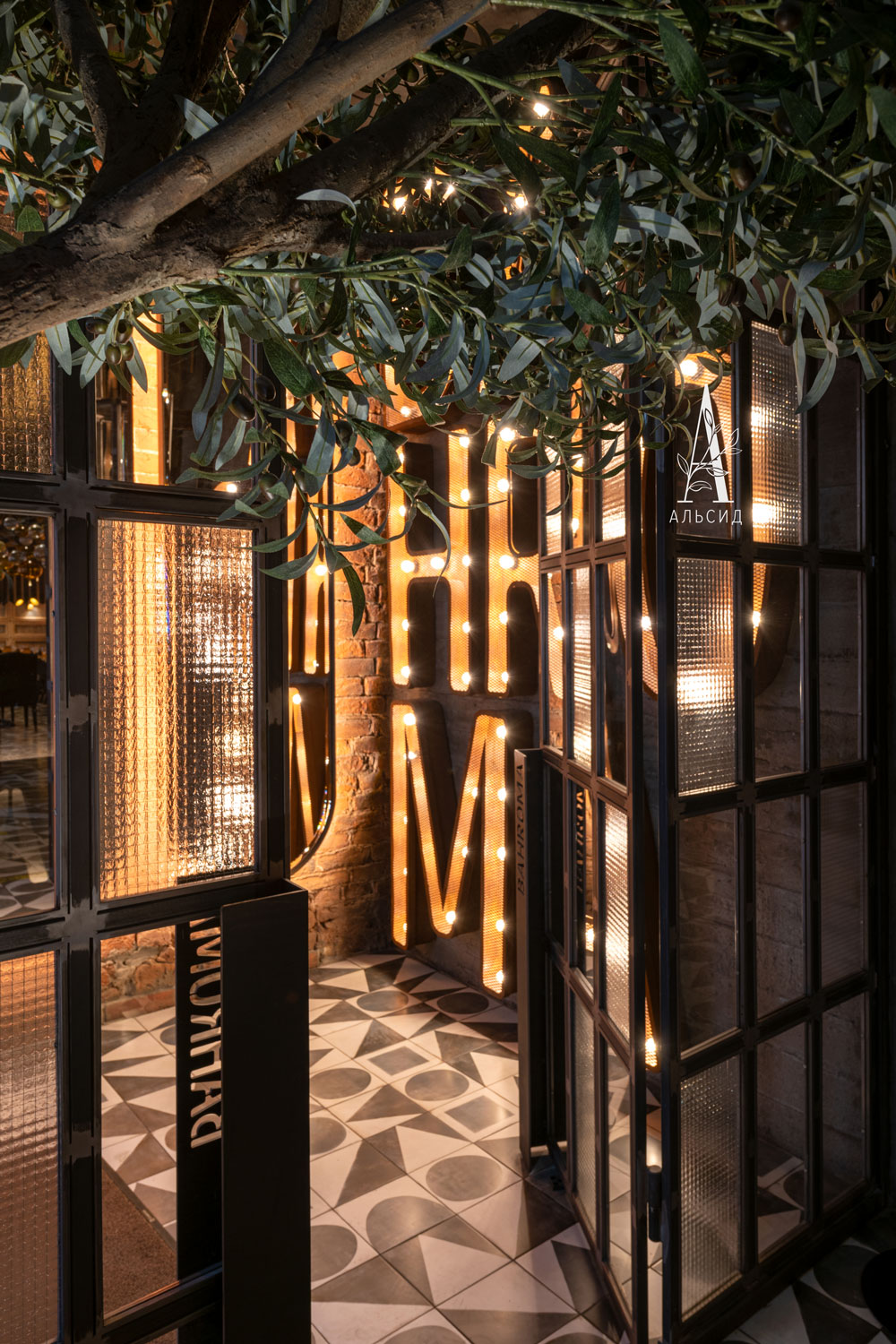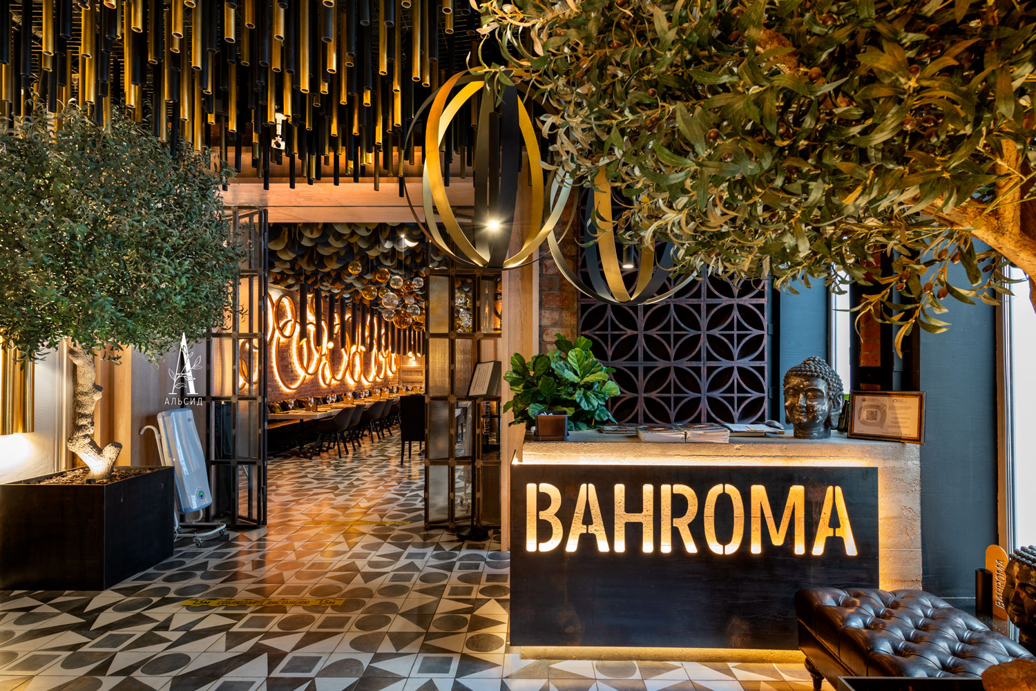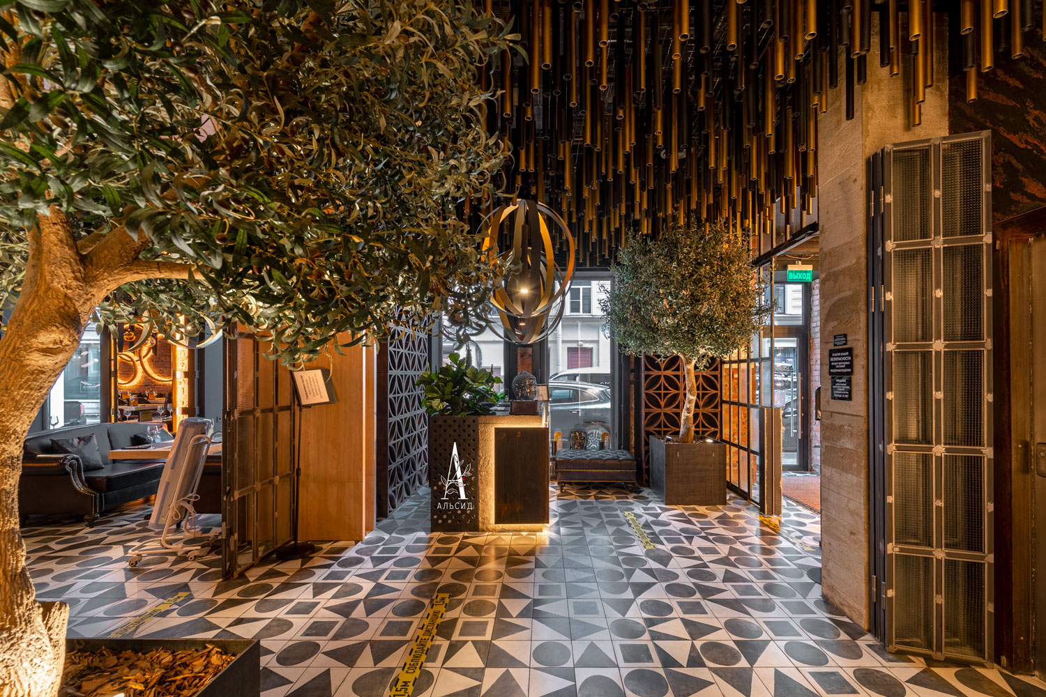 Величественные оливы, выполненные на заказ, встречают гостей ресторана в зоне ресепшн. При создании интерьера важно подобрать правильное дерево, и наши мастера смогут воплотить любую идею, независимо от размера и формы изделия. ;