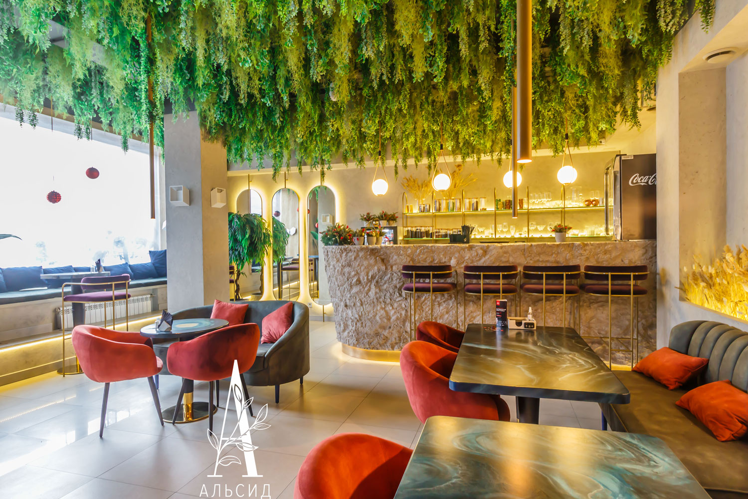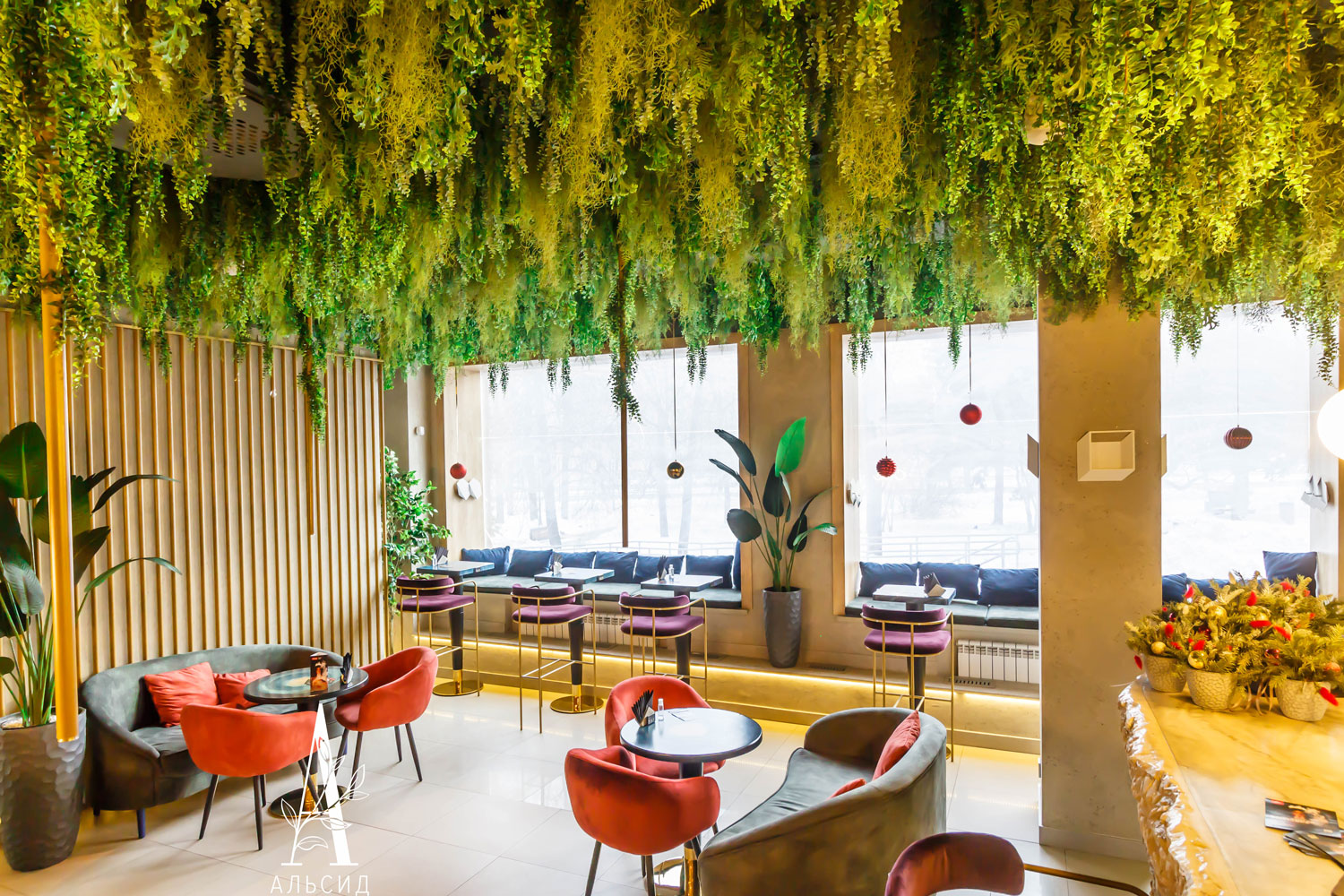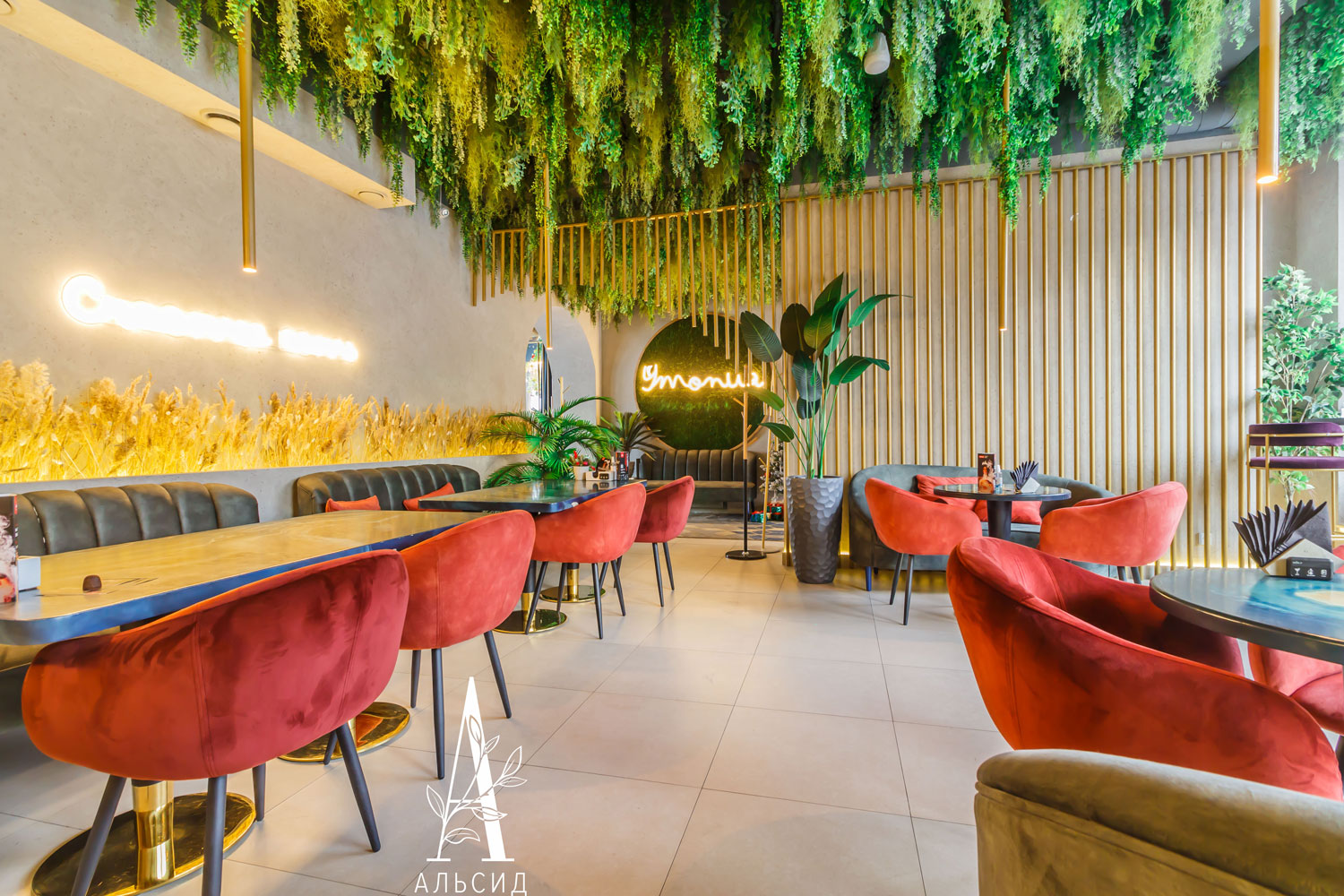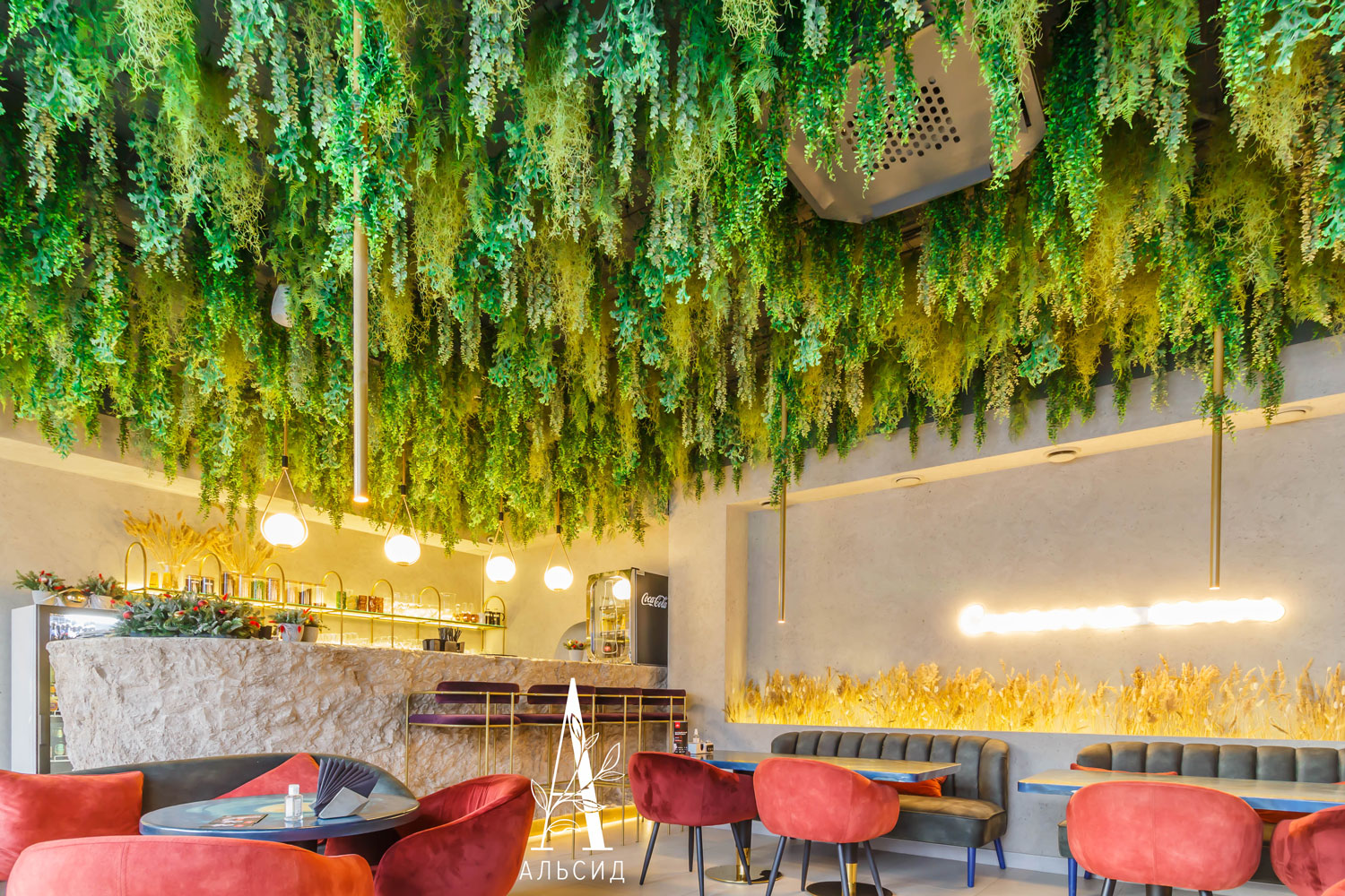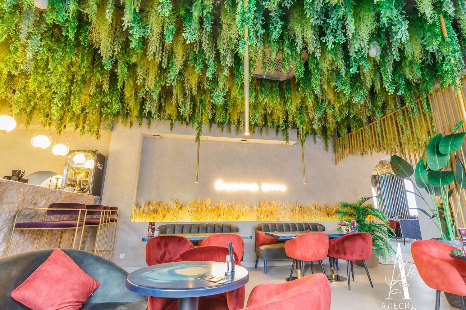Бар Утопия - удивительное место, где строгие линии идеально сочетаются с футуристичными изгибами, а наши растения только подчеркнули это сочетание, придав бару особенный тон. В работе представлены следующие наши растения: зеленый микс с ампельными растениями, папоротник большой с травой, сноп-овал из осоки, трава в кокосовом боксе и лиана с щитовником. ;