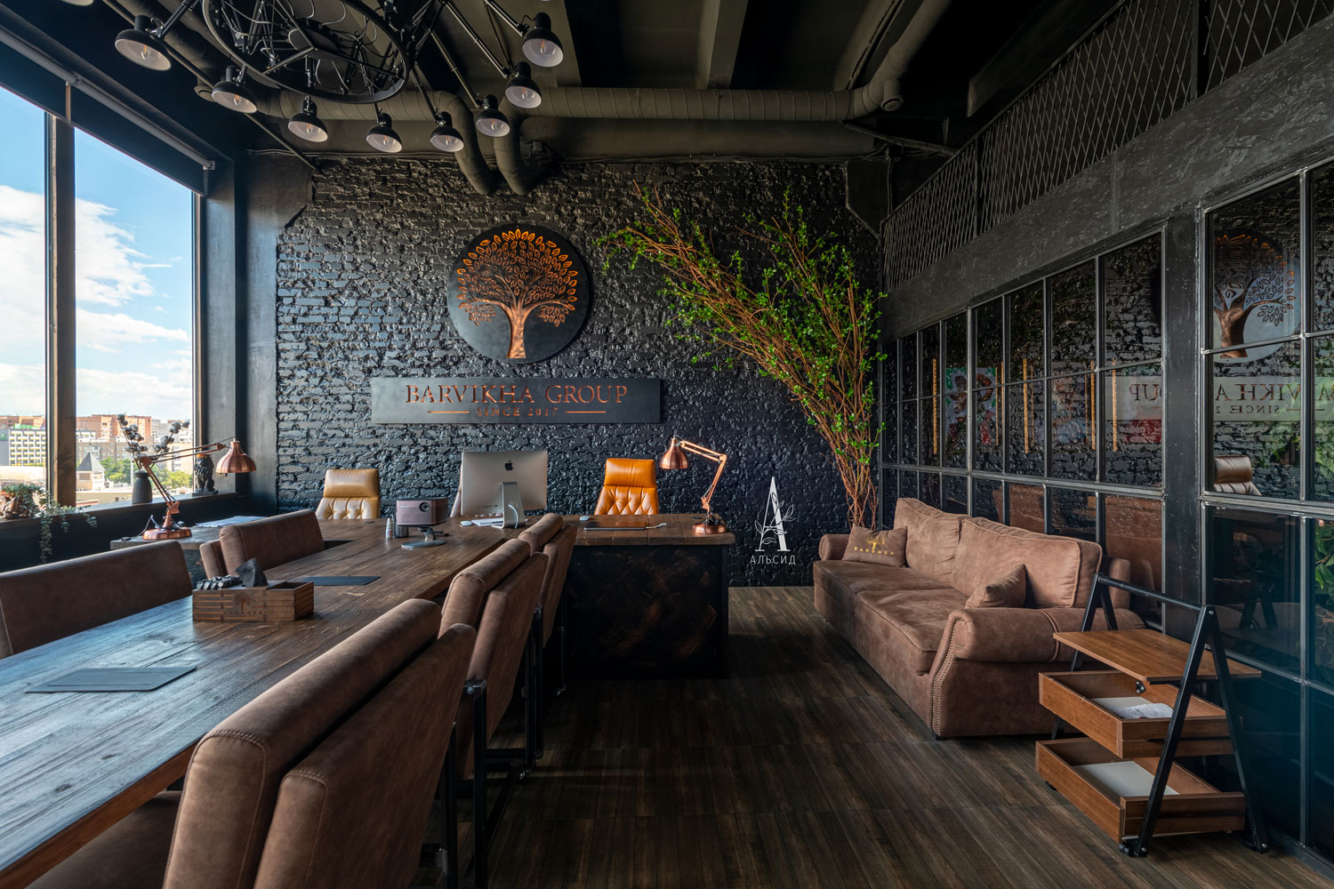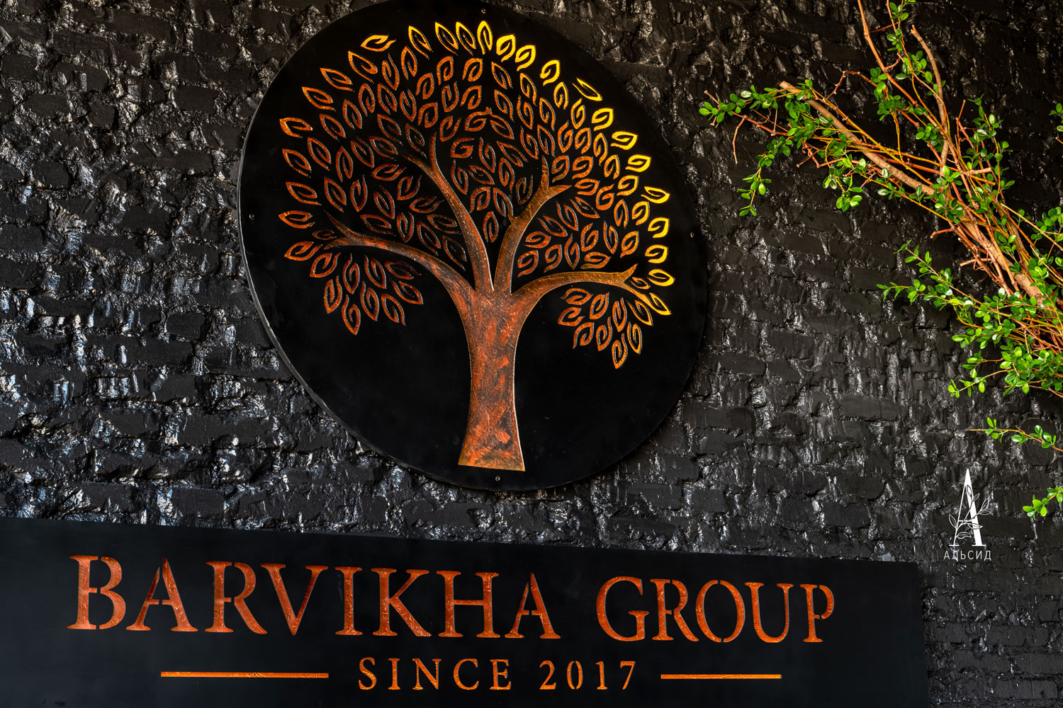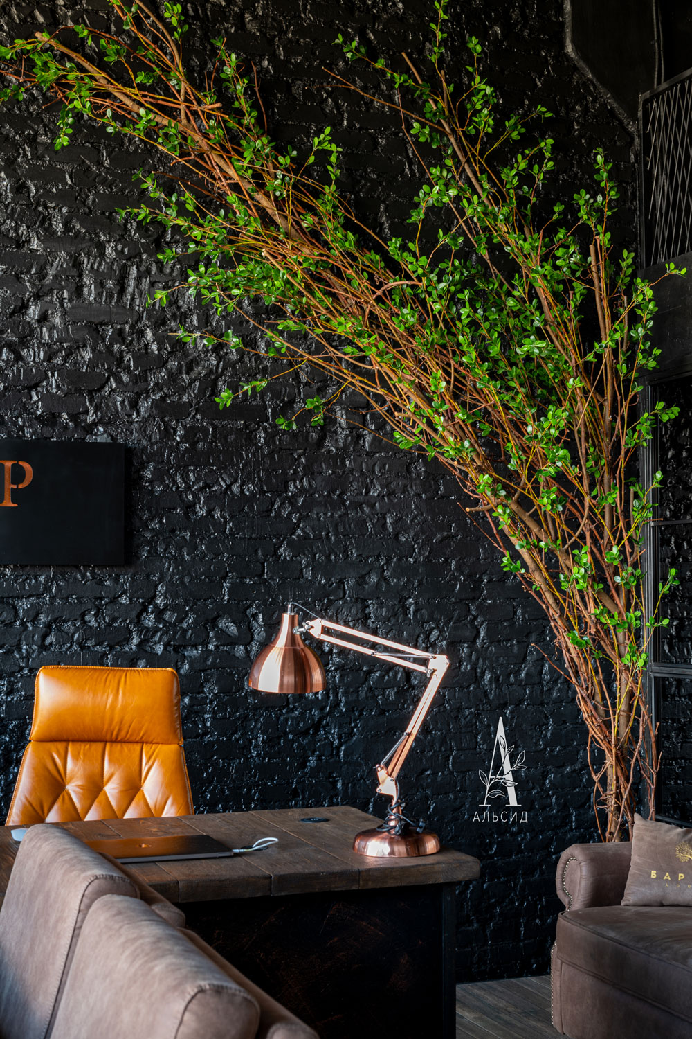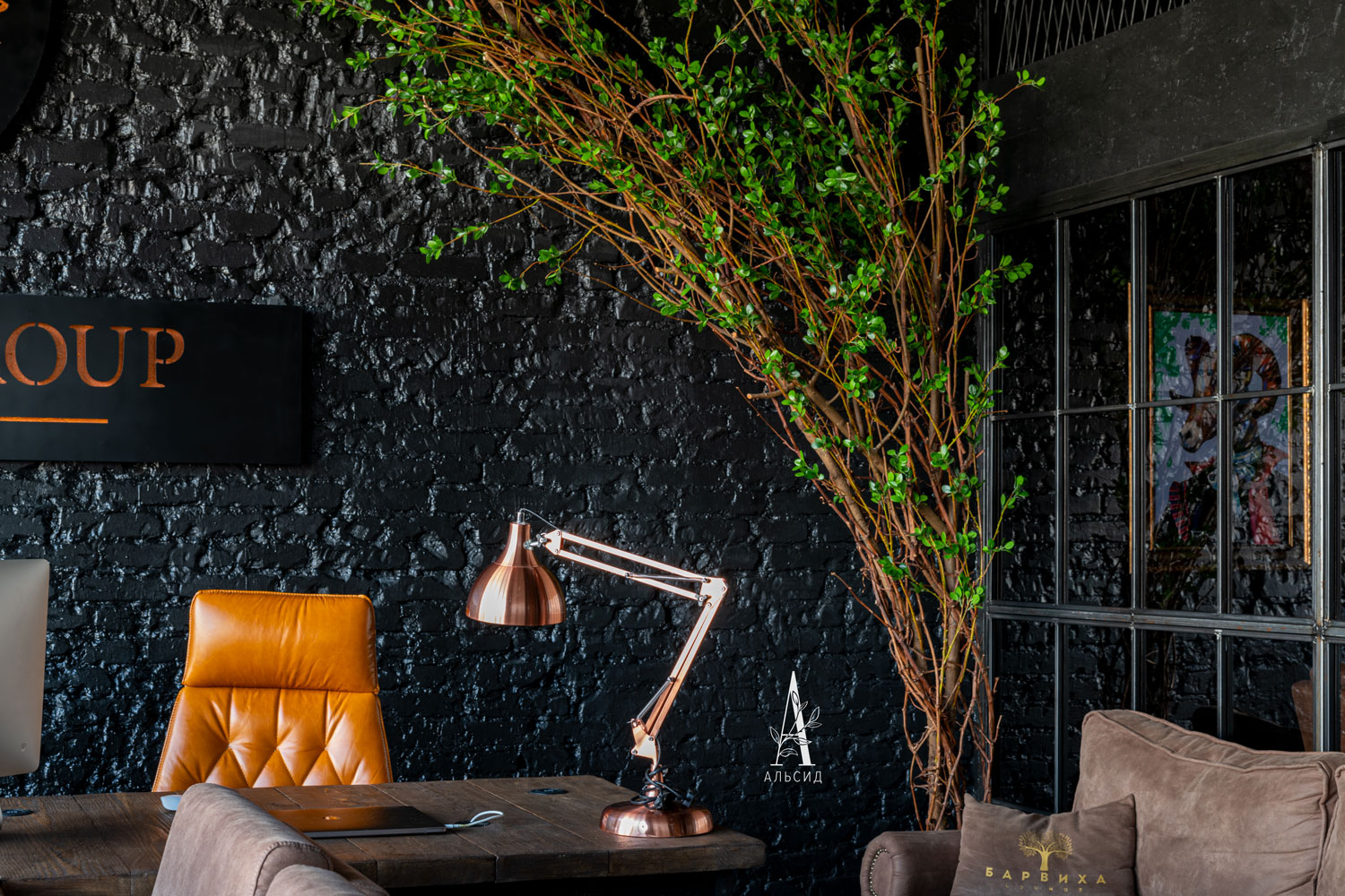 В кальянном клубе Барвиха зеленые акценты расставили на порталах: бугенвиллея стала интересным аналогом фитостены - она не только покрывает большую площадь стены, но имеет изогнутую форму, которая идеально походит для арок и полуарок. Для зонирования пространства в залах расставлены фикусы (150см).;