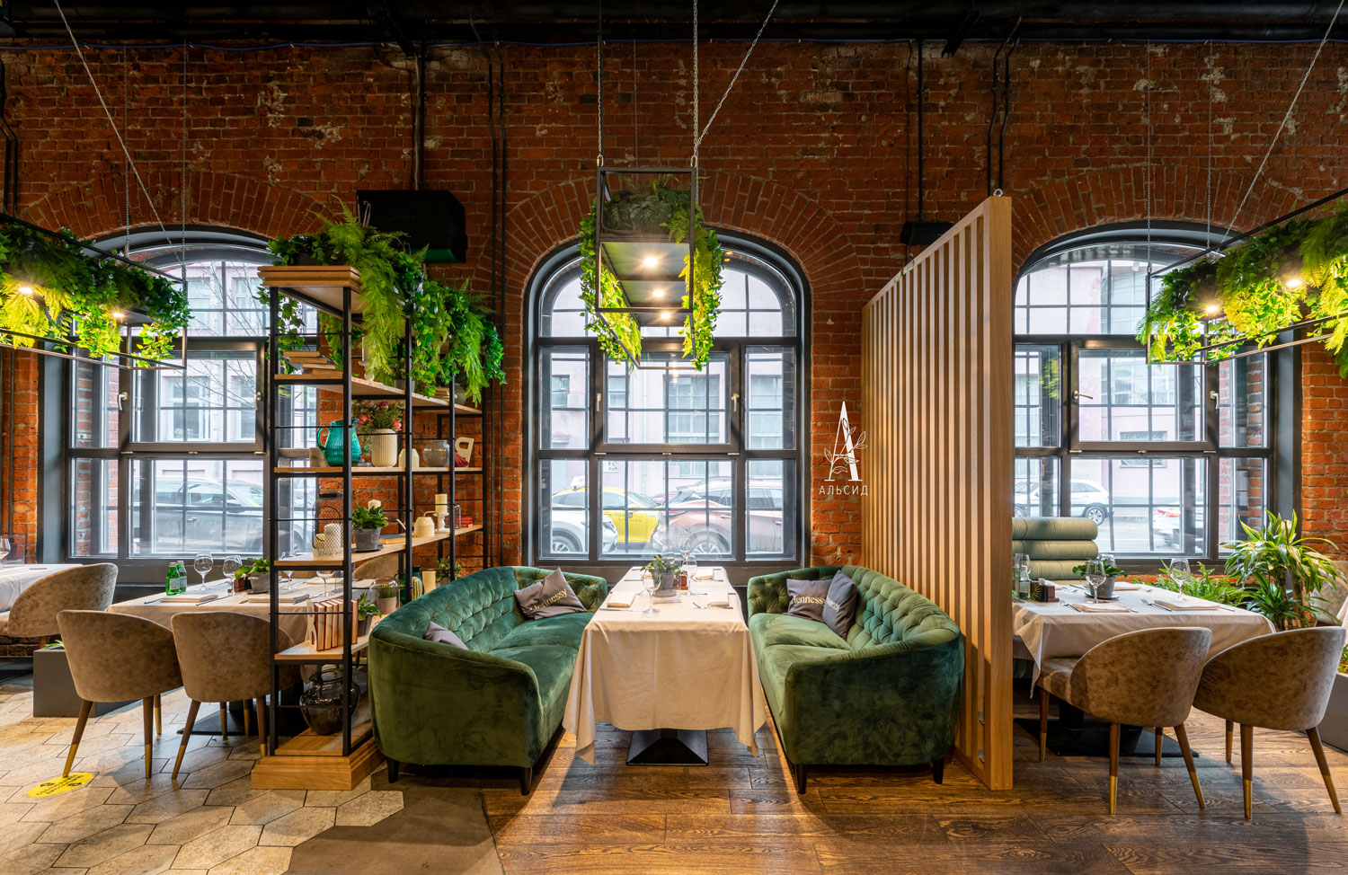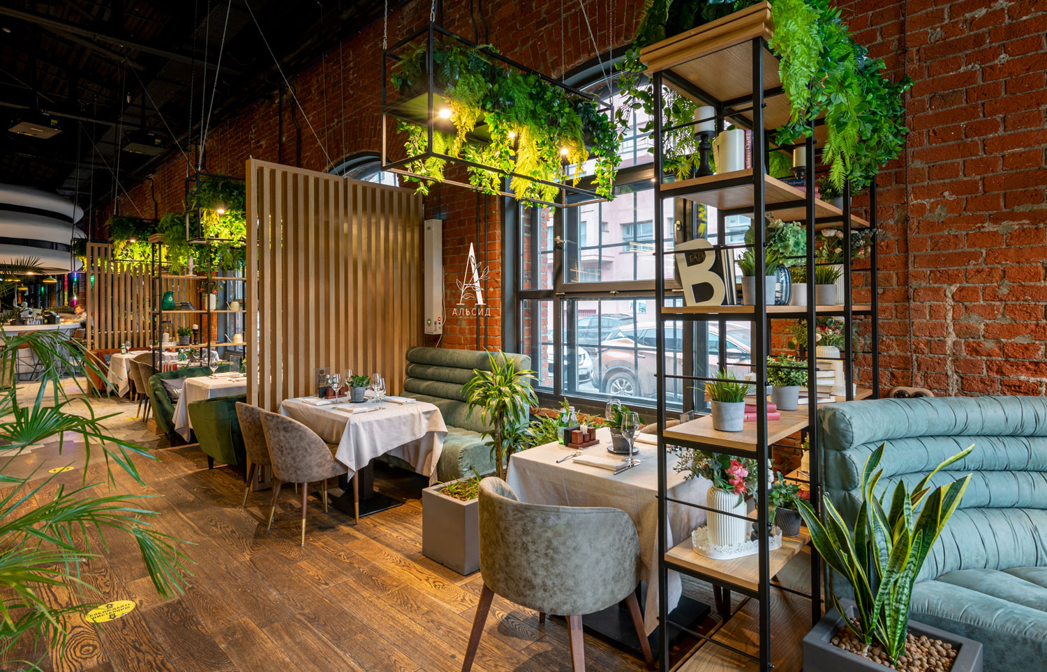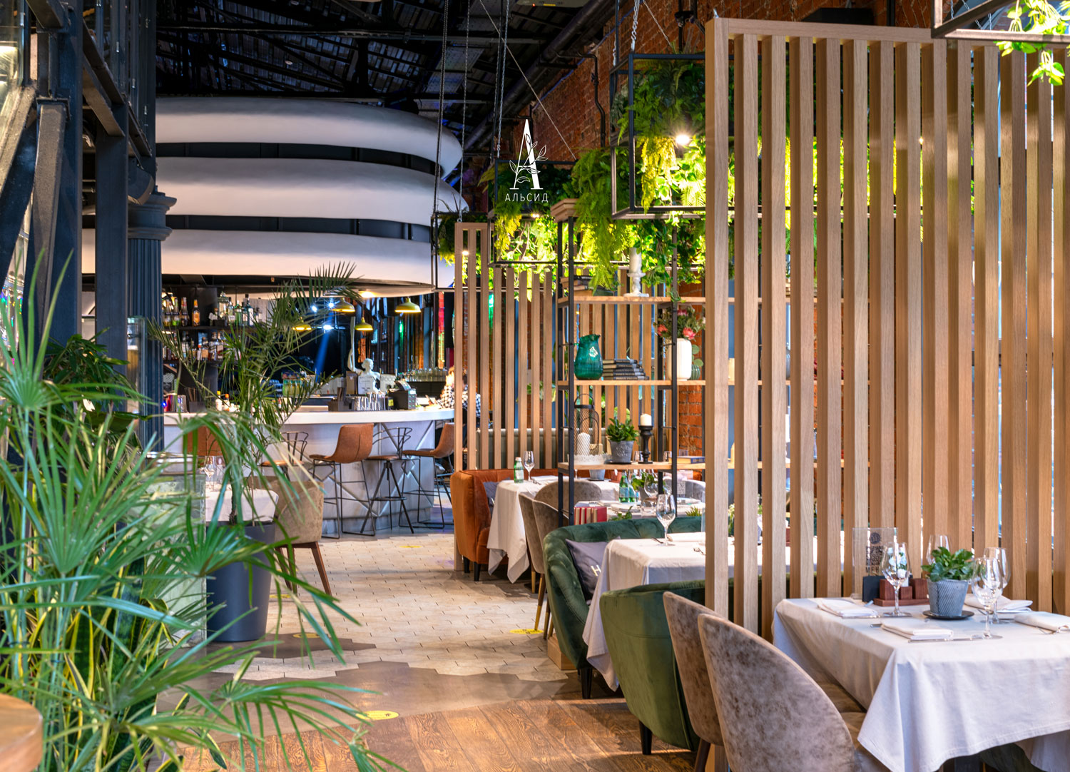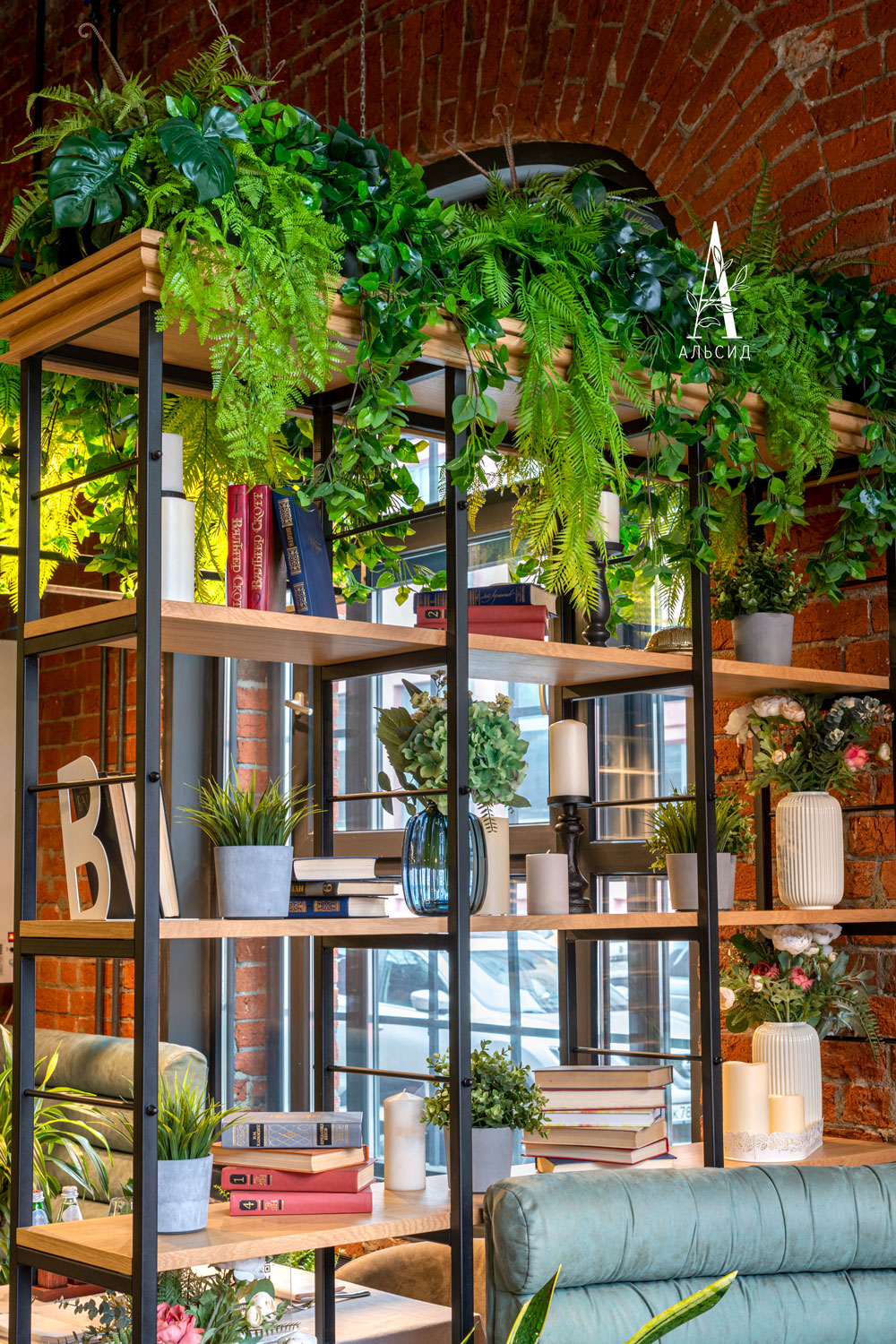 Сочетание живых и искусственных растений нередко используют в оформлении интерьера. Только искусственные растения подойдут для труднодоступных и малоосвещенных мест. Так, в зоне ресторана над столиками на металлических каркасах свисают ампельные композиции, а бар вдоль антресоли украшают тропические фитостены. ;