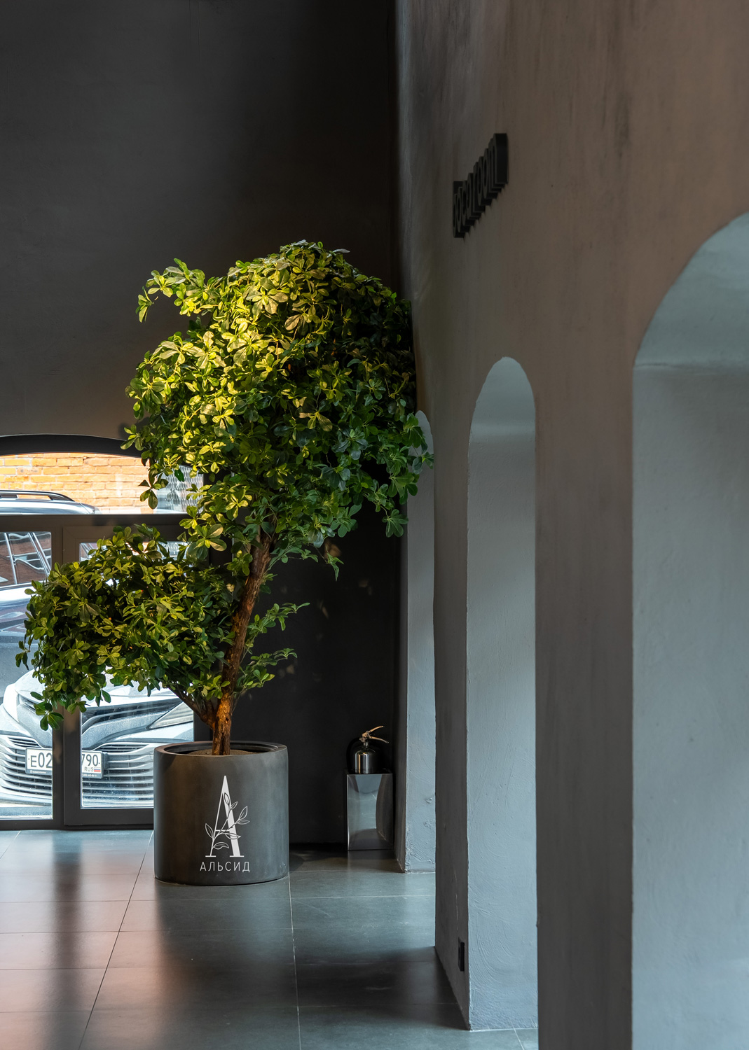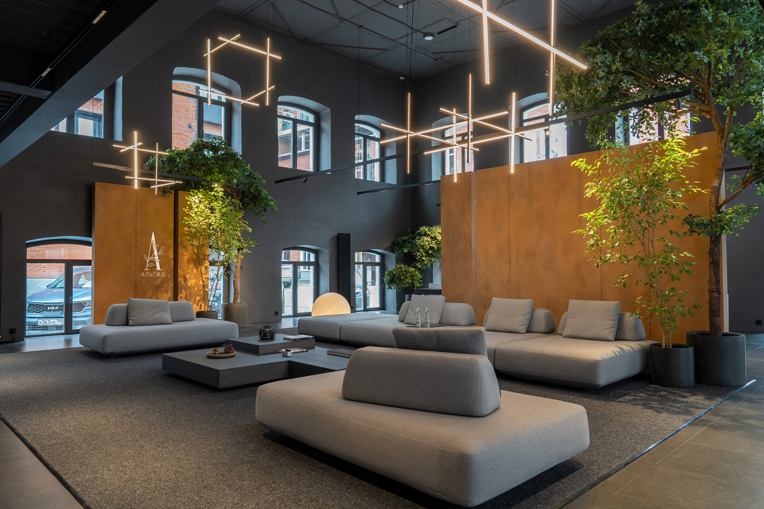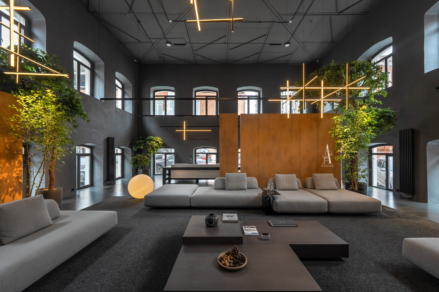 Шоу-рум мебели Boca Room для эспозиции своих товаров оформил пространство с высокими потолками крупными шеффлерами с широкой кроной. Данное решение придает интерьеру свежесть и дополнительную текстуру.;