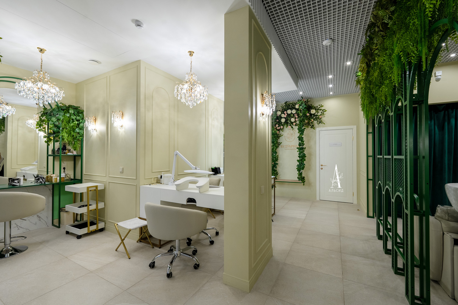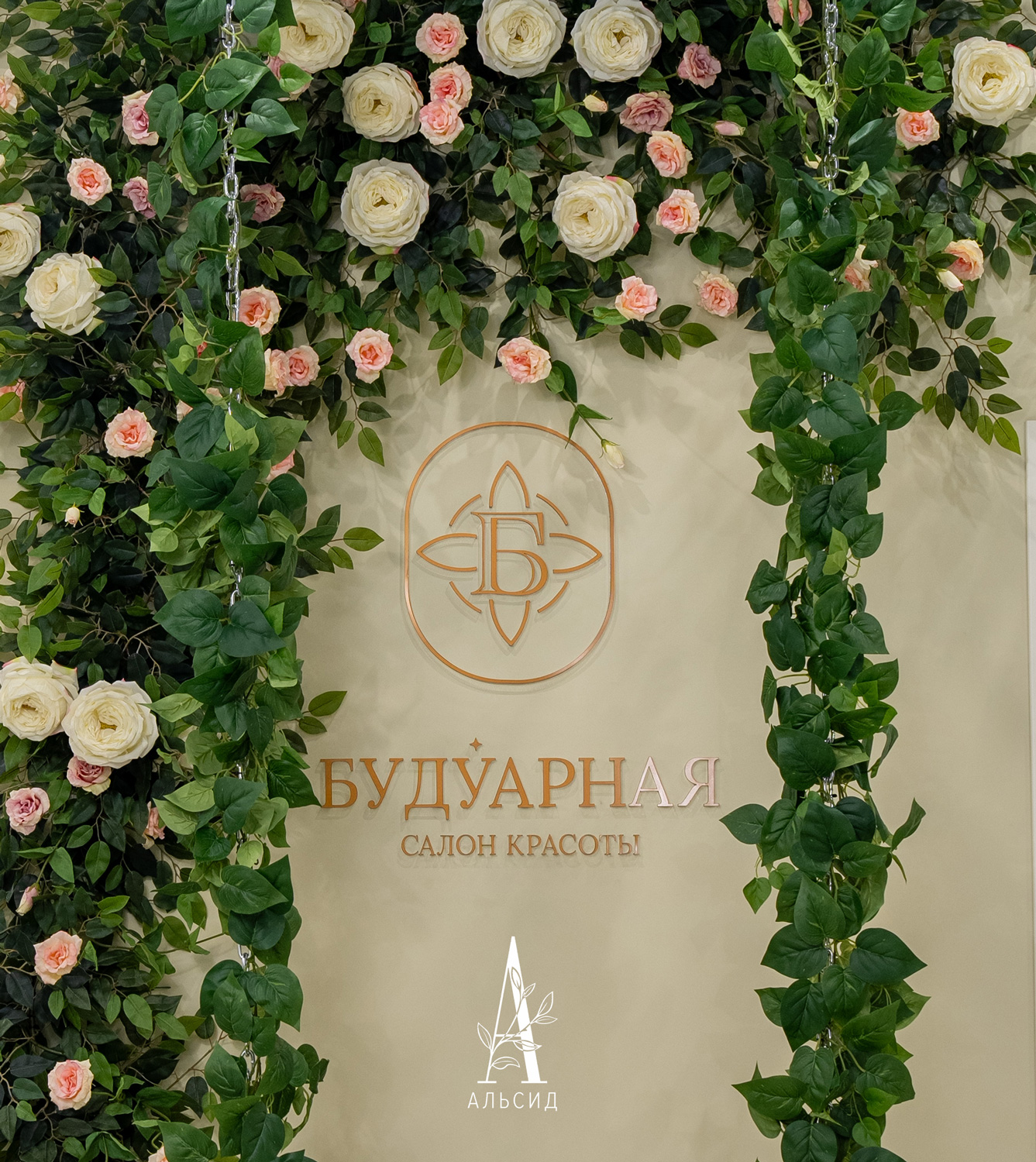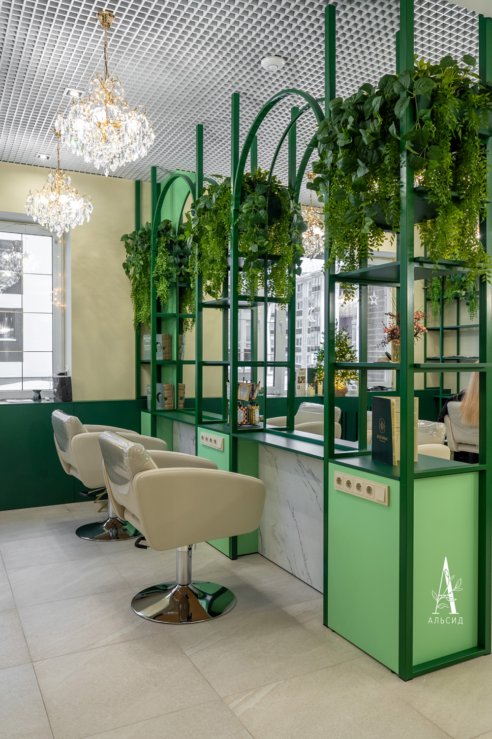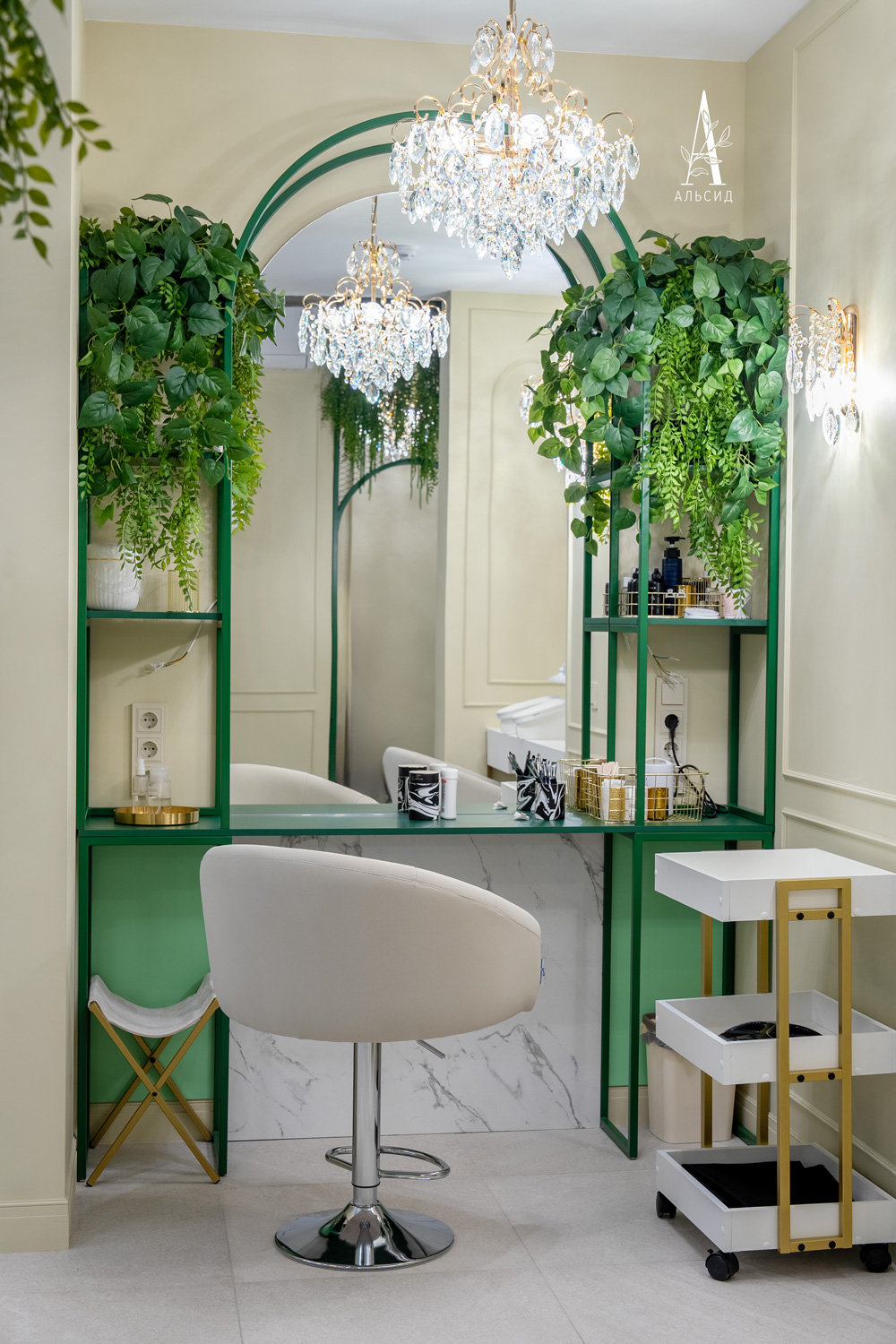 В роскошном салоне красоты со стильным и утончённым дизайном прекрасно вписались искусственные растения с апмельными свесами. Комплексное озеленение состояло из боксов, лиан, подвесного декора и штучных растений, украшающих фантазийные качели в фотоуголке. Кокосовые боксы с ампельными растениями, помещённые в ниши золотых стоек, дополняют парикмахерскую зону, а композиции с экзальтатой зонируют пространство зоны педикюра. Лиана со сциндапсусом обрамляет зеркало в кабинете эстетики лица и тела, дополняя изумрудный цвет стен. Композиция с папоротниками в подвесной коковите отлично обыграла пустой уголок в уборной комнате. Видоизменённая лиана с ампельными растениями обвивает с двух сторон декоративную арку в парикмахерской зоне, добавляя шарму всему пространству. Фотозона для гостей студии красоты украшена полуаркой, разработанной на основе цветочных лиан, а по цепям качелей спускается сциндапсус.;