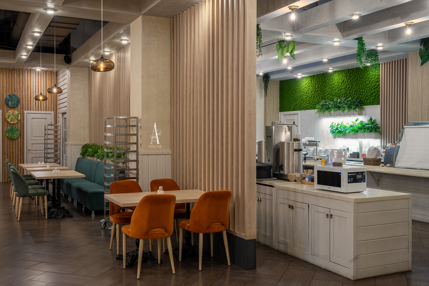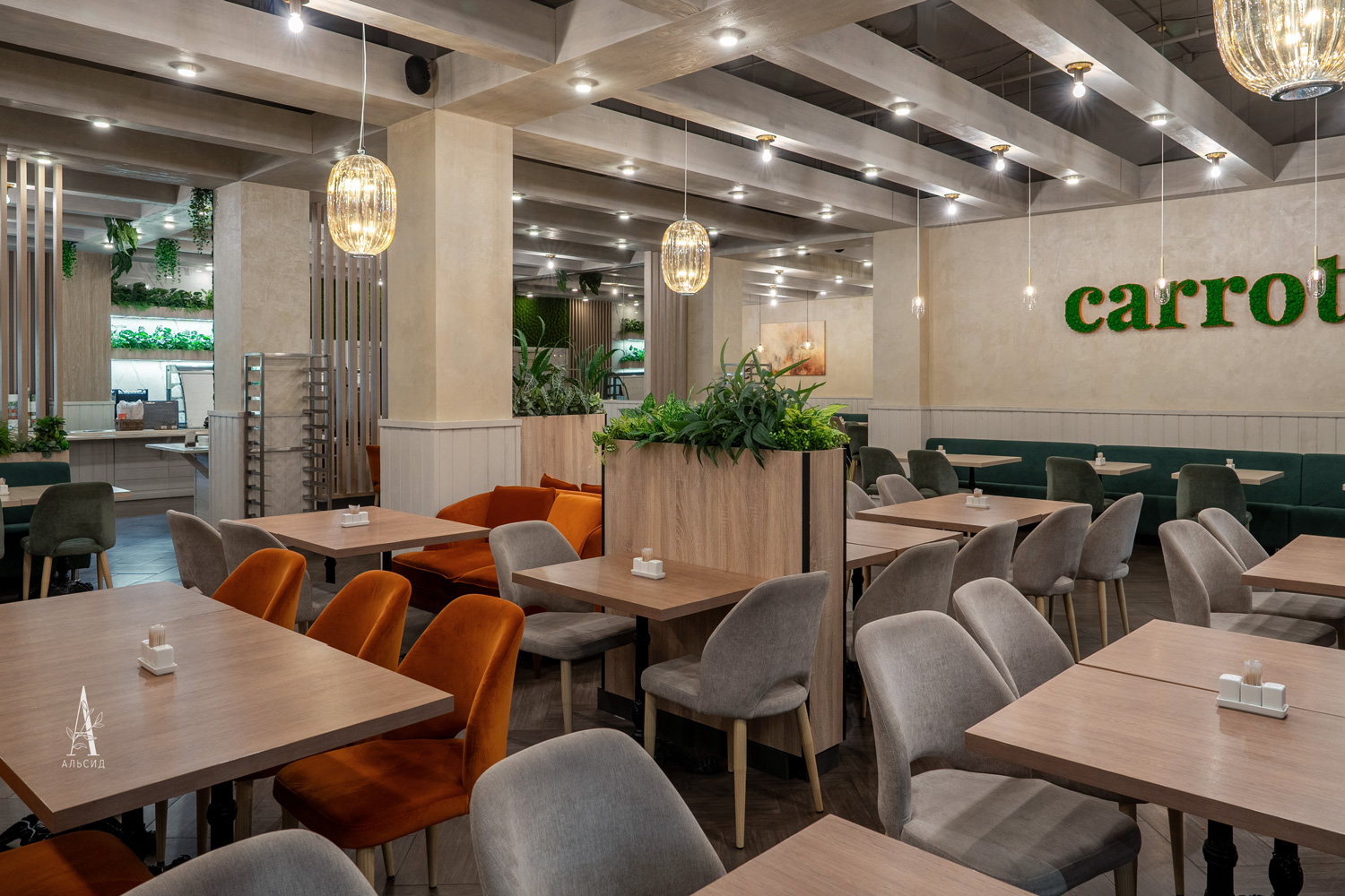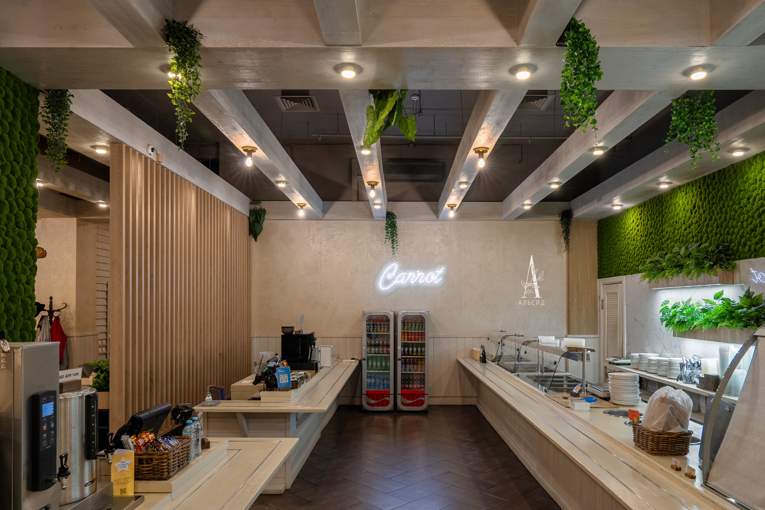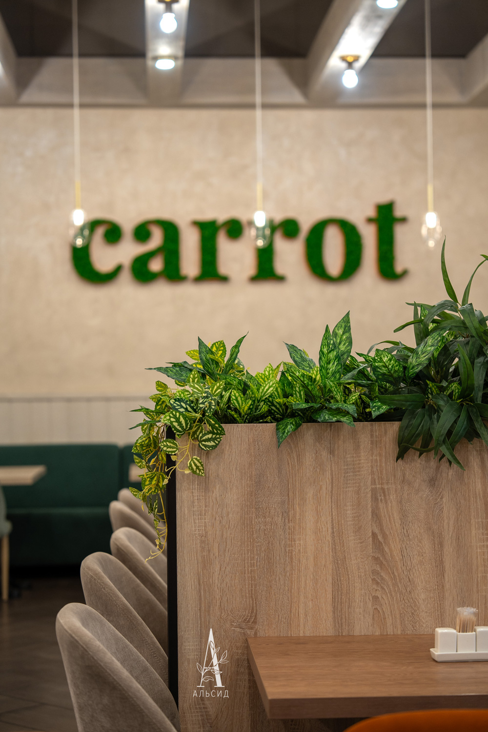 В современном кафе Carrot искусственные растения используются для зонирования пространства: композиция с Алоказией и Калатеей, композиция с Пилеей и композиция зеленый микс украшают перегородки. Композиция из папоротников с монстерой и спатифиллиумом дополняет фитостену в зоне выдачи.;