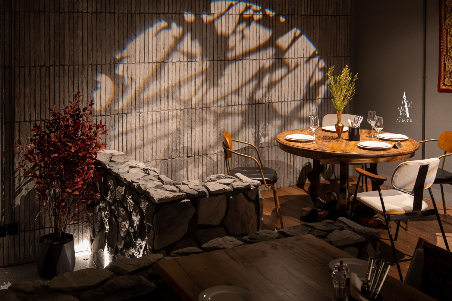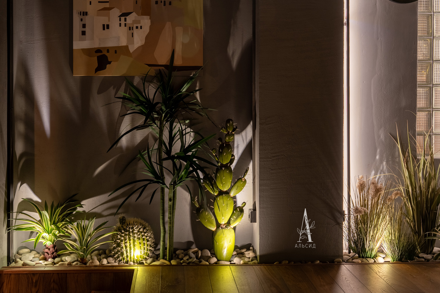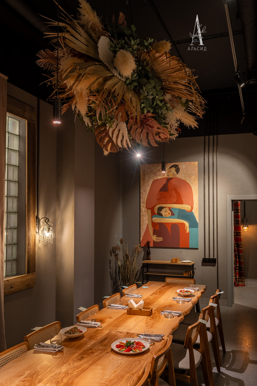 Для оформления ресторана были выбраны определенные композиции под разные стили залов. Большой подвесной букет из сухоцветов над банкетным столом было уникальным решением, которое вместе с камышом делает пространство наполненым и привлекательным. Красное и оливковое деревья правильно расставляют акценты и гармонируют с изысканой мебелью. В одном из залов собрана инсталяция с растениями пустыни - драцена, юкка, опунция, эхинокактус, формиум.;