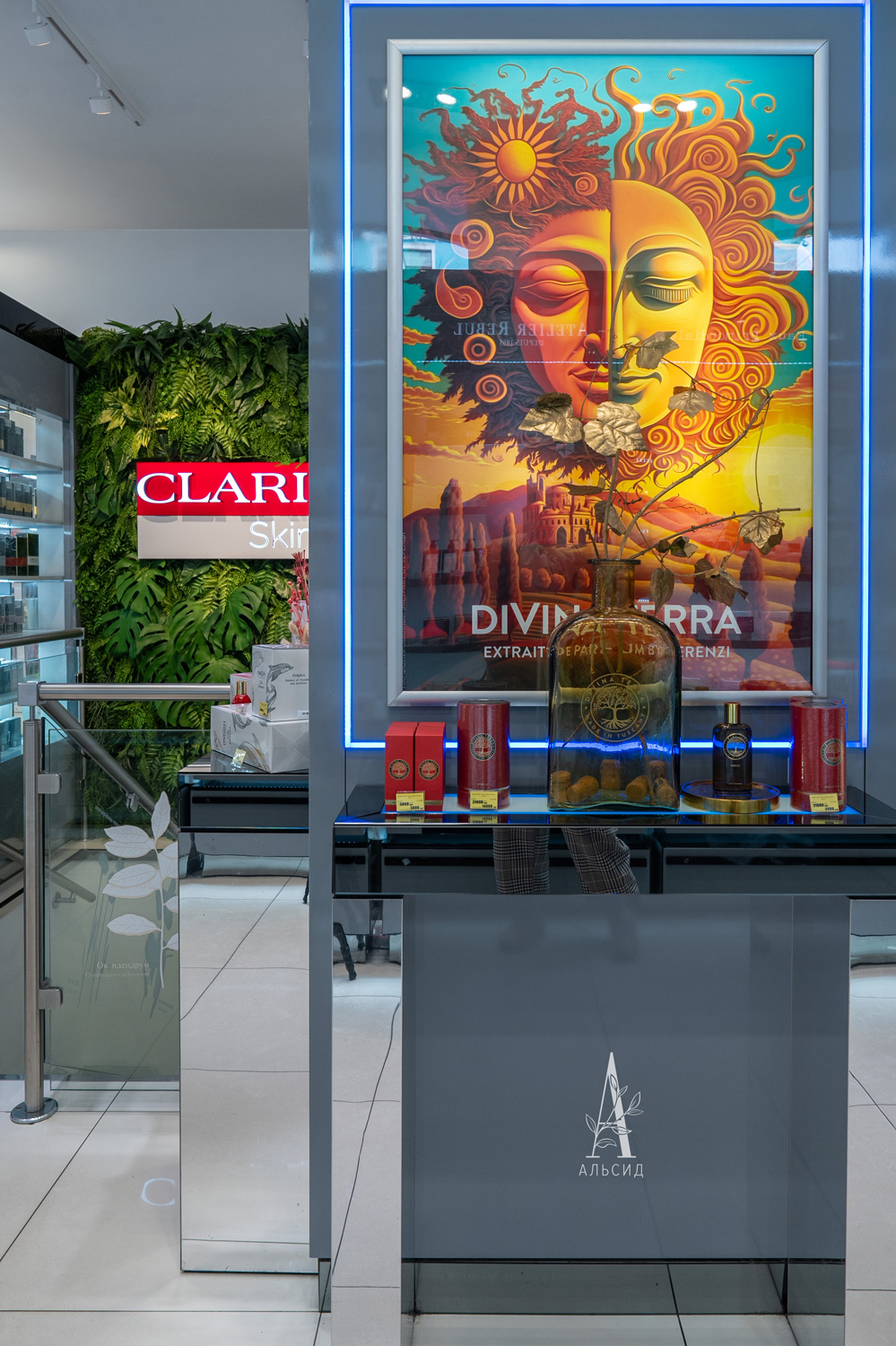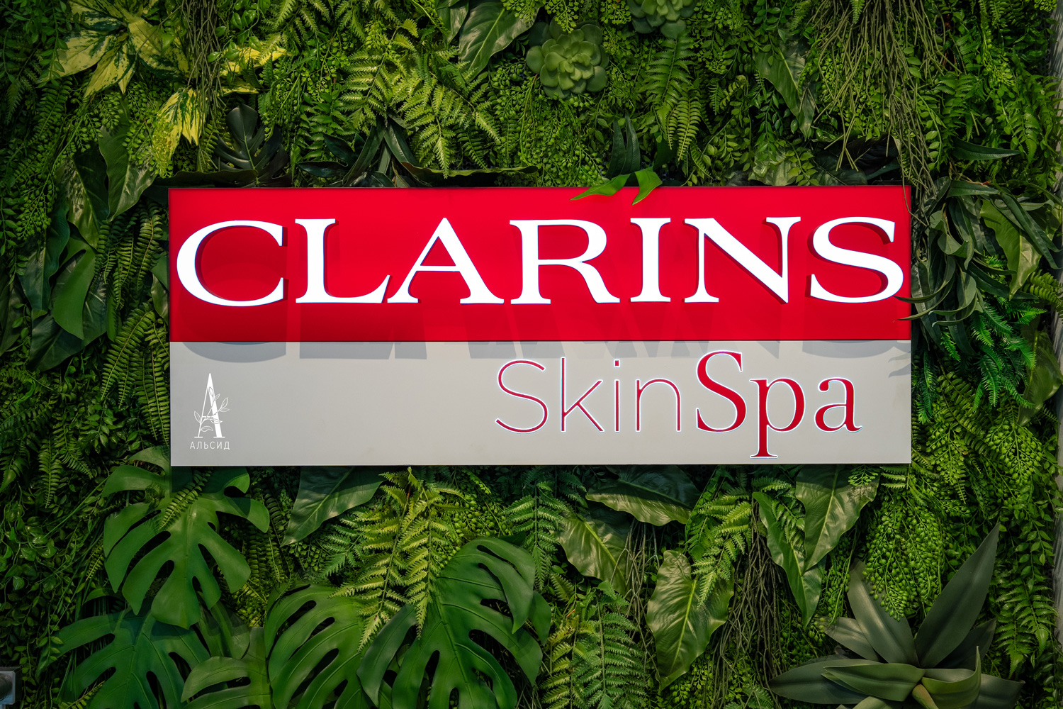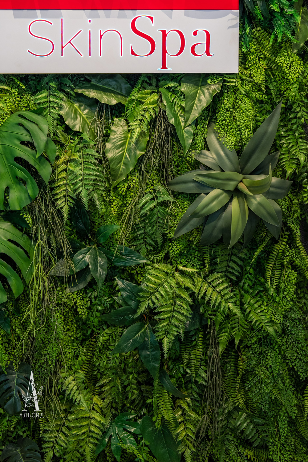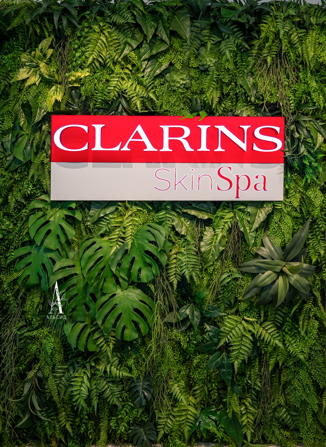 В магазине Рив Гош на Невском фитостена с тропическими растениями украшает вход в зону спа, которая расположена на ниженем этаже. Такое оформление логотипа Clarins играет роль не только декора, но и навигации по магазину. ; ;
