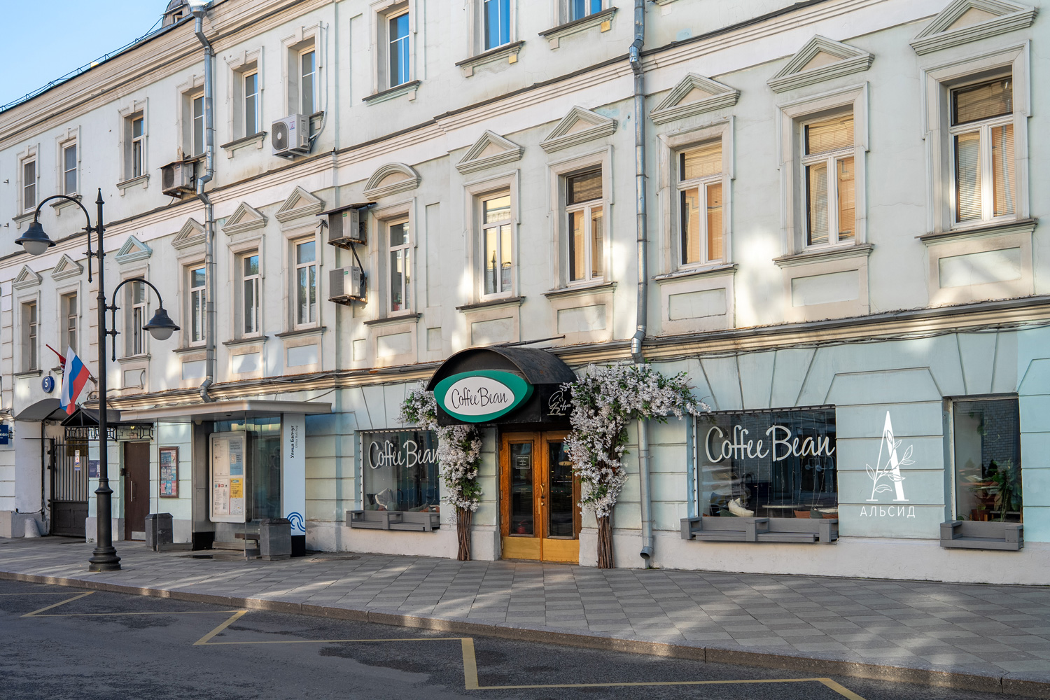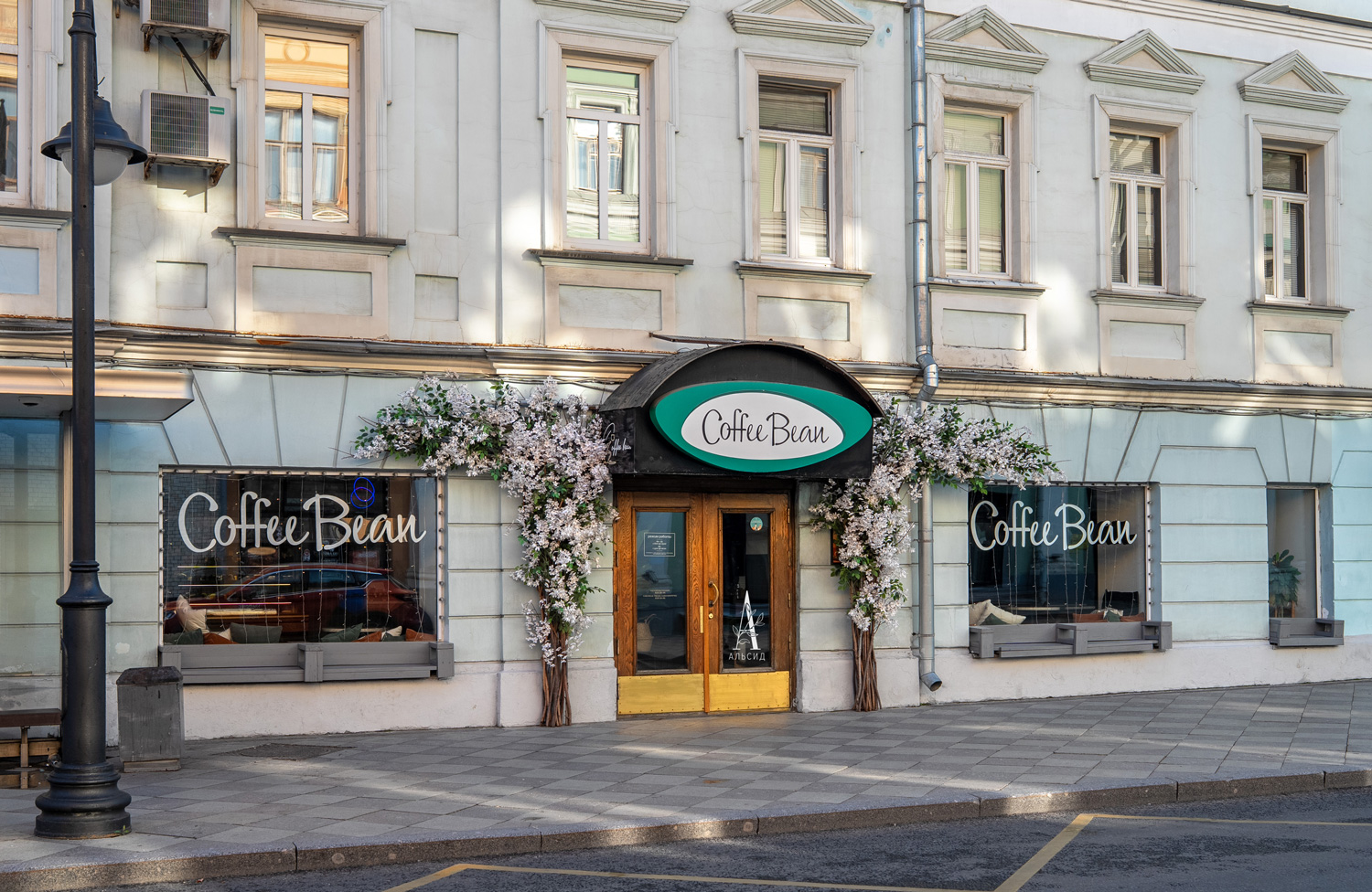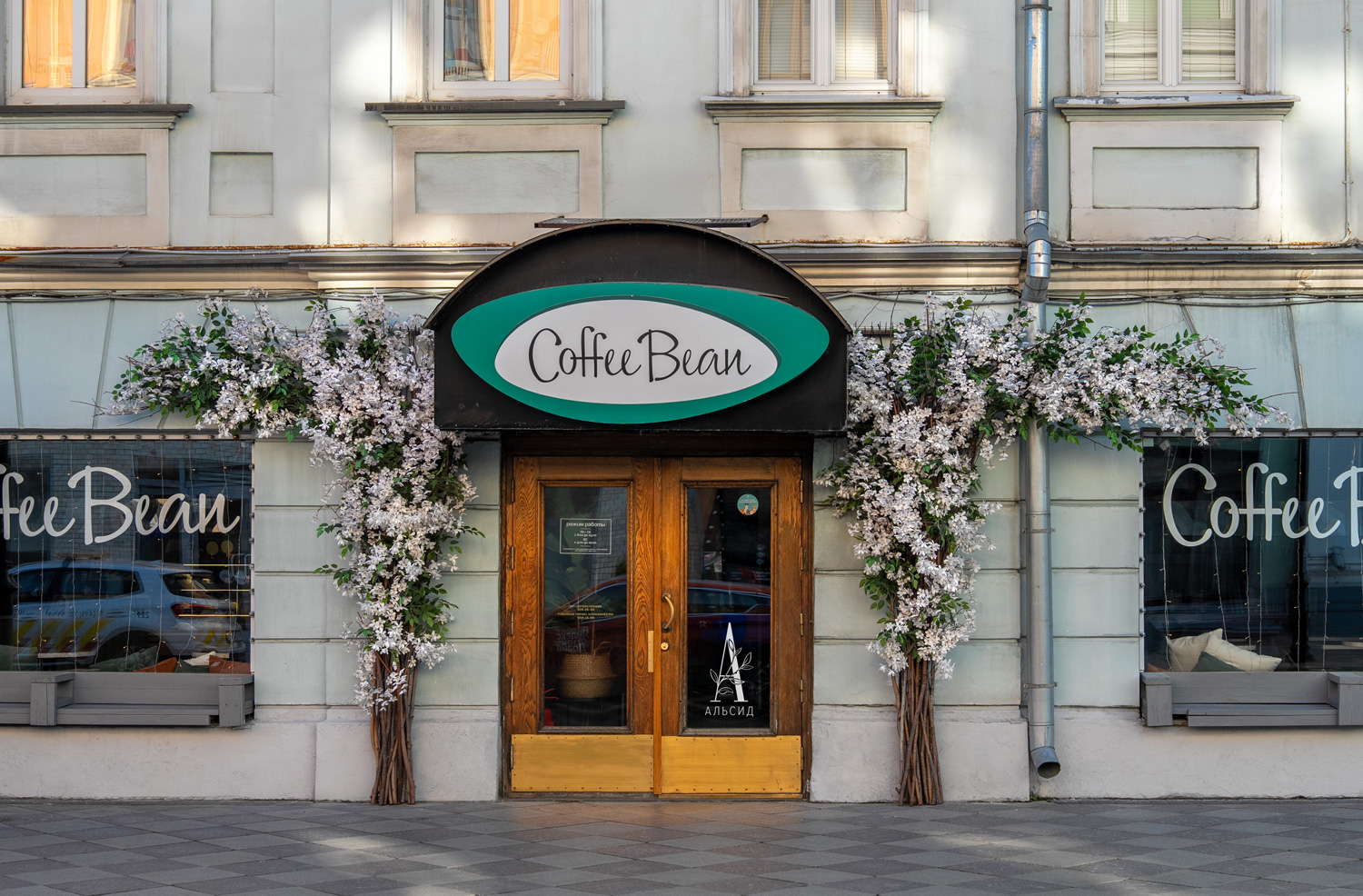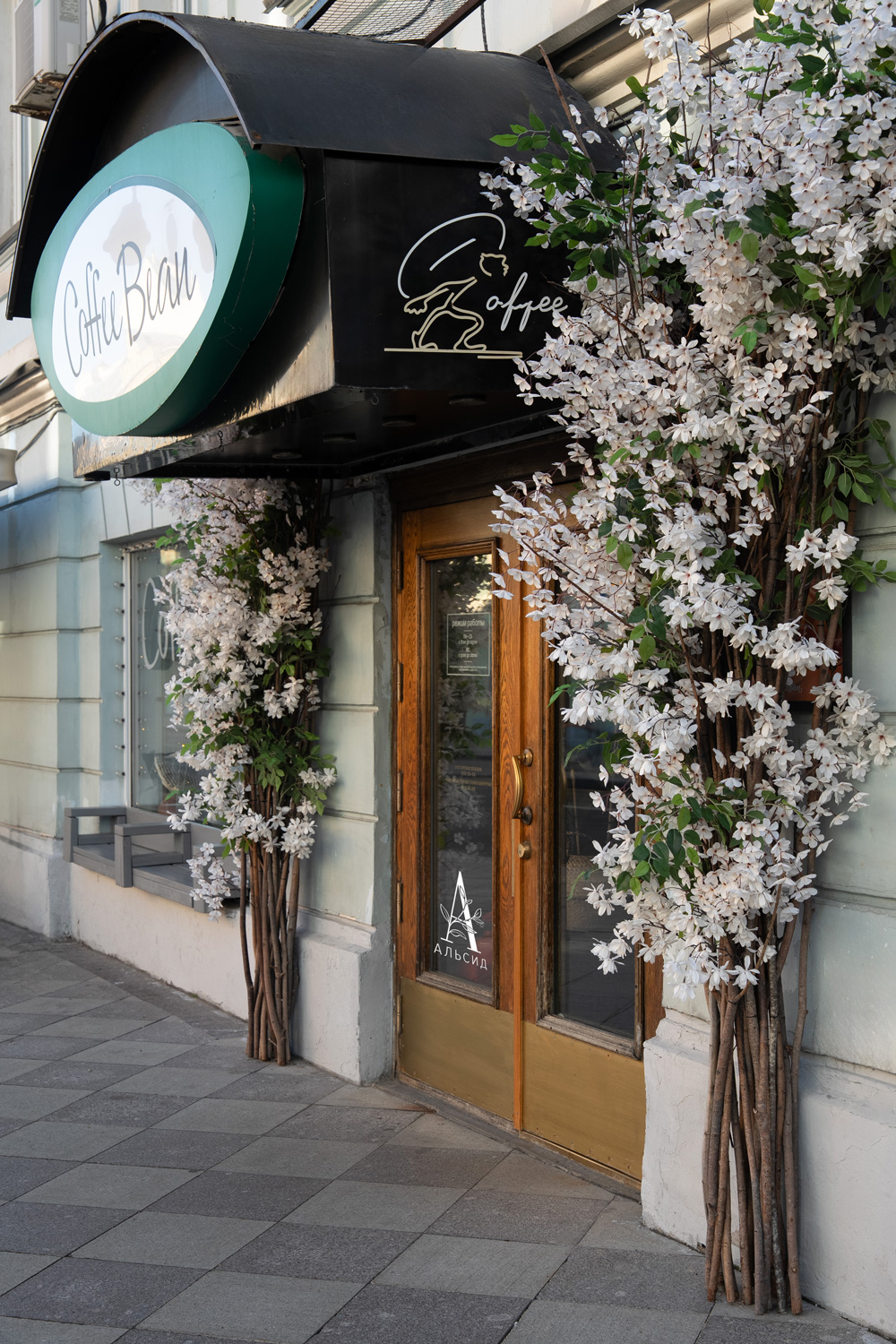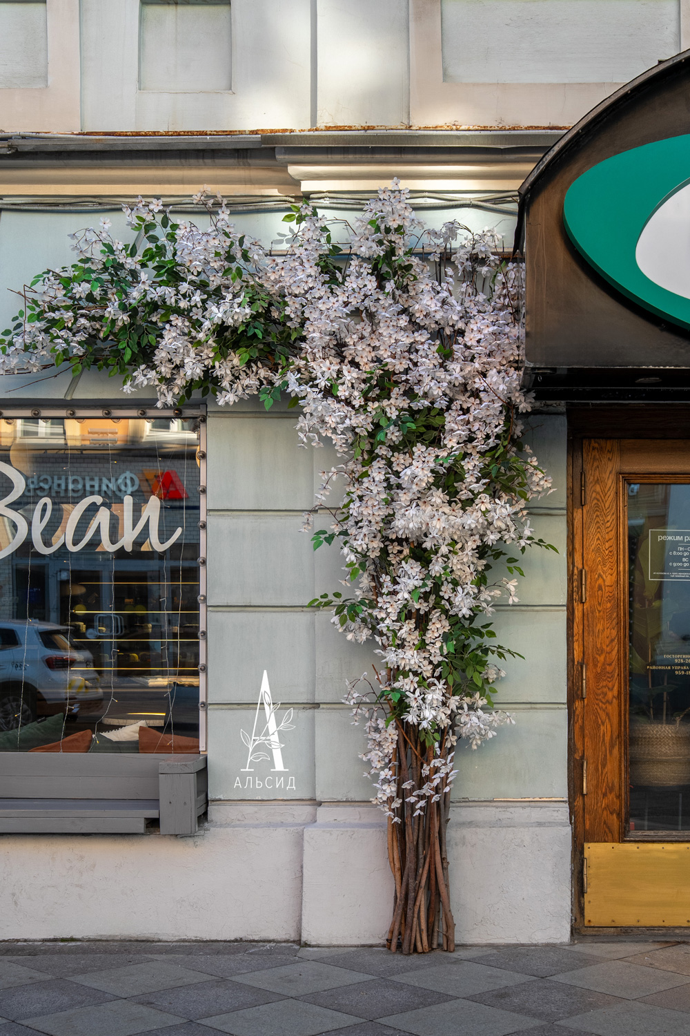 могут быть не только внутри, но и снаружи. Так мы украсили нежными цветами фасад кофейни на одной из центральных улиц Москвы.;