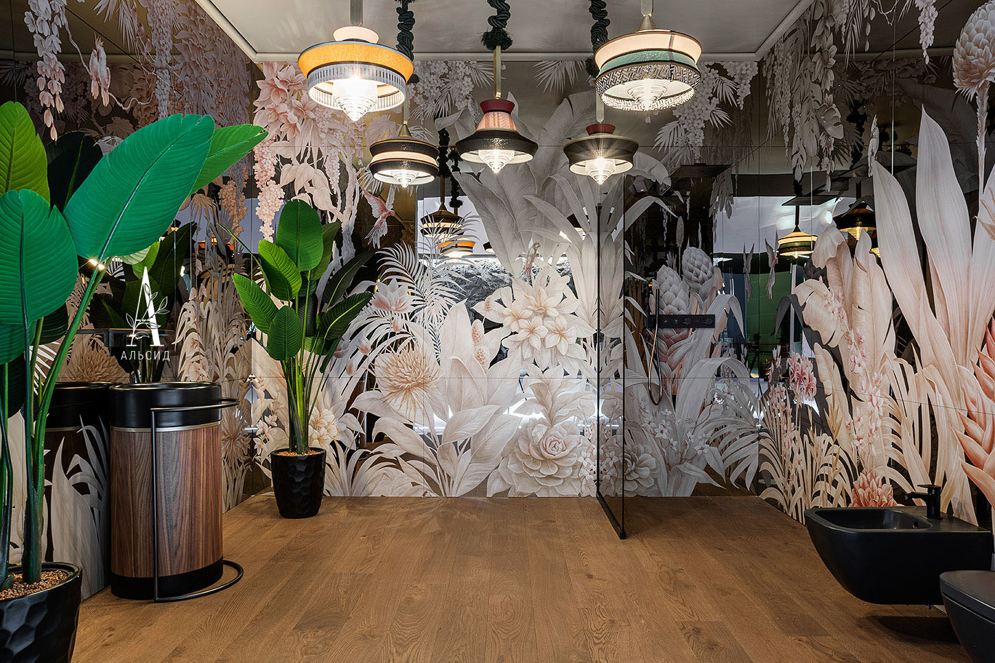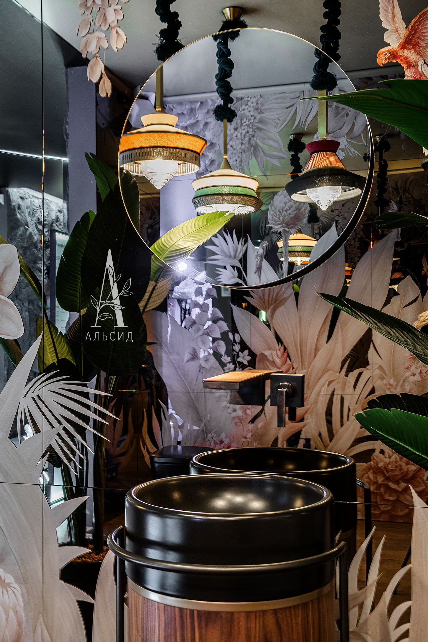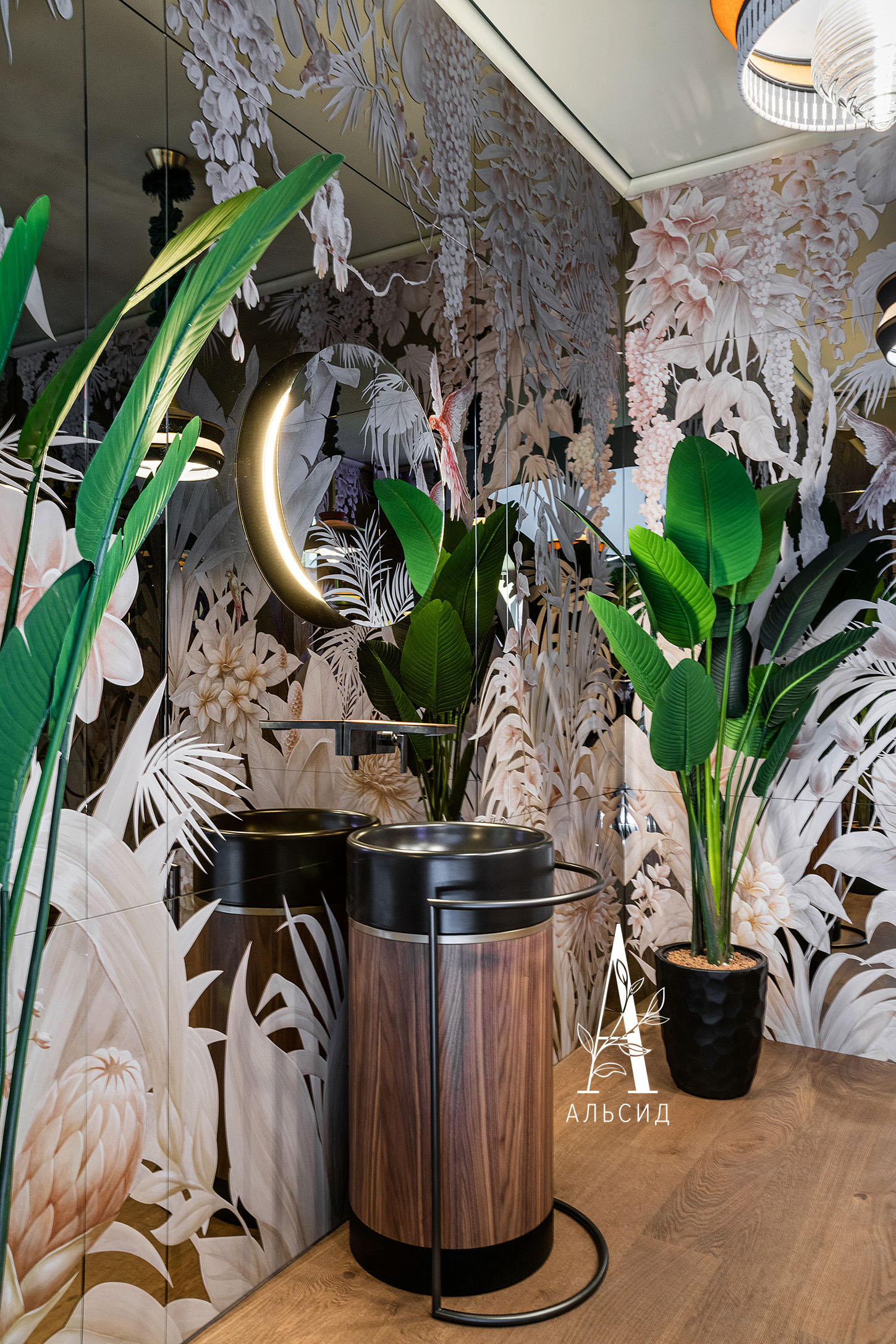 Татьяна Горшкова-дизайнер-декоратор, бессменная ведущая программы «Идеальный ремонт» на Первом канале. В её завораживающем интерьере Джунгли в санузле использованы банановые пальмы, которые дополнили и закончили образ ярким и сочным акцентом; Проект дизайнера Татьяны Горшковой.