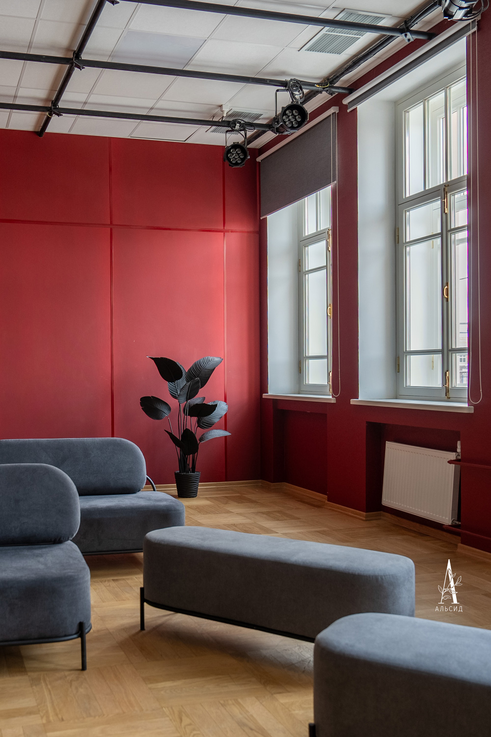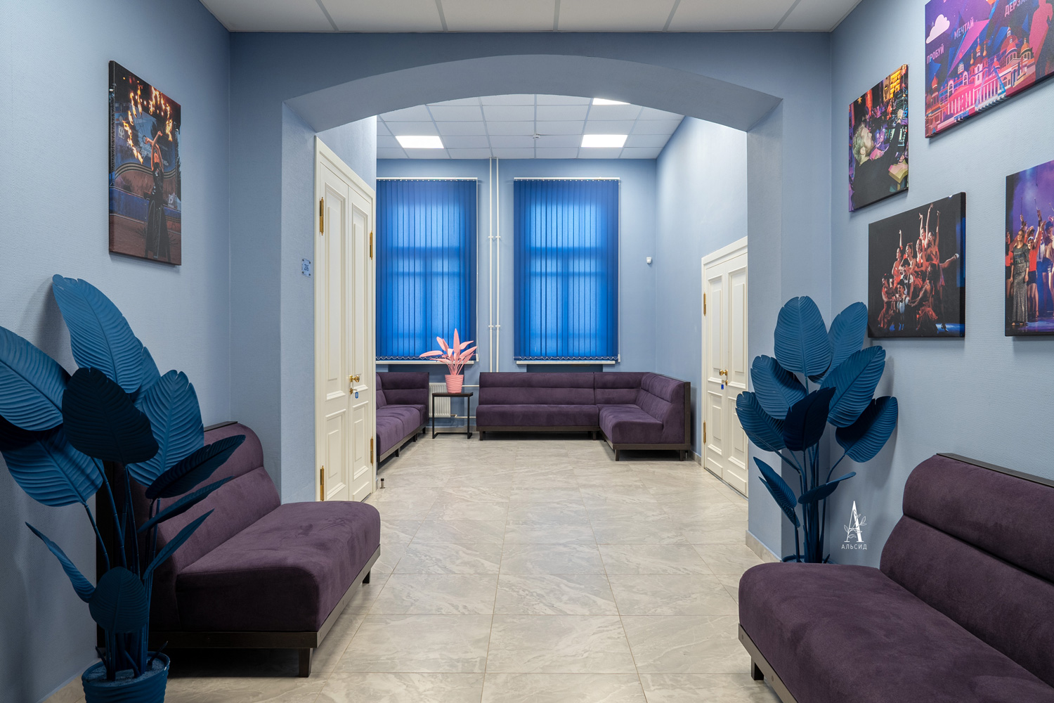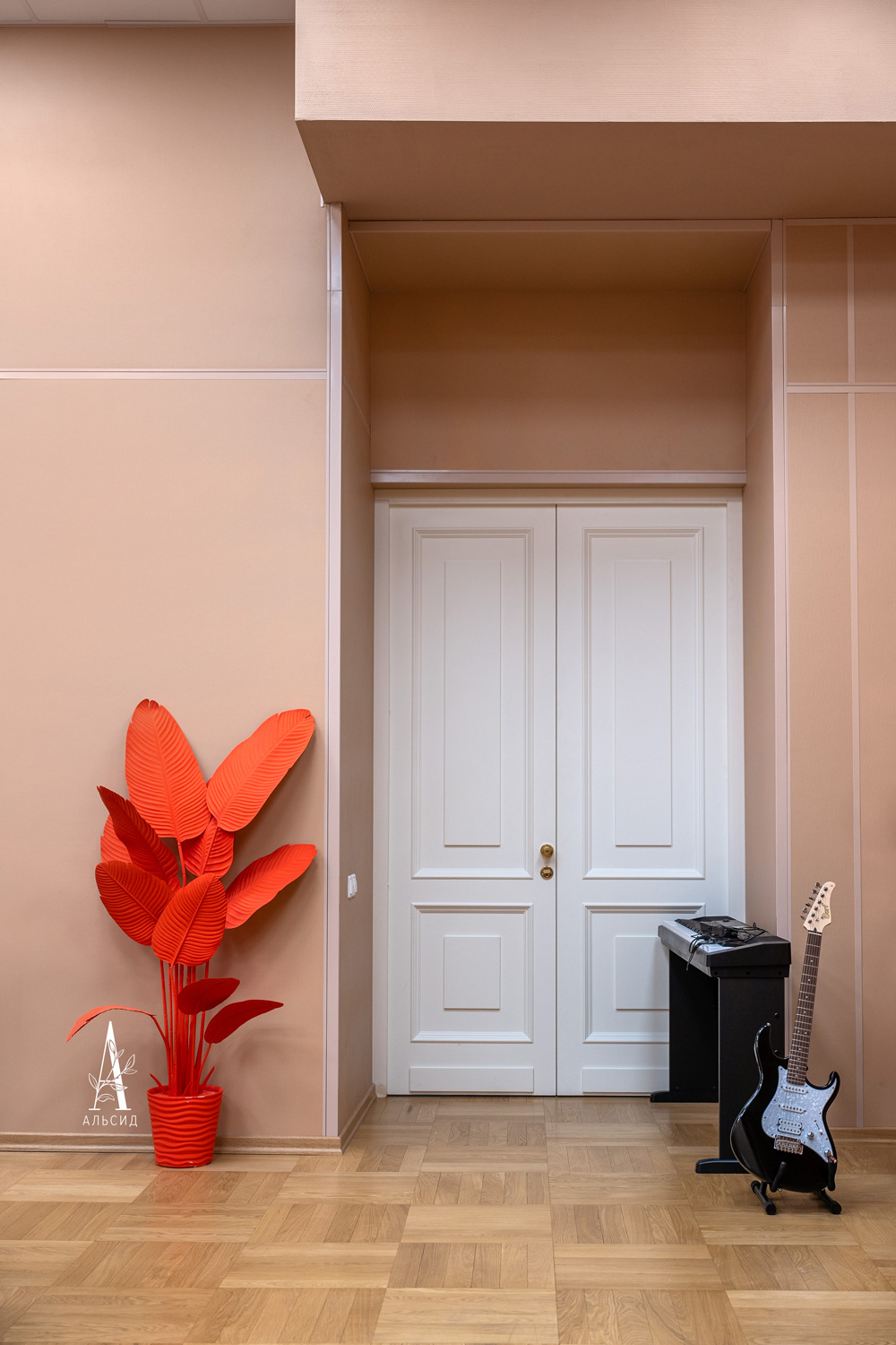 Молодежное пространство требует смелых и современных решений, поэтому для оформления интерьера Дома были выбраны искусственные растения в ярких цветах. Парадный холл и большой концертный зал обставлены цветочными композициями, а коридоры и лестница украшены самшитом с патиной и двухярустным самшитом в зоне отдыха. В творчесских классах расставлены черные, синие и оранжевые банановые пальмы, а также розовая стрелиция. ; ;