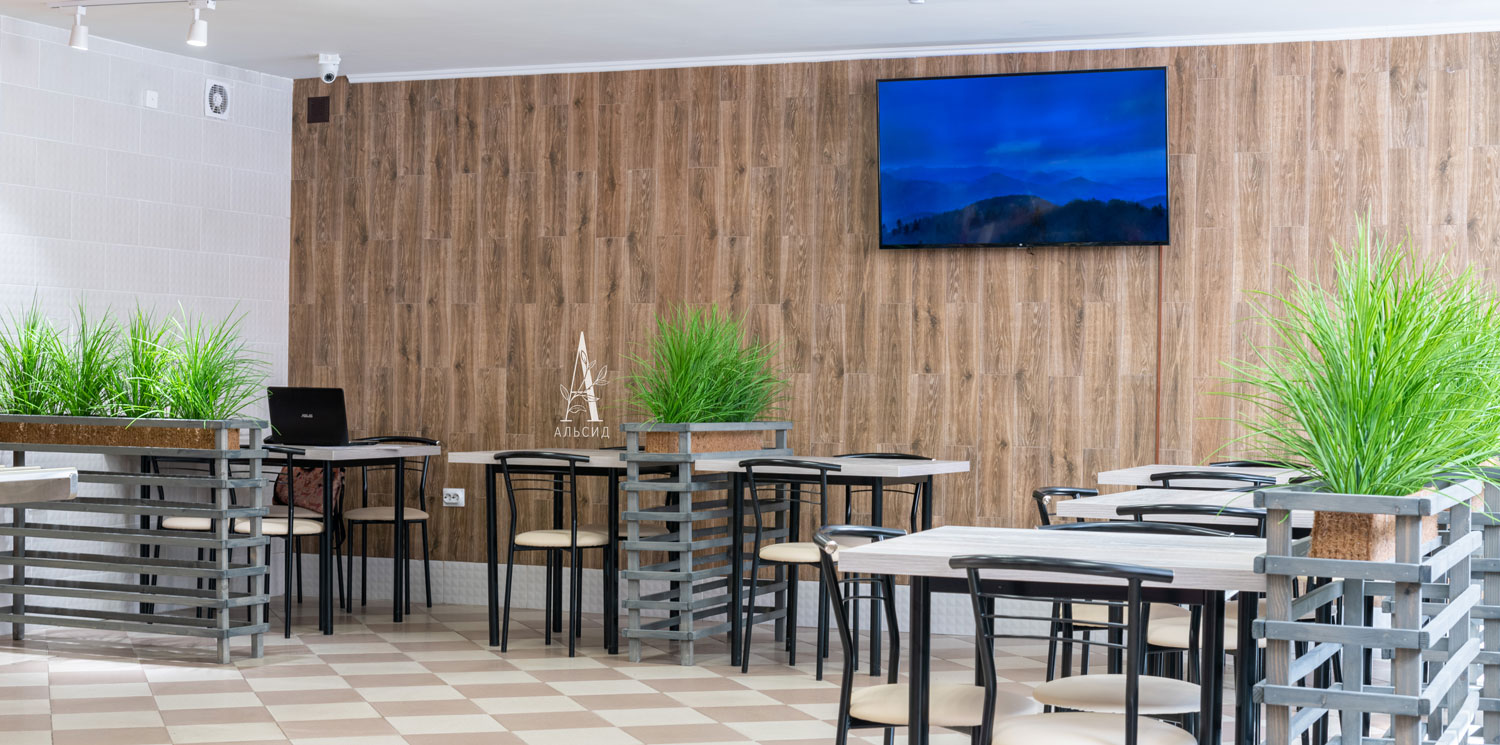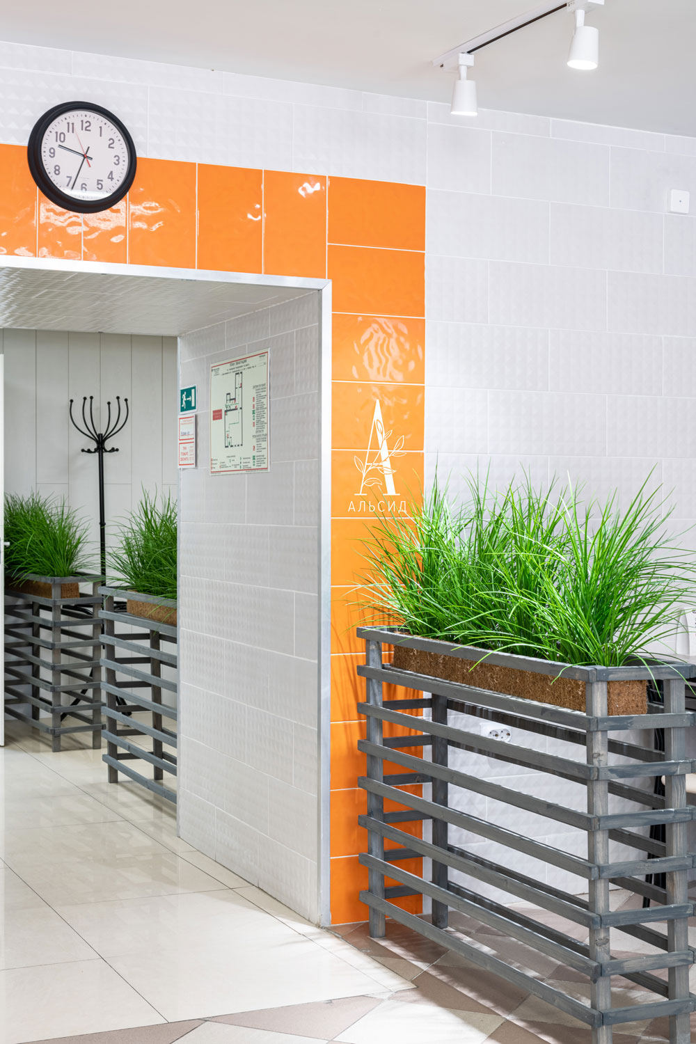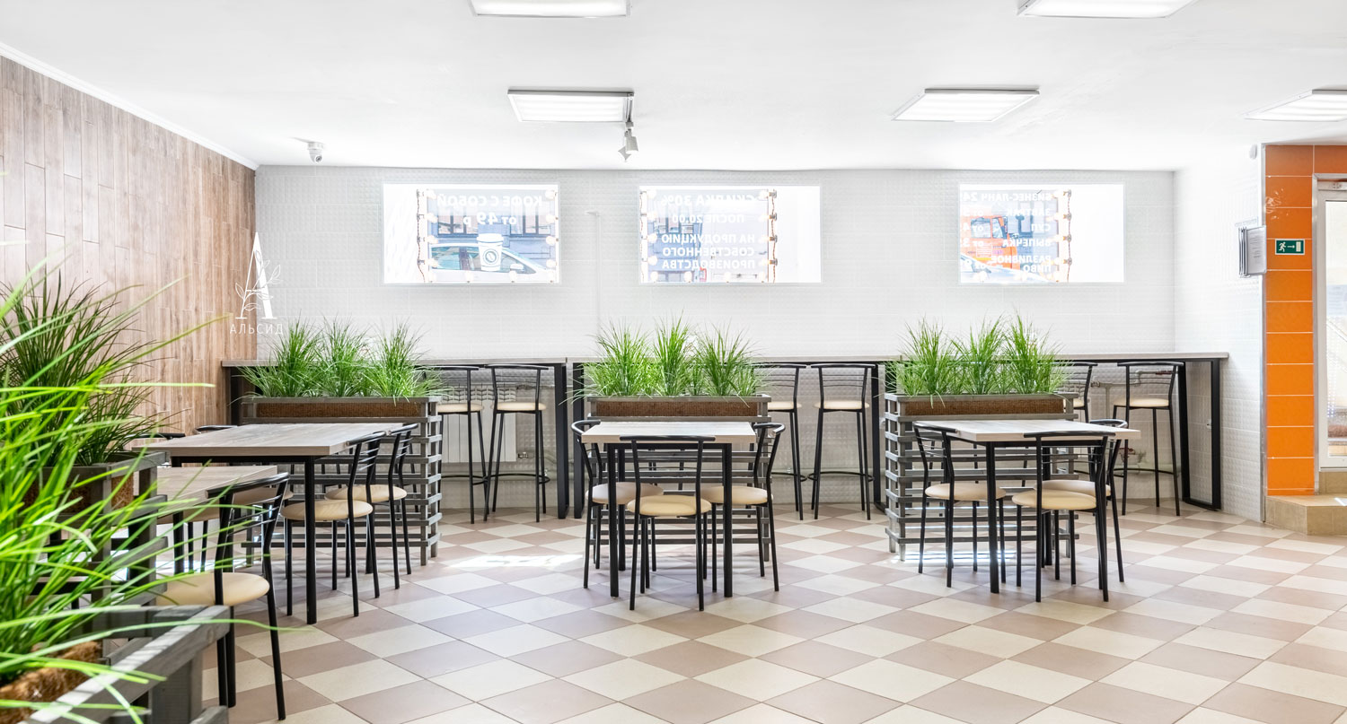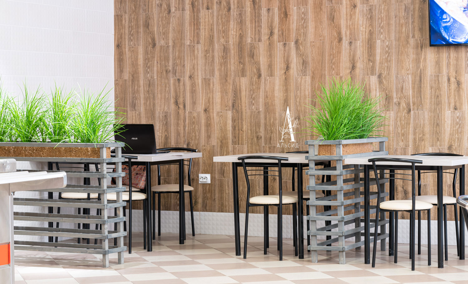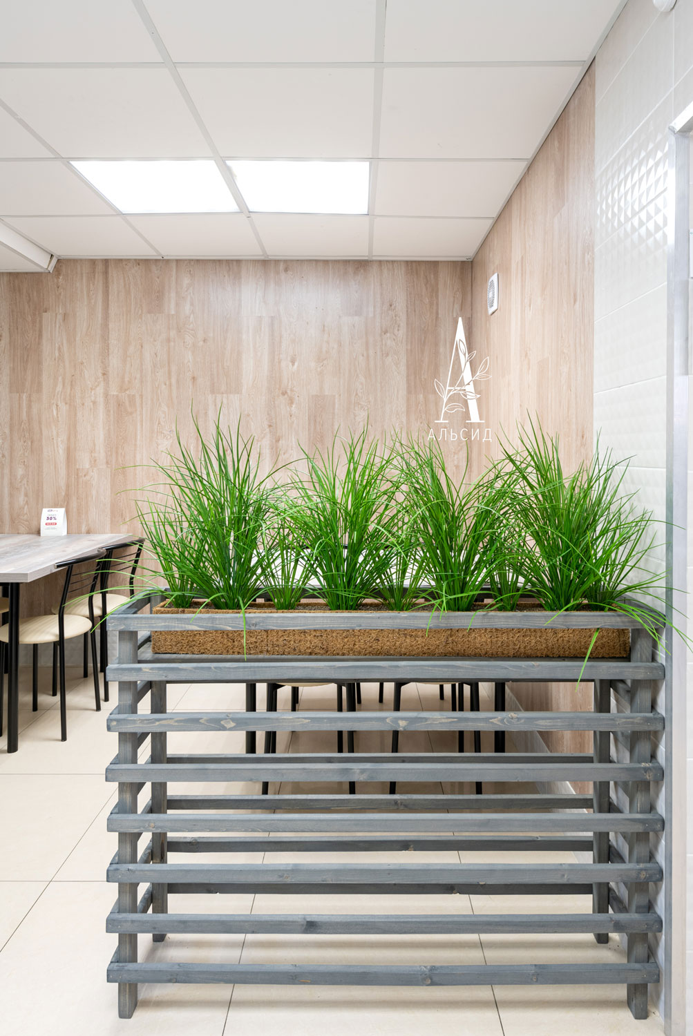 Небольшое уютное кафе в минималистичном стиле также нуждается в озеленении. Высокая трава в кокосовых боксах освежает и отлично зонирует пространство, отделяя столики друг от друга. Для таких задач чаще используют искусственные растения, т.к они совершенно не требуют ухода и выглядят всегда привлекательно.;
