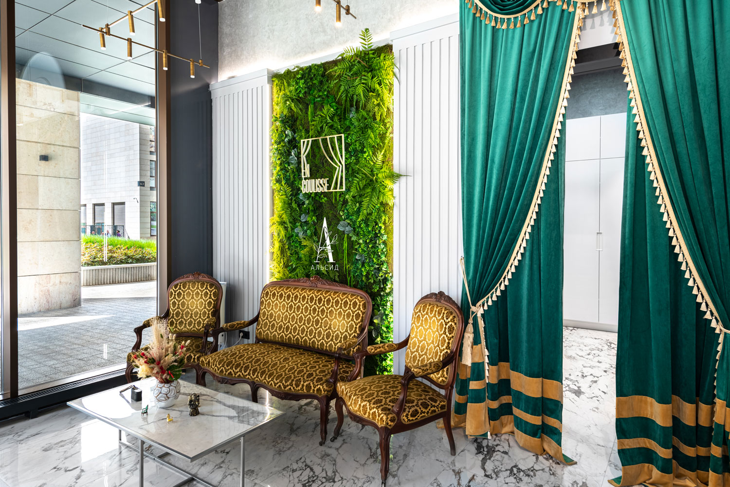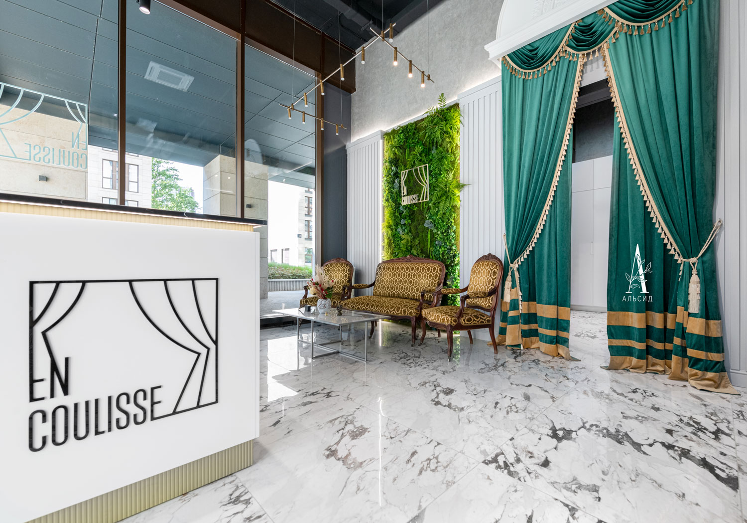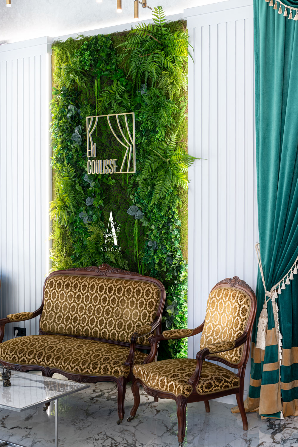 В салоне красоты было проведено озеленение согласно предоставленному дизайн-проекту: фитостена не только украшает зону решепшн, а также обрамляет логотип компании. В процедурном зале полоток оформлен лианами с ампельными растениями. ;