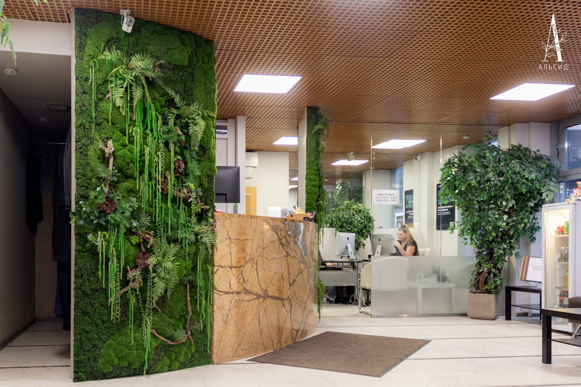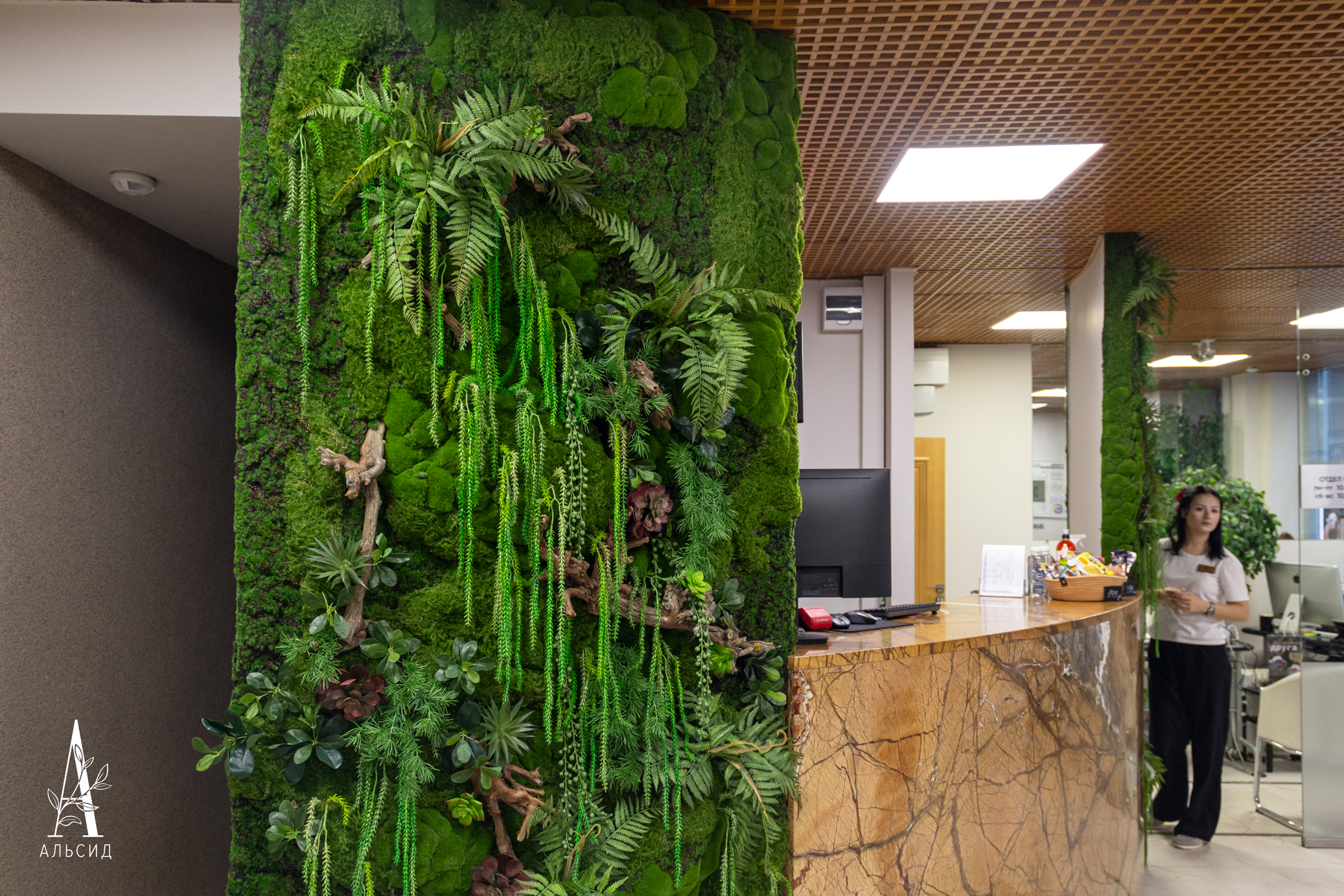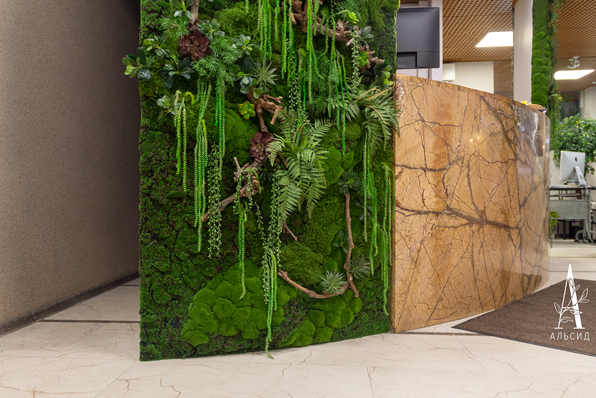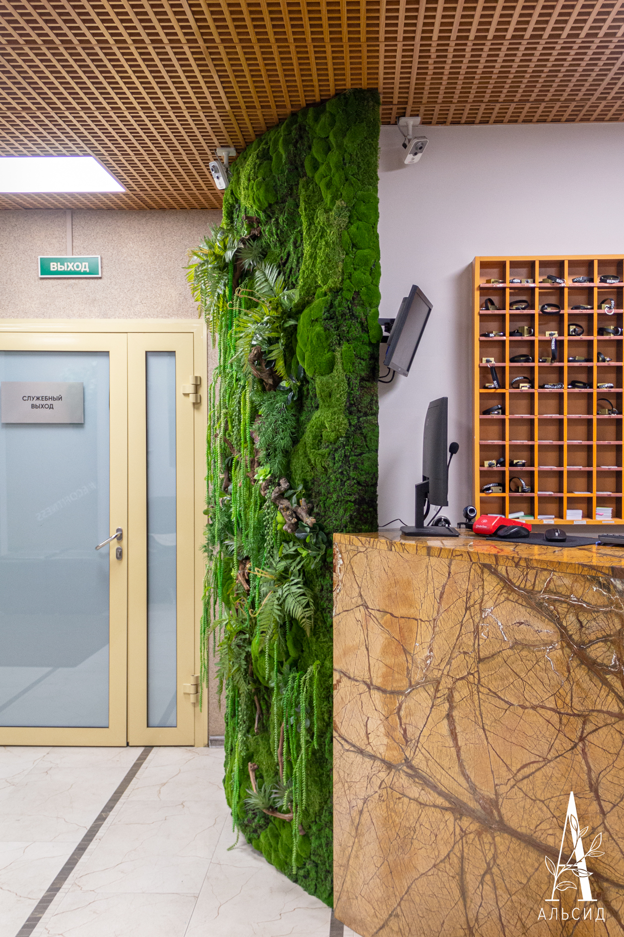 Ресепшен фитнес-клуба обрамляют два фитомодуля со мхом, суккулентами и ампельными растениями. Натуральные коряги в сочетании с разными видами мха создают ощущение настоящей зелёной поляны. Такое оформление прекрасно сочетается с мраморной текстурой стойки и является подтвержением того, что эко-дизайн ещё надолго останется трендом в интерьерном озеленении.;