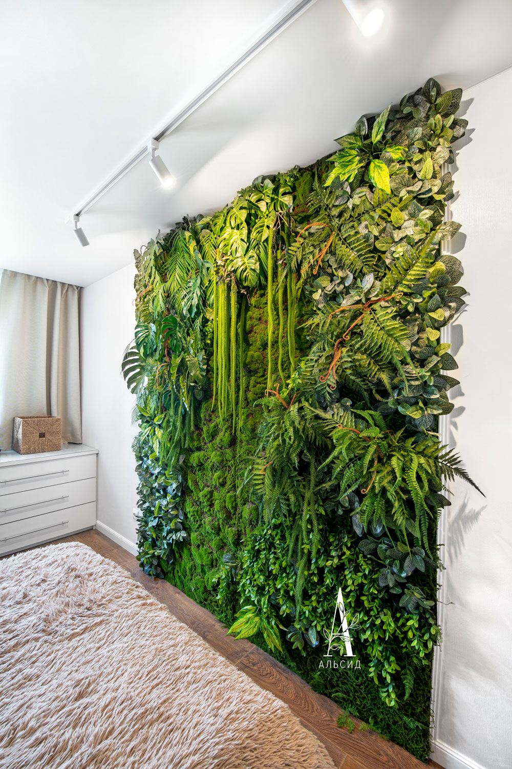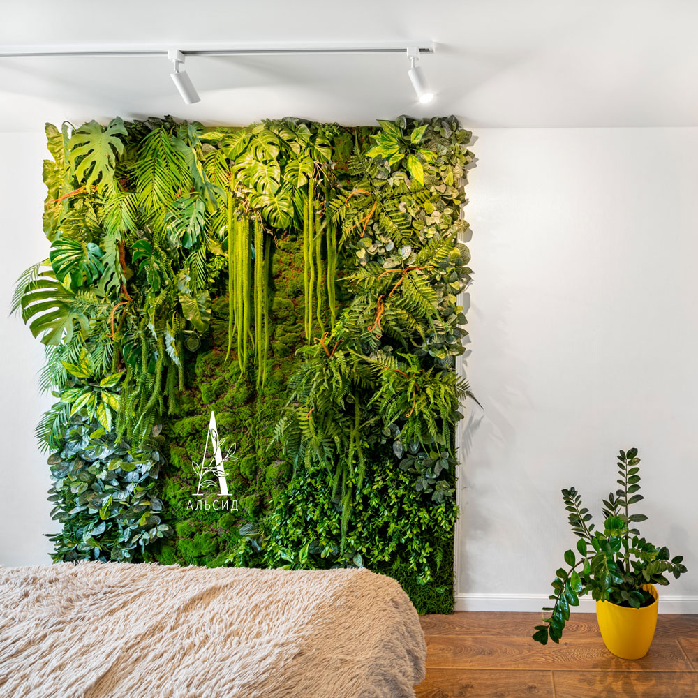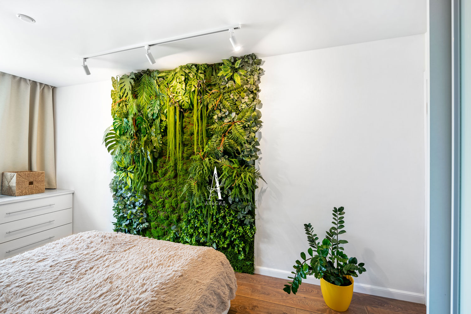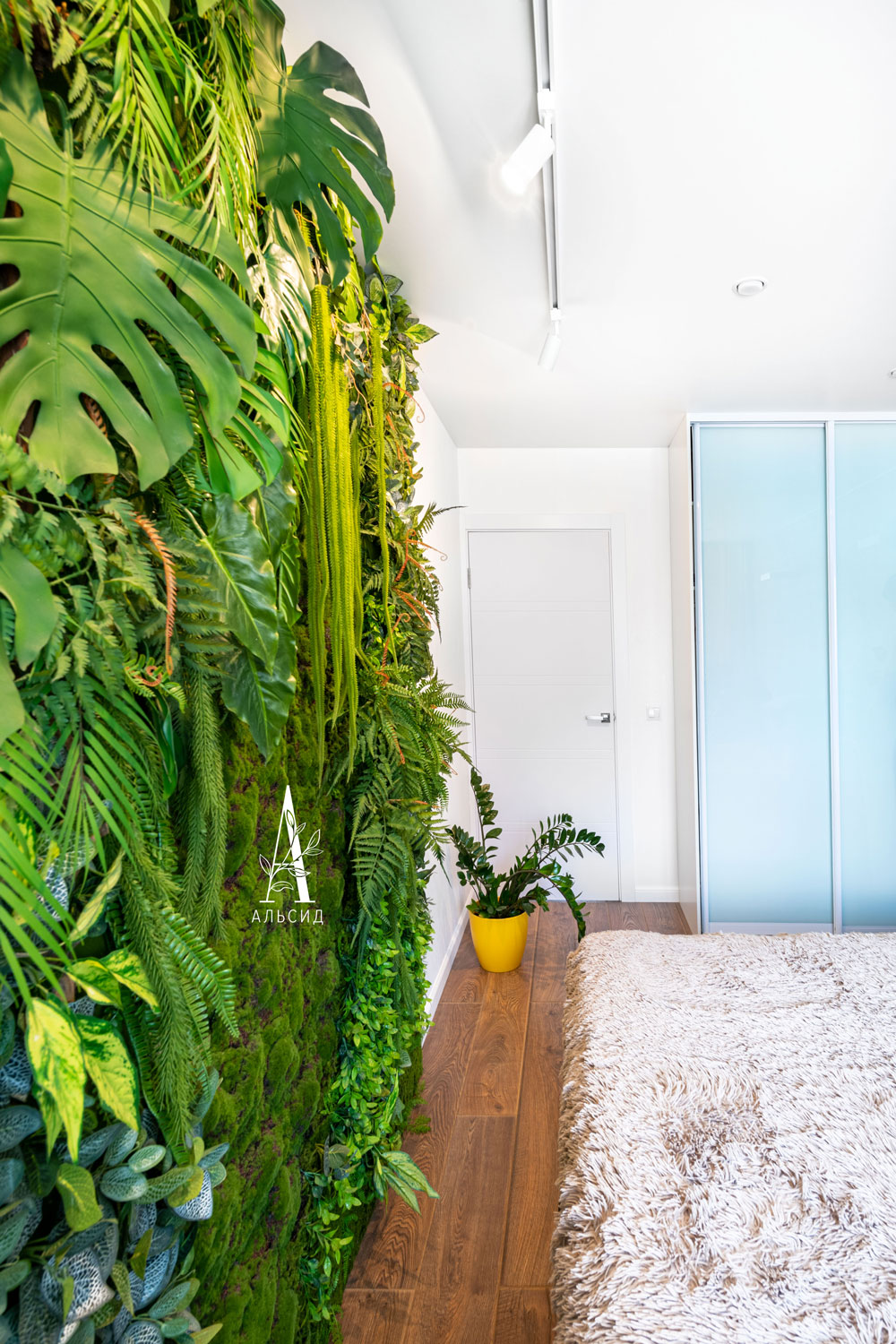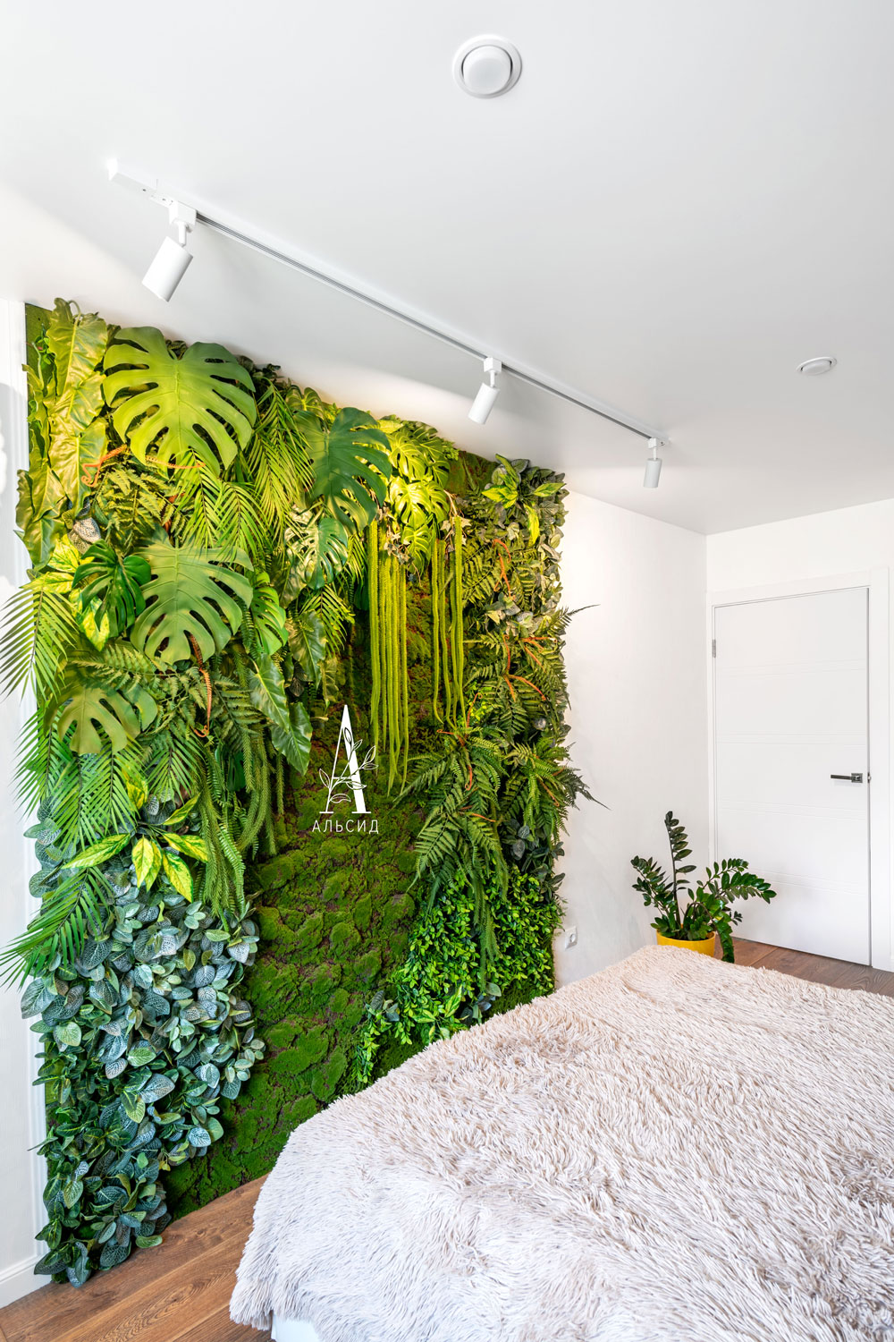 В последнее время оформление искусственными растениями все чаще приходит не только в коммерческие помещения, но и в частные дома и квартиры. Людям важно создавать вокруг себя приятные и комфортные условия, особенно в период пандемии, когда удаленная работа стала необходимостью.; Минималистичный дизайн комнаты отлично подчеркивает тропическую фитостену и создает лаконичное сочетание и правильную композицию. ;