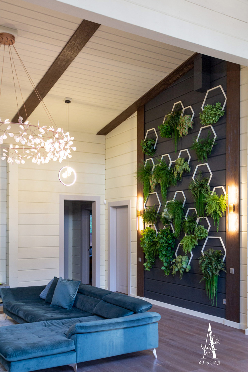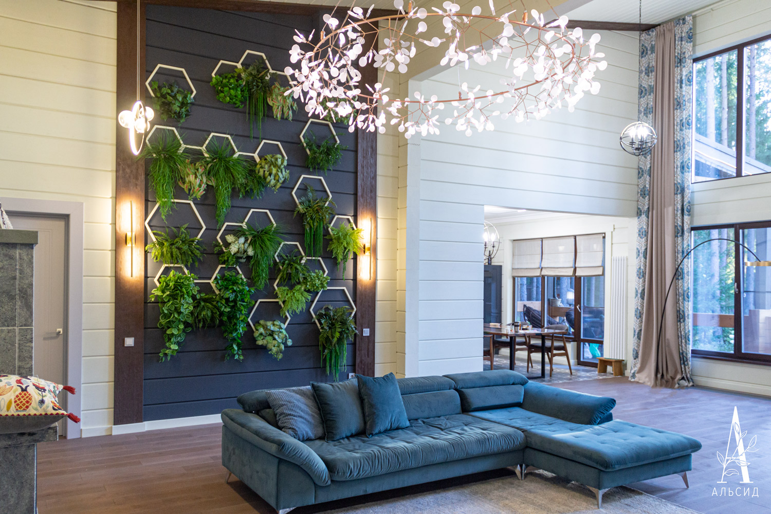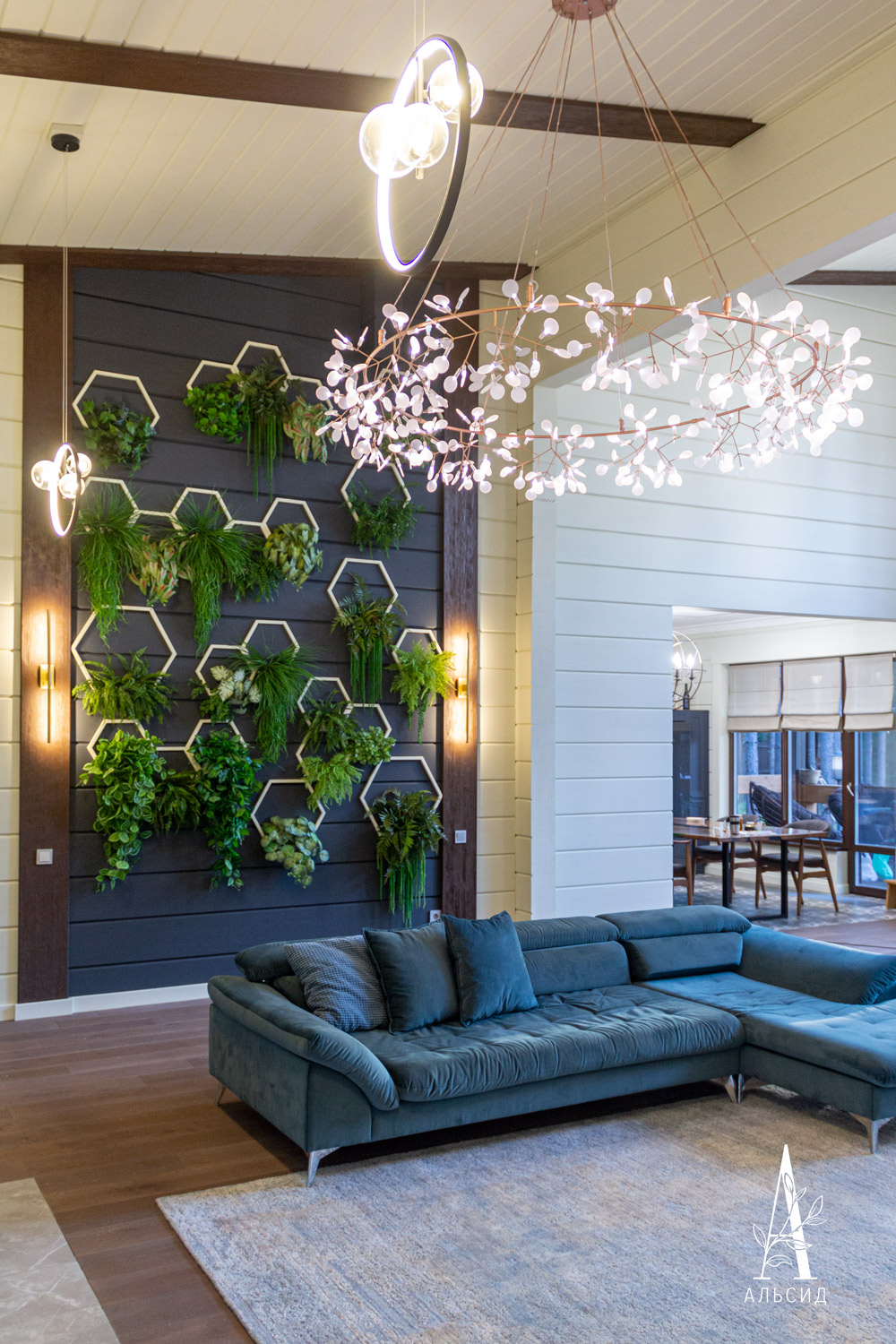 Стильный и самодостаточный интерьер частного дома преобразился при помощи фитостены из сот с искусственными растениями, расположенными на акцентной стене гостинной по определенной схеме. Такой вариант озеленения не утяжеляет пространство, а ампельные зеленые растения добавляют воздуха в композицию. Деревянные рамы сот окрашены в контрастный стене цвет, что выделяет их и позволяет любоваться обновленным интерьером как в гостинной, так и сквозь большие панорамные окна. Подсветка добавляет озеленению особого шарма, растения, подсвечиваясь, выглядят словно настоящие.;