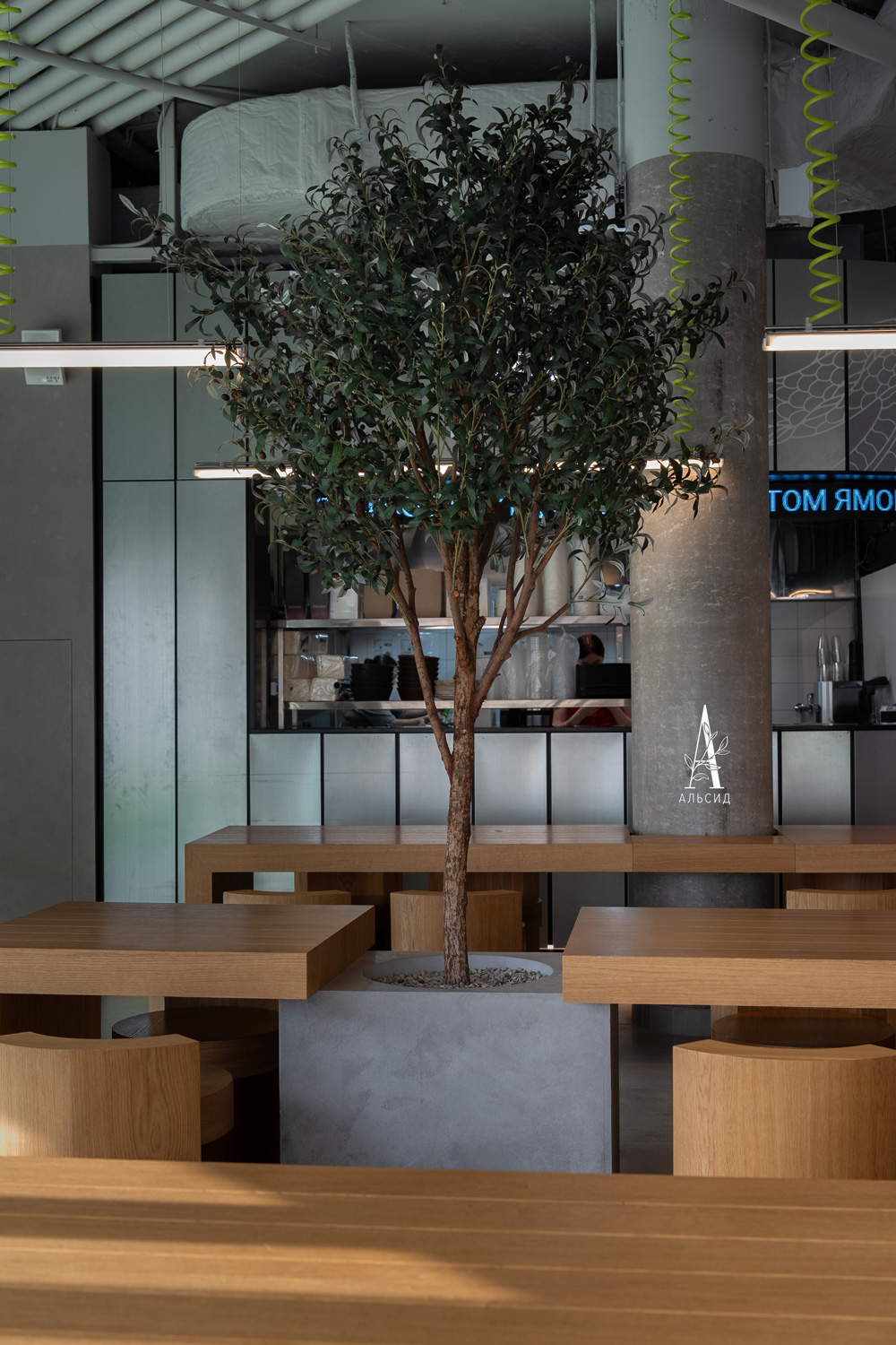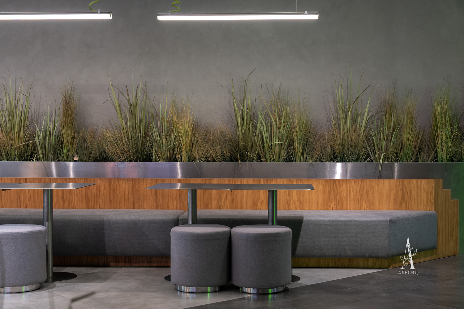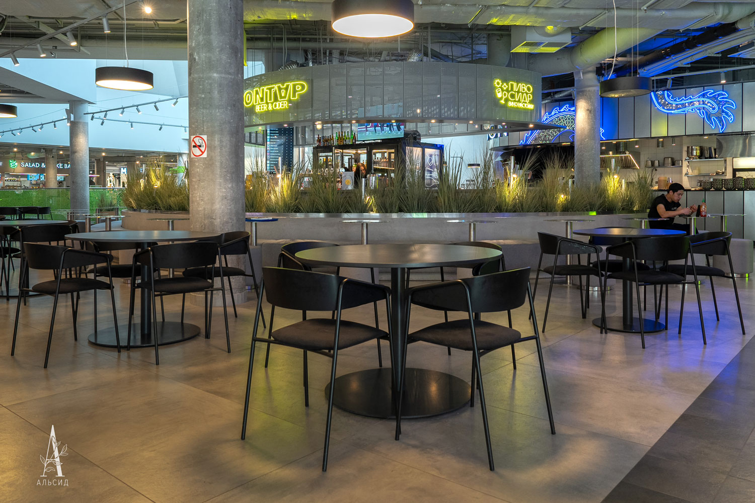 Концепция торгового центра включала в себя "поесть в парке в любое время года". Так в зоне ресторанов воспроизвели полноценный парк с высокими оливковыми деревьями, кустарниками с камышами и травой осокой. ;