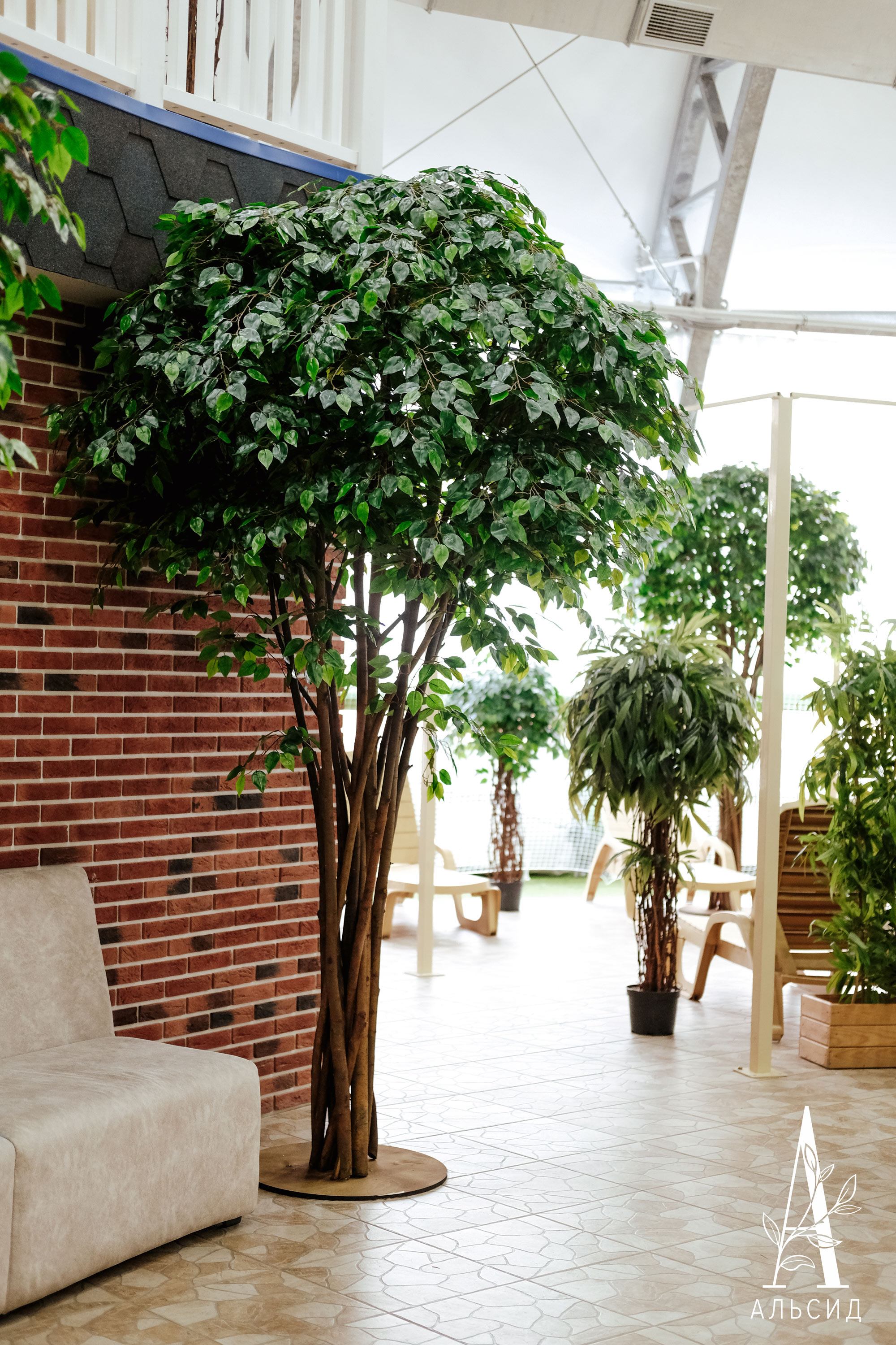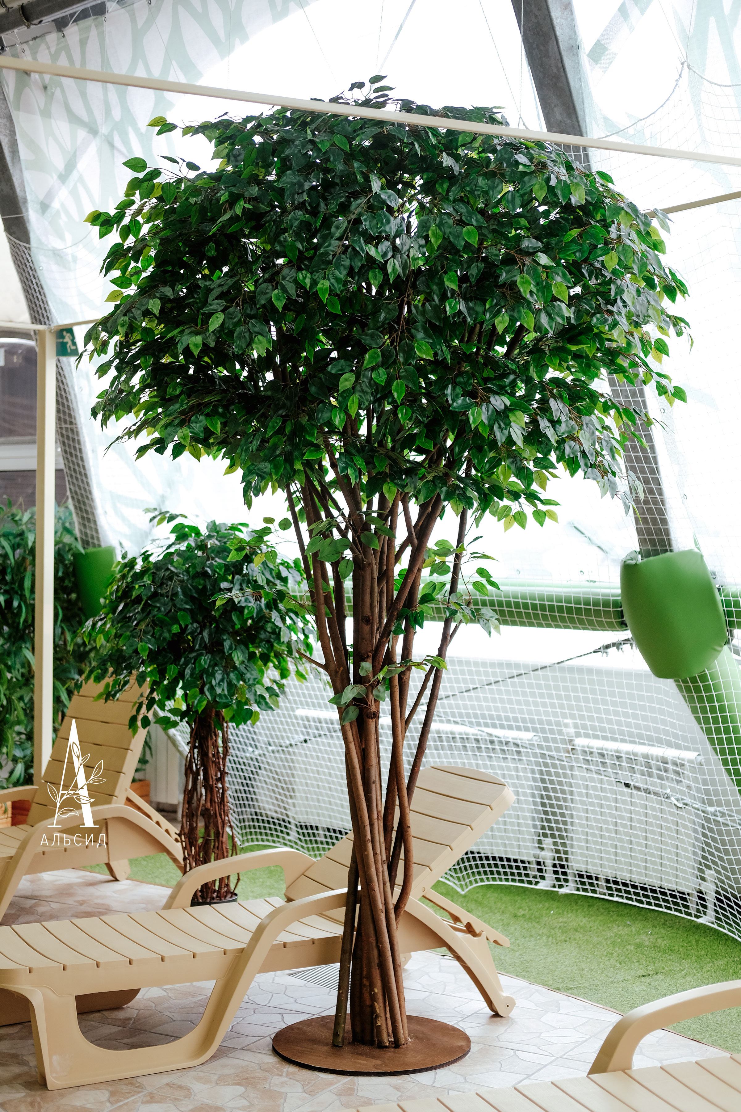 Комплексное озеленение добавляет загородным домам отдыха большей привлекательности и позволяет клиентам в зонах релакса среди зелени и прохладительных напитков отдохнуть не только душой, но и телом. Фикусы-крупномеры соседствуют с фикусами со стволами из виноградной лозы и лонгифолиями рядом с шезлонгами, а воздушная ивовая лиана украшает декоративный навес над баром. Взгляд притягивает и арка с искусственной хедерой, обрамляющая проход между помещениями, а яркие фитокартины (фитокартина с амарантом и фитокартина с папоротником) с тропическими листьями дополняют интерьер кафетерия. Завершает комплексное озеленение нестандартная фитостена ассиметричной формы, являющаяся частью зеркала.;